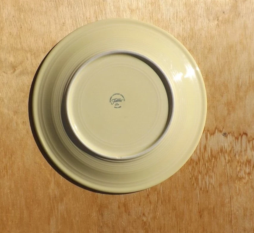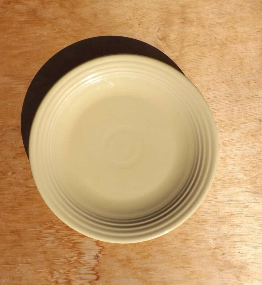 bright yellow.....semi gloss finish....measures 11.75 inches or 11 3/4 inches.......large plate.......use as a charger or to serve cook meats (not recommended to cut on) as well as large meals.......