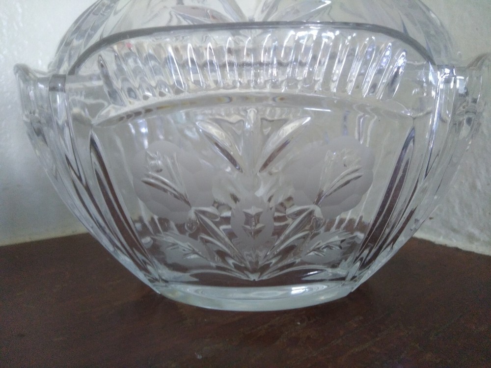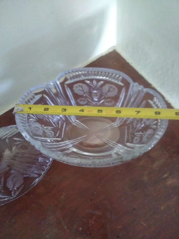 Pattern:FloralVintage:YesItem Height:8inNumber of Items in Set:2Production Style:Elegant GlassOriginal/Licensed Reproduction:OriginalShape:OvalFeatures:Decorative, Lid IncludedMaterial:GlassBrand:UnmarkedColor:ClearFinish:GlossyItem Width:8.25inType:Candy Dish