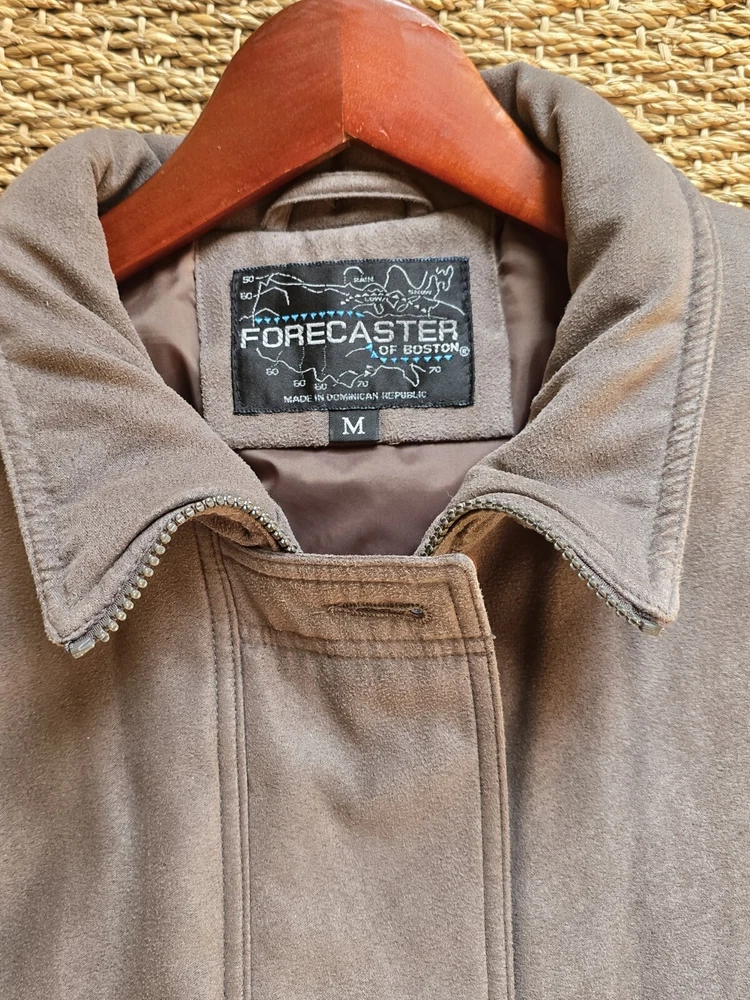 This vintage Forecaster coat in beige is a must-have for any fashion-forward woman. Made with polyester, it features a hood and is sized as a medium. This overcoat is perfect for any occasion and will keep you warm in style. The coat is missing a hood, but that does not take away from its overall look. It is a great addition to any wardrobe and is perfect for those who love vintage style.