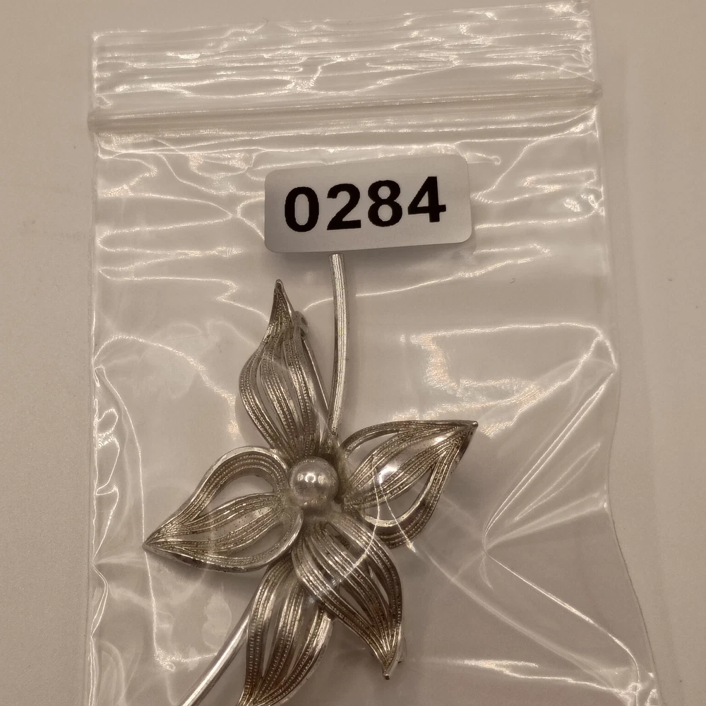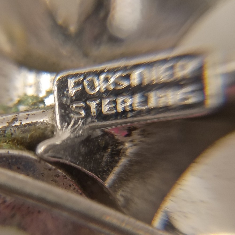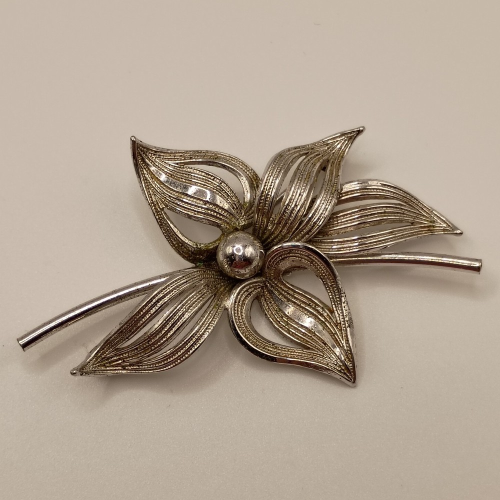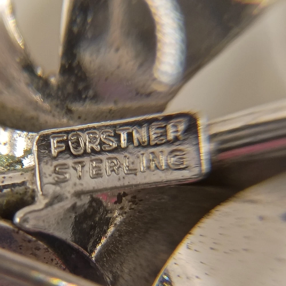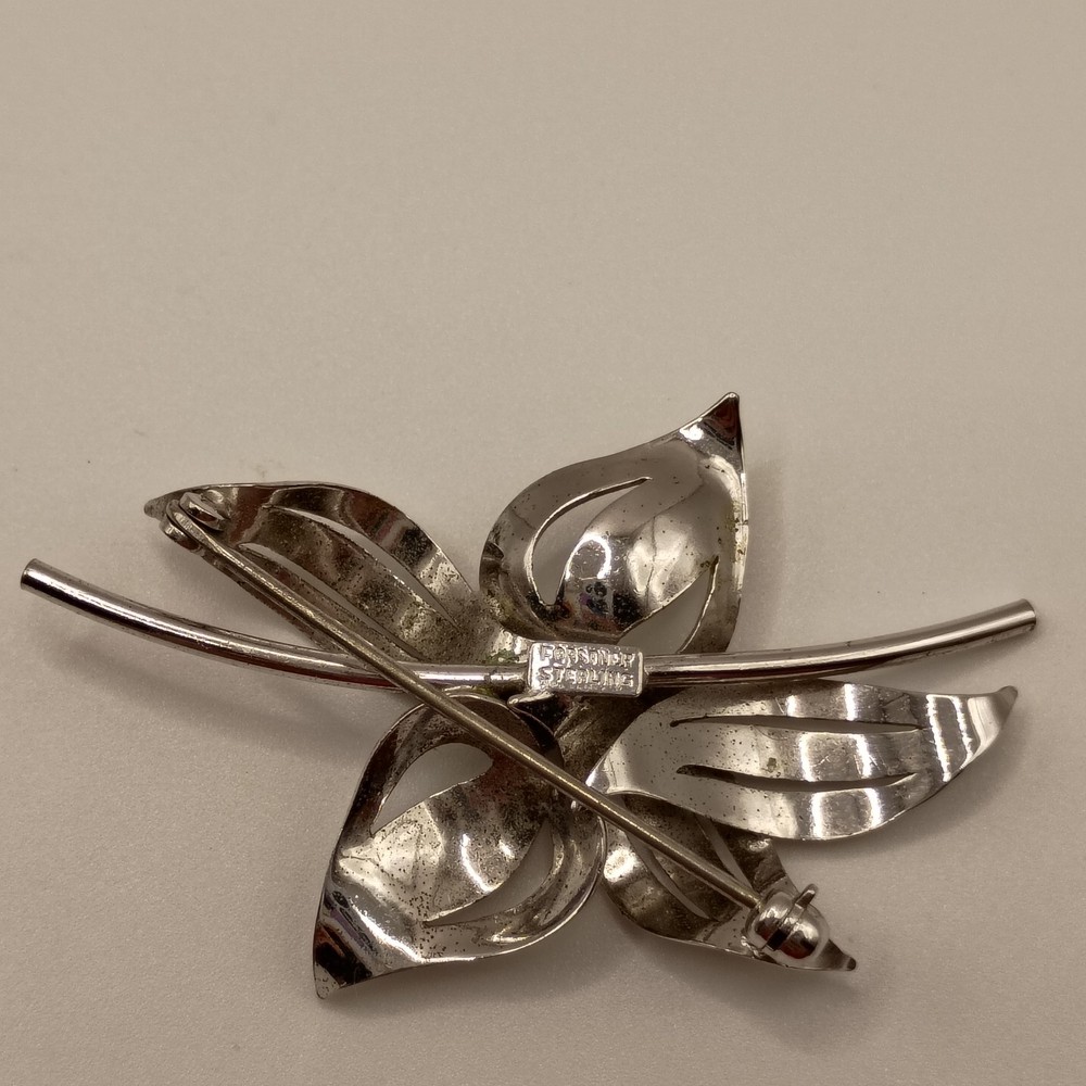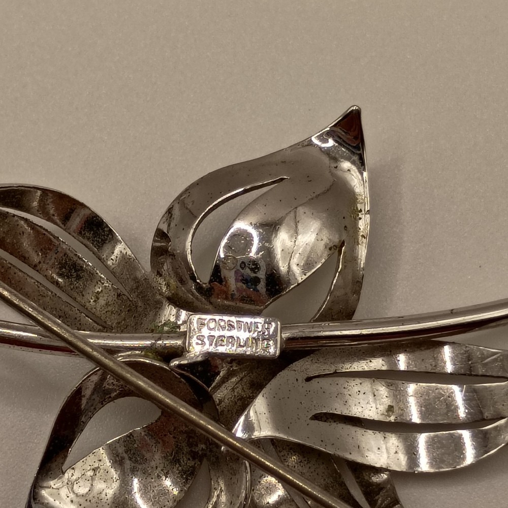 This is an elegant Vintage pin crafted from Sterling Silver by the renowned maker Forstner. The design features a beautiful open-work, filigree flower with finely detailed wire petals and a polished silver ball at the center. A classic example of Mid-Century Modern jewelry design, perfect for collectors of quality Forstner pieces and sterling silver floral accessories.