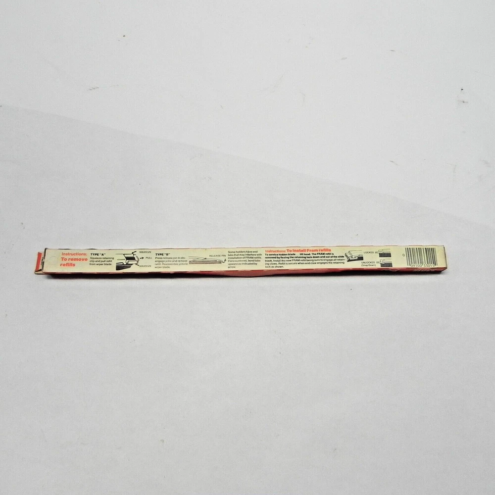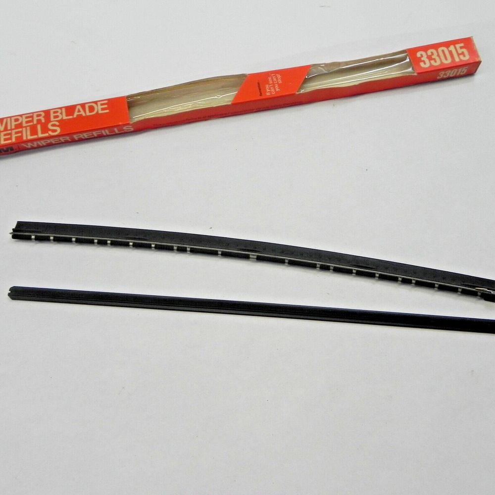 The product is a set of vintage Fram 15-inch replacement wiper blades refills (part number 33015) designed for universal windshield use. It includes mounting hardware for easy installation. The blades are suitable for various vehicles and offer a convenient and reliable solution for maintaining clear visibility during inclement weather conditions. A genuine Fram product, these wiper blade refills provide quality performance and durability for efficient windshield wiping. Fit many makes and models, chevrolet chevy ford mopar chrysler plymouth pontiac honda nissan datsun.