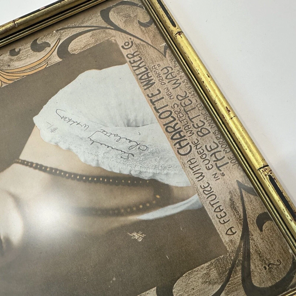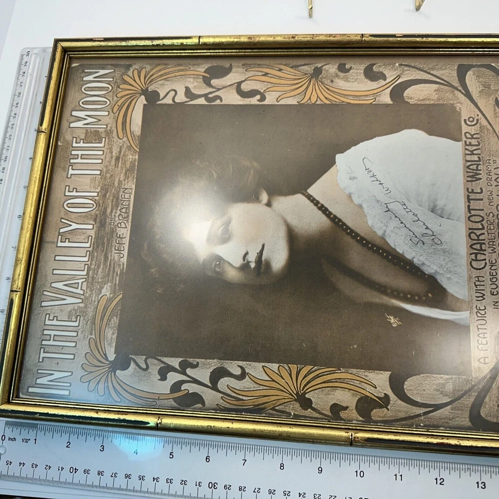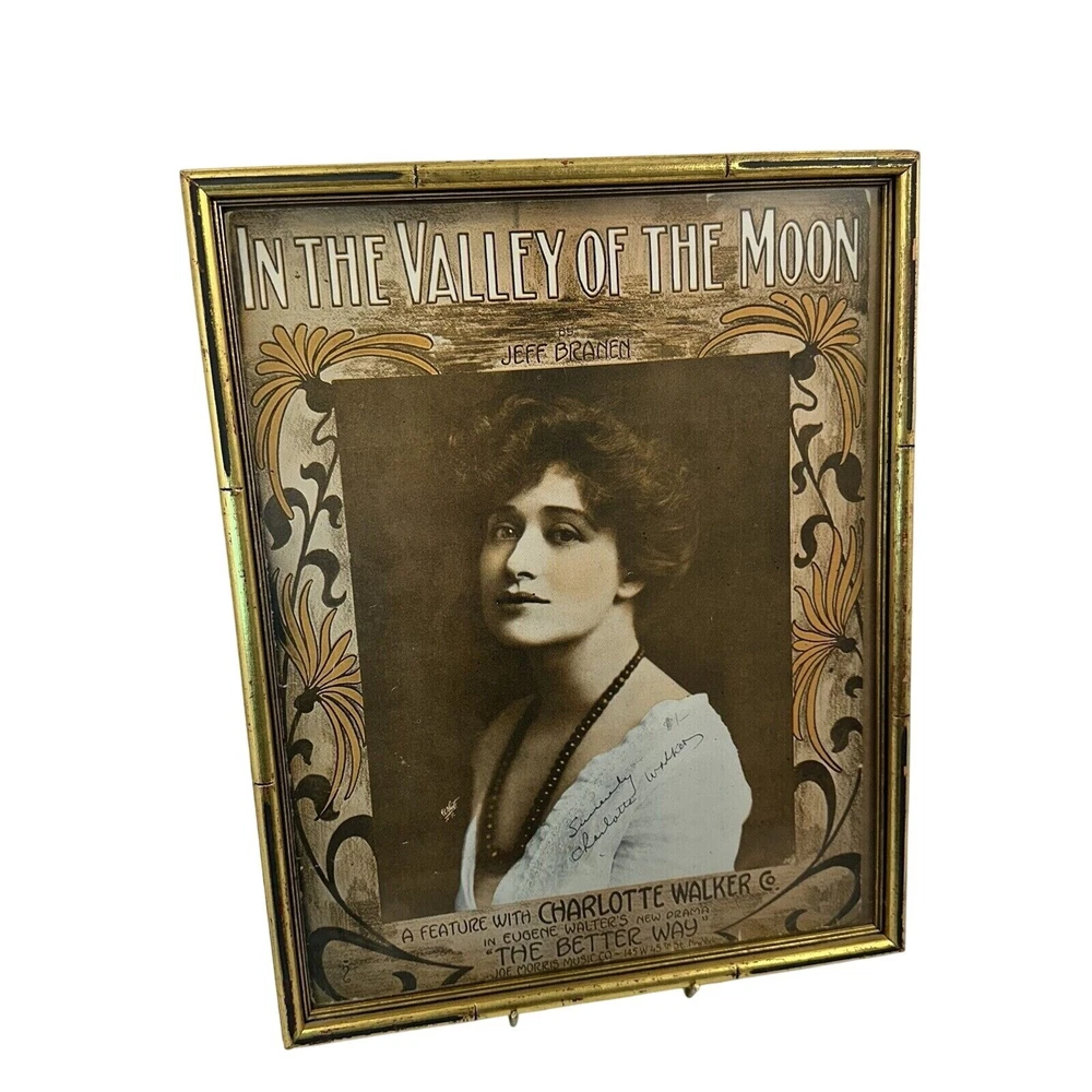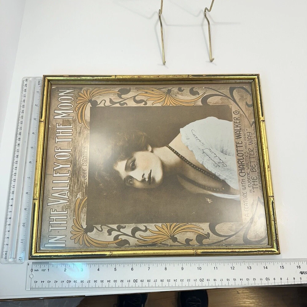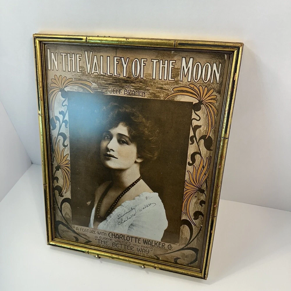 Lovely older sheet music I framed with what I believe is an antique glass frame. The frame is wood that has a bamboo style and gold paint. Feels like "old glass". Sheet music is signed by Charlotte Walker. If you notice the black spot by her lip I believe that is one of a few black spots from sun damage possibly. Open to offers and happy to respond to questions.