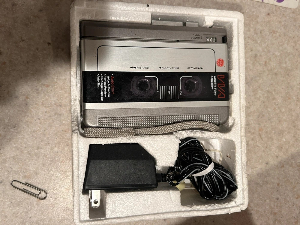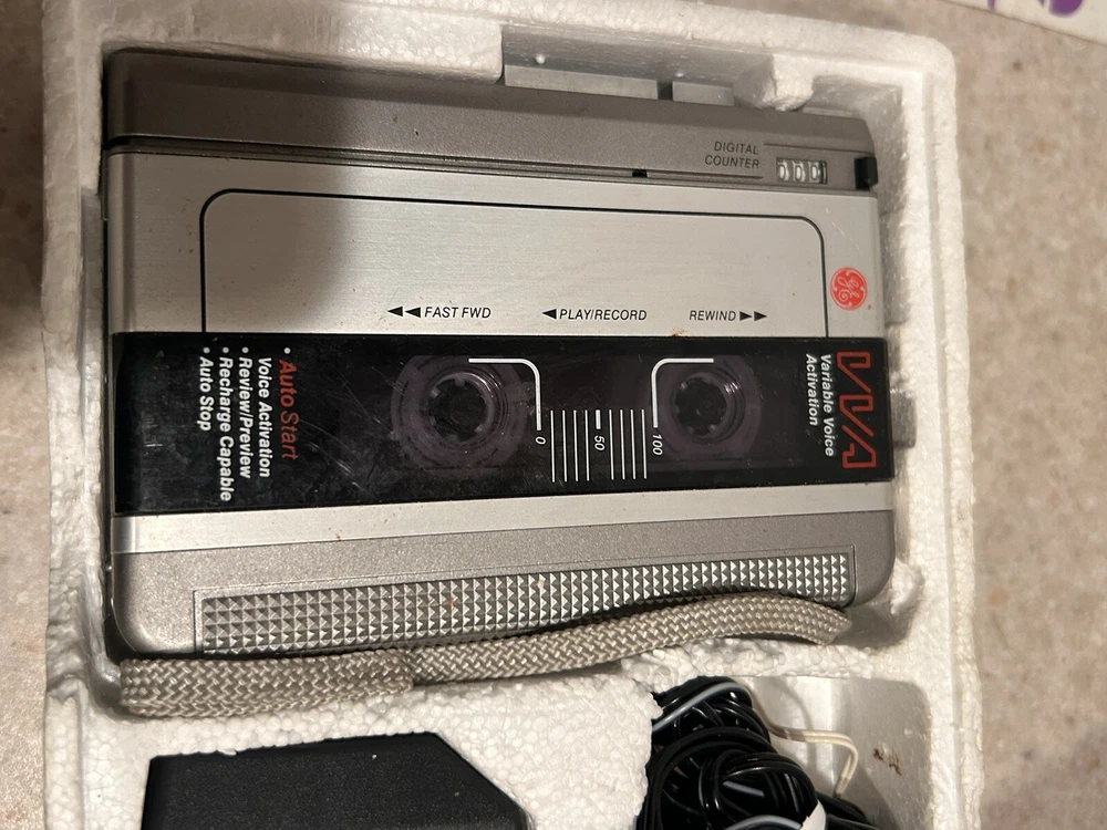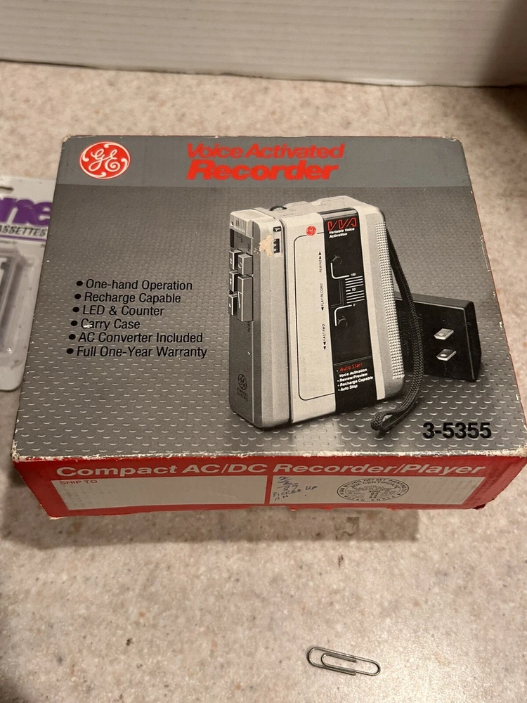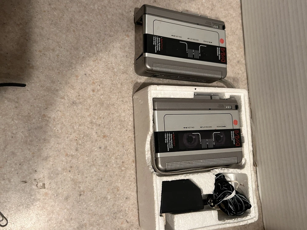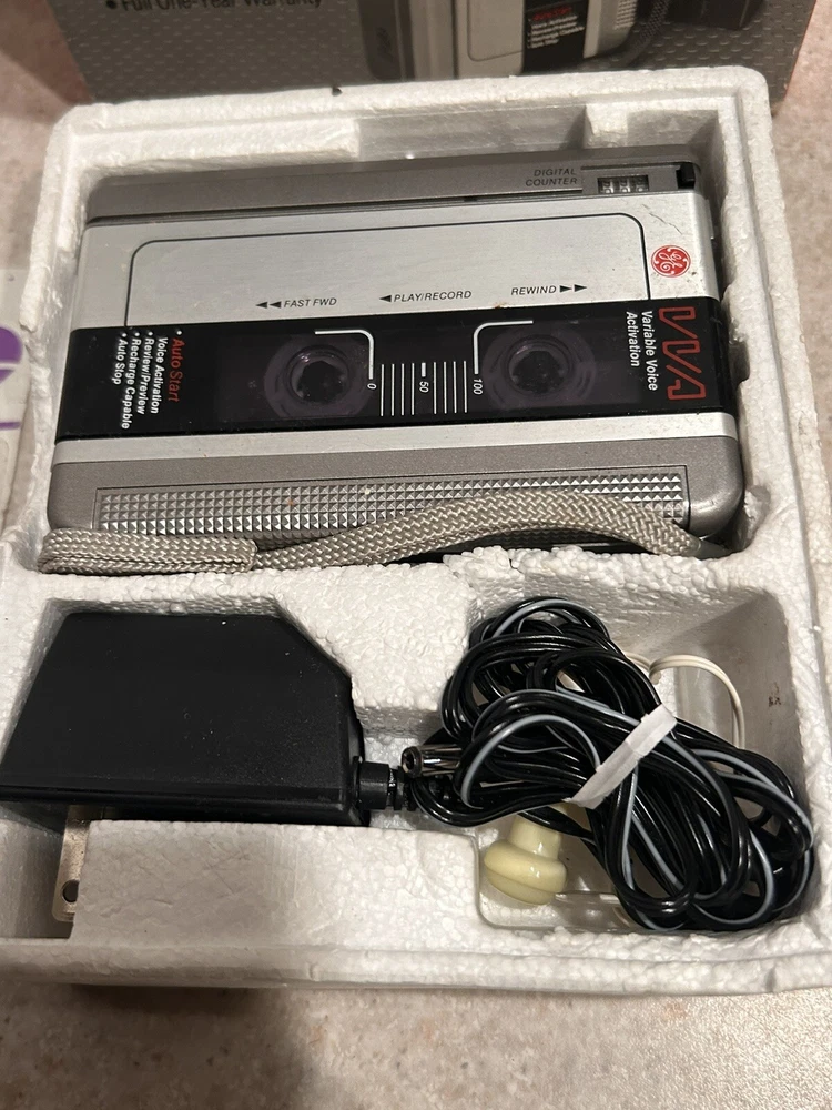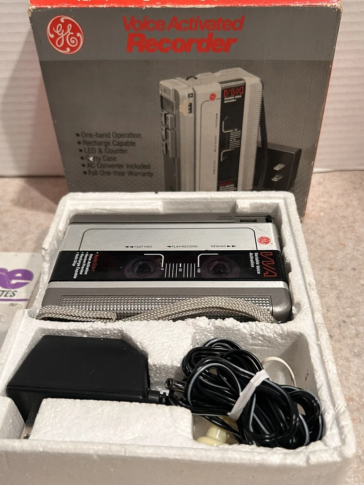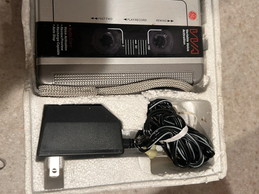 In original box with ac adapter cord and ear piece , works great and is in perfect condition. I am also including a second recorder that is missing the battery cover , please see the last picture that has both recorders. I did have the battery cover but recently lost it , I’m not sure if it’s around or if I dropped it and my puppy took off with it , if I find the cover to the second one I will include it , otherwise the second recorder is missing the battery cover .