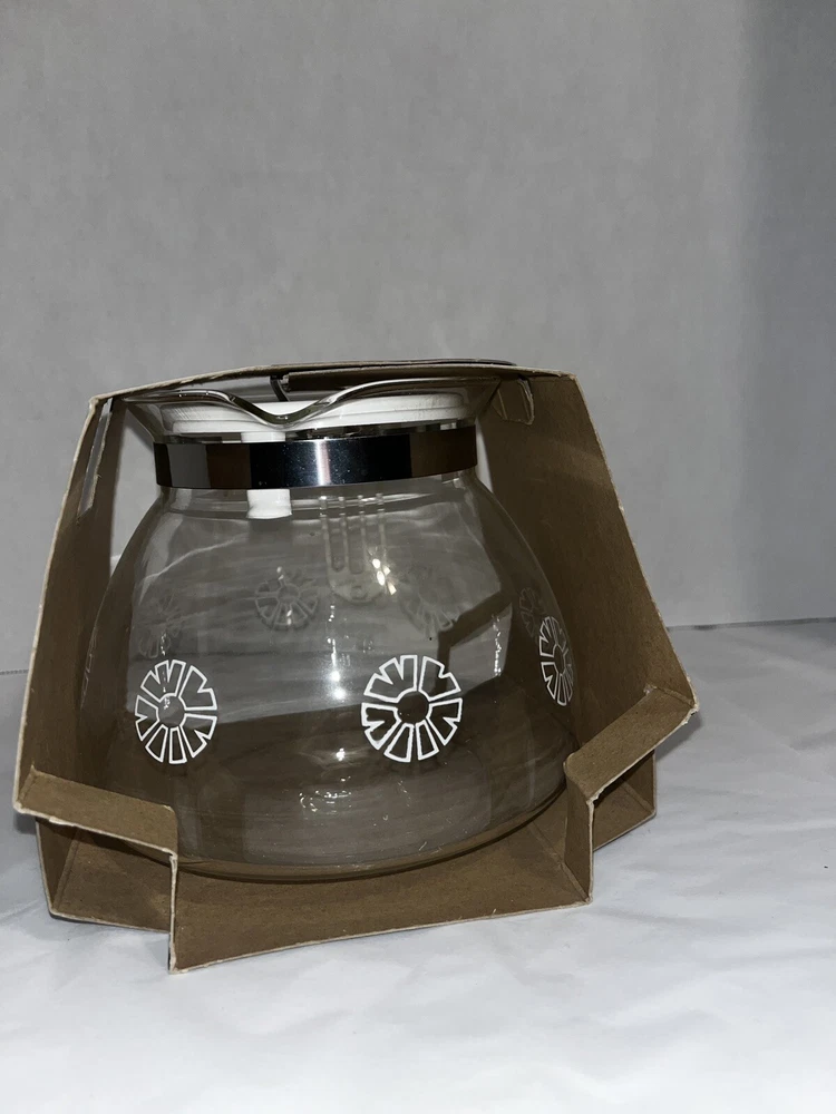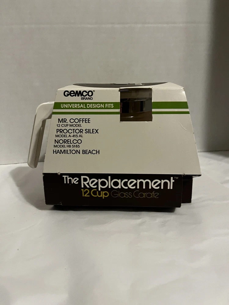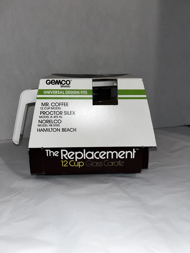 The Vintage Gemco Replacement Carafe is a 10 cup glass coffee pot that is compatible with various brands like Mr. Coffee, Proctor-Silex, and GE. It features an air-cooled handle, stainless steel band, decanter lid, and is made of heat-resistant glass. This new old stock (NOS) item from 1983 is a Universal fit for several coffee maker models, offering a durable and dishwasher-safe option for your brewing needs.