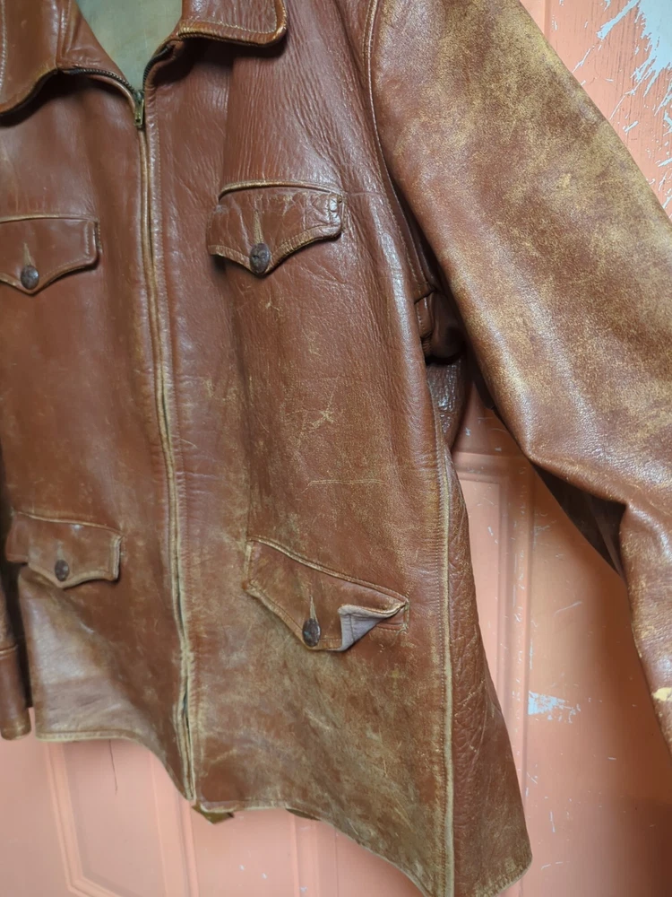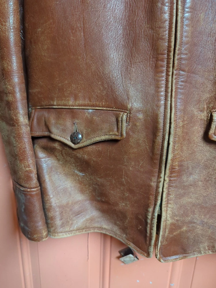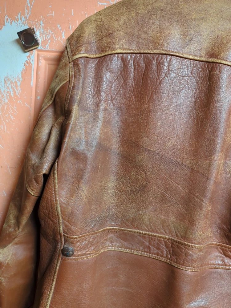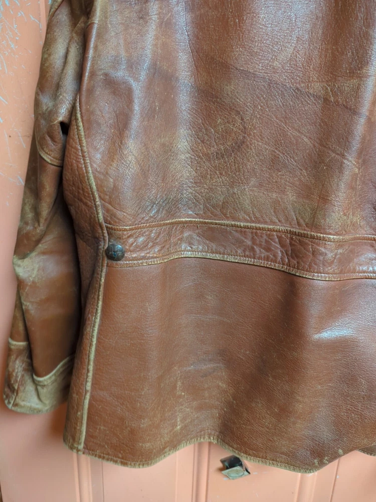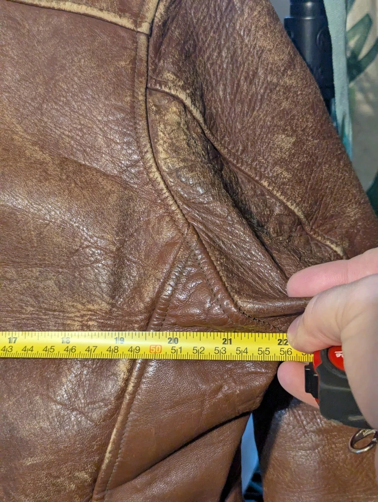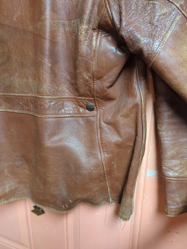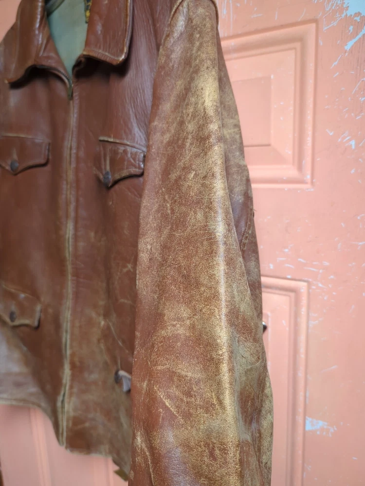 Beautiful worn vintage leather jacket No holes just real nice authentic leather wear SEE PHOTOS WITH MEASUREMENTS no size tags measurements are Pit to pit 22 Length 28 1/2 Sleeve pit to end 18 Shoulder seam to end 24