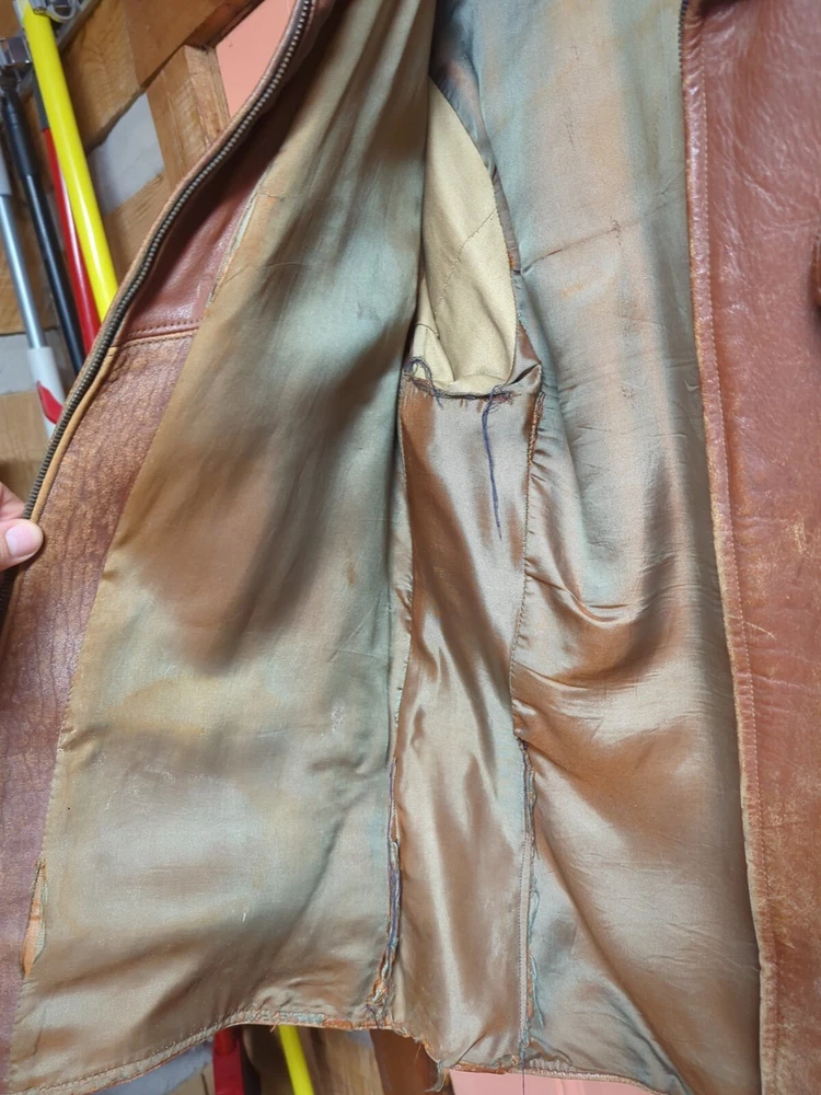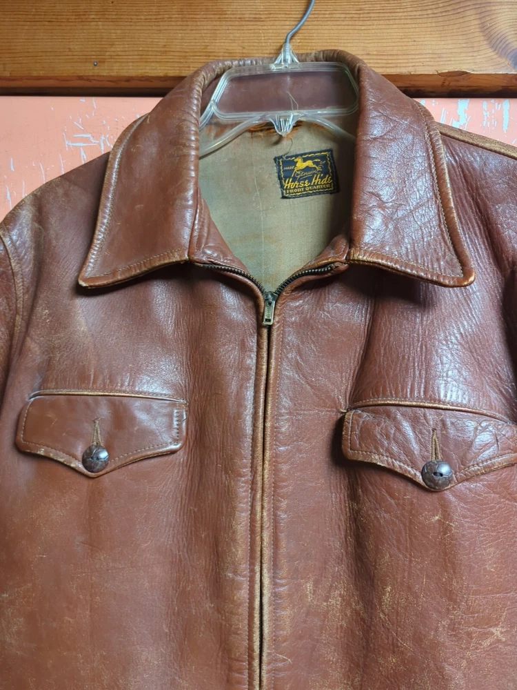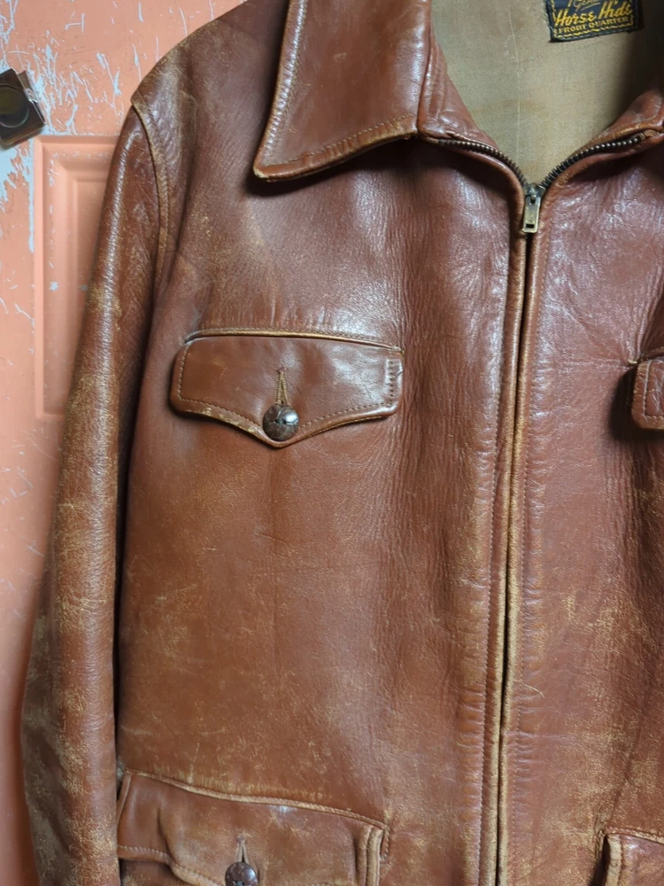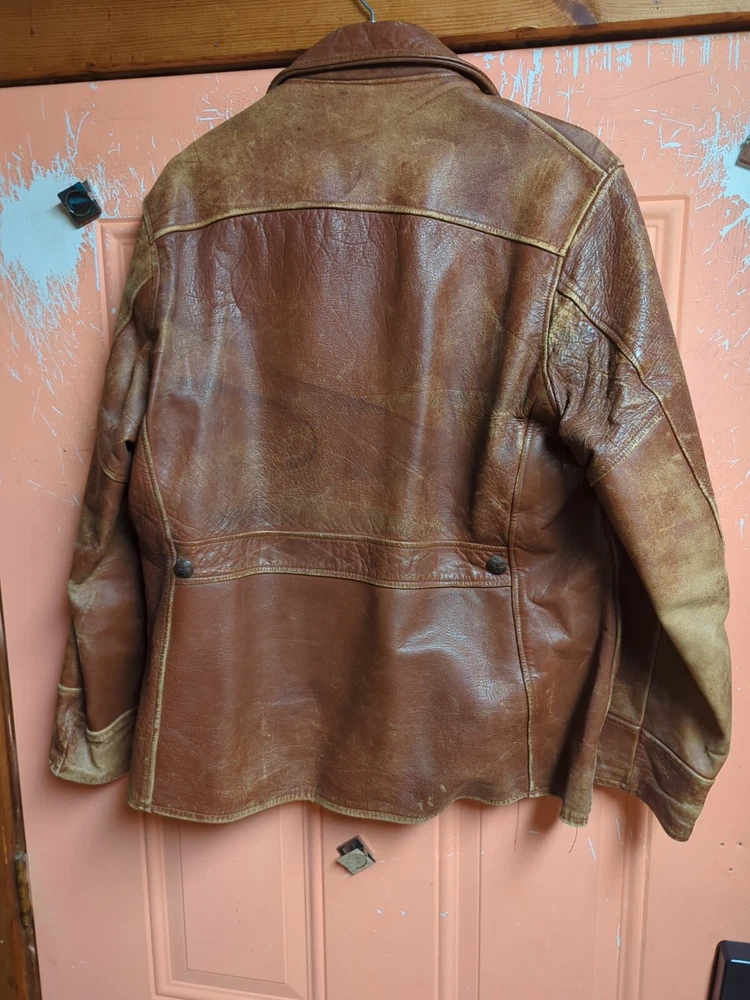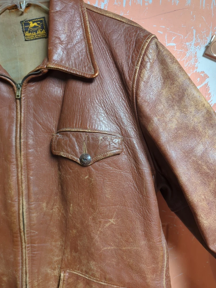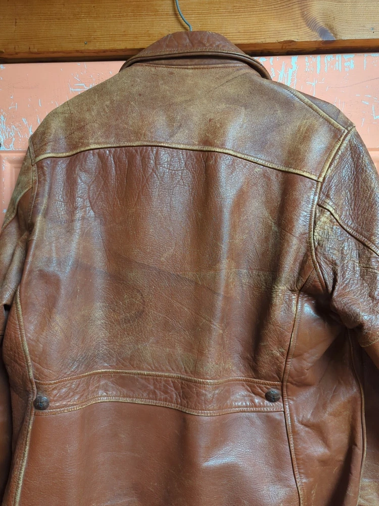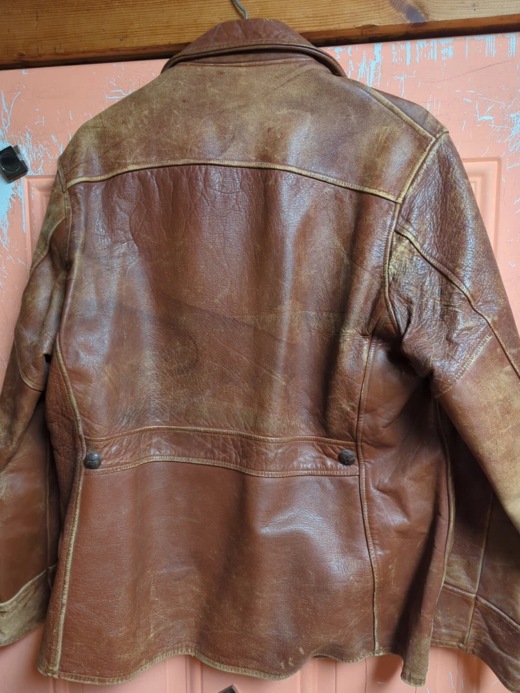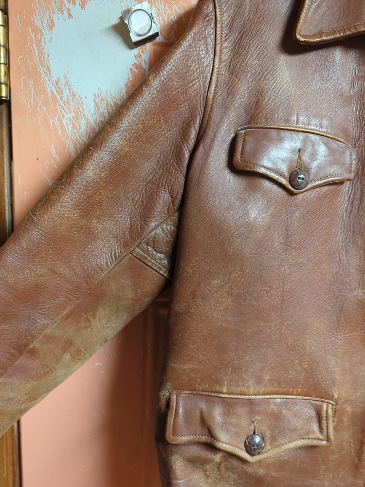 Beautiful worn vintage leather jacket No holes just real nice authentic leather wear SEE PHOTOS WITH MEASUREMENTS no size tags measurements are Pit to pit 22 Length 28 1/2 Sleeve pit to end 18 Shoulder seam to end 24