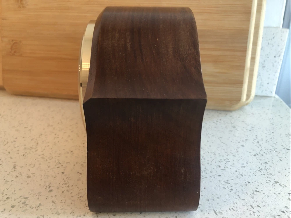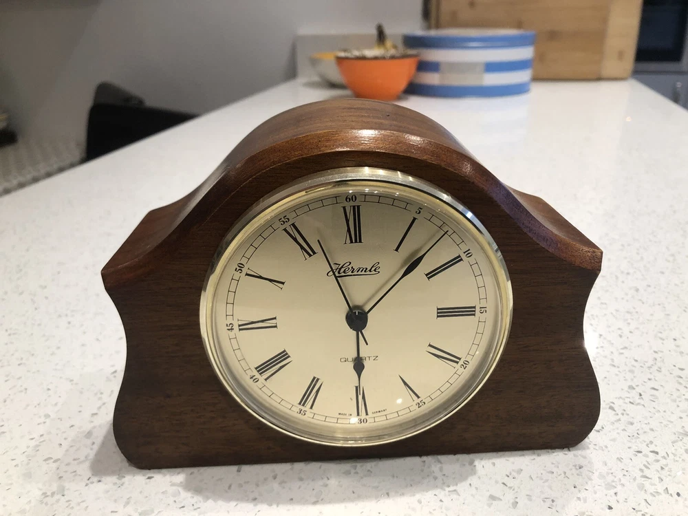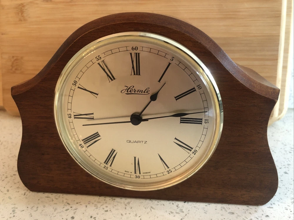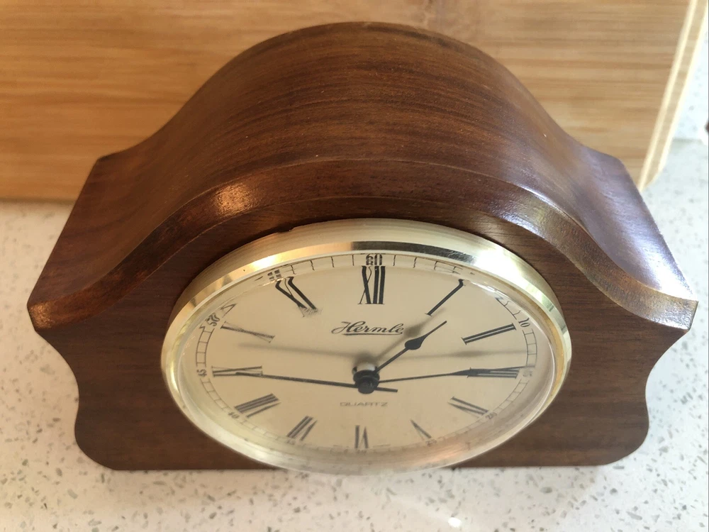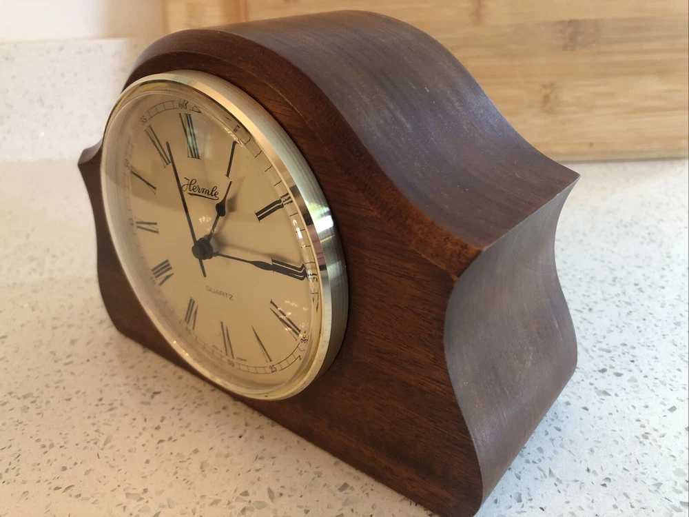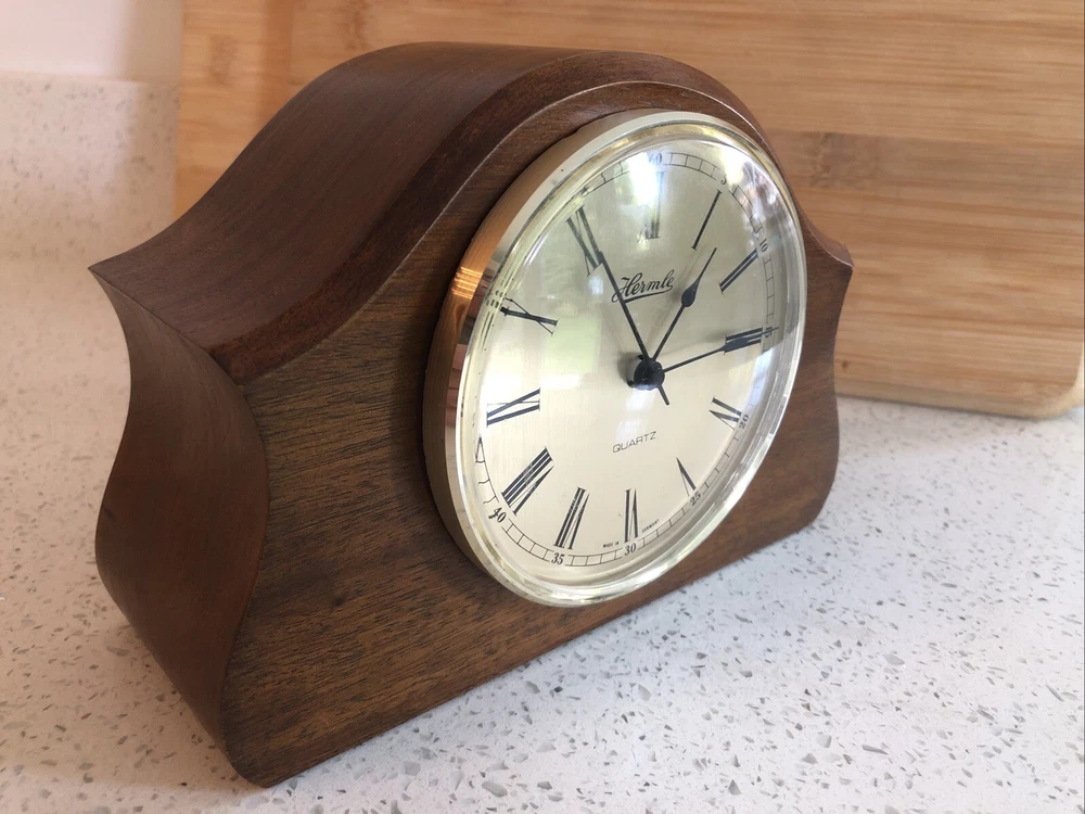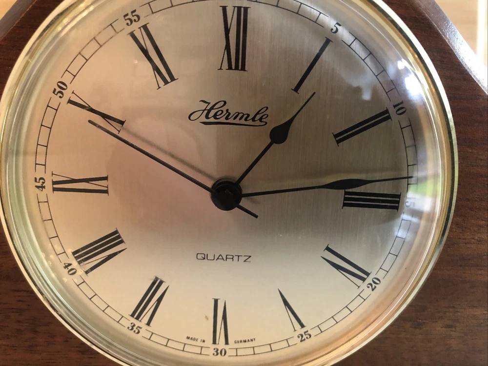Late 20th century -1970-80’s ? Vintage German made HERMLE Mantle Clock with nicely shaped traditional Wood wooden frame with its original Quartz motor mechanism Works with a single LNR 1 N type 1.5 volt battery - a brand new one has just been fitted - tested fully and perfect running with accurate timekeeping There is a VERY quiet tick can hardly hear unless put ear on clock . Approx dimensions 13cm high 18cm length 8cm depth Round brass coloured bezel is 10 cm diameter and dome shaped original acrylic clear front. brass coloured cloak face with black Roman numbers numerals and black hour and minute and second hands. Base has green felt baize In very nice clean condition. See photos - ask any questions Weight 665g Fair start price No reserve Please have a look at our other vintage retro item auctions. We will combine postage prices if at all possible. Welcome to collect from Leicester to save postage. (3 miles from junction 21 of the M1 Motorway)