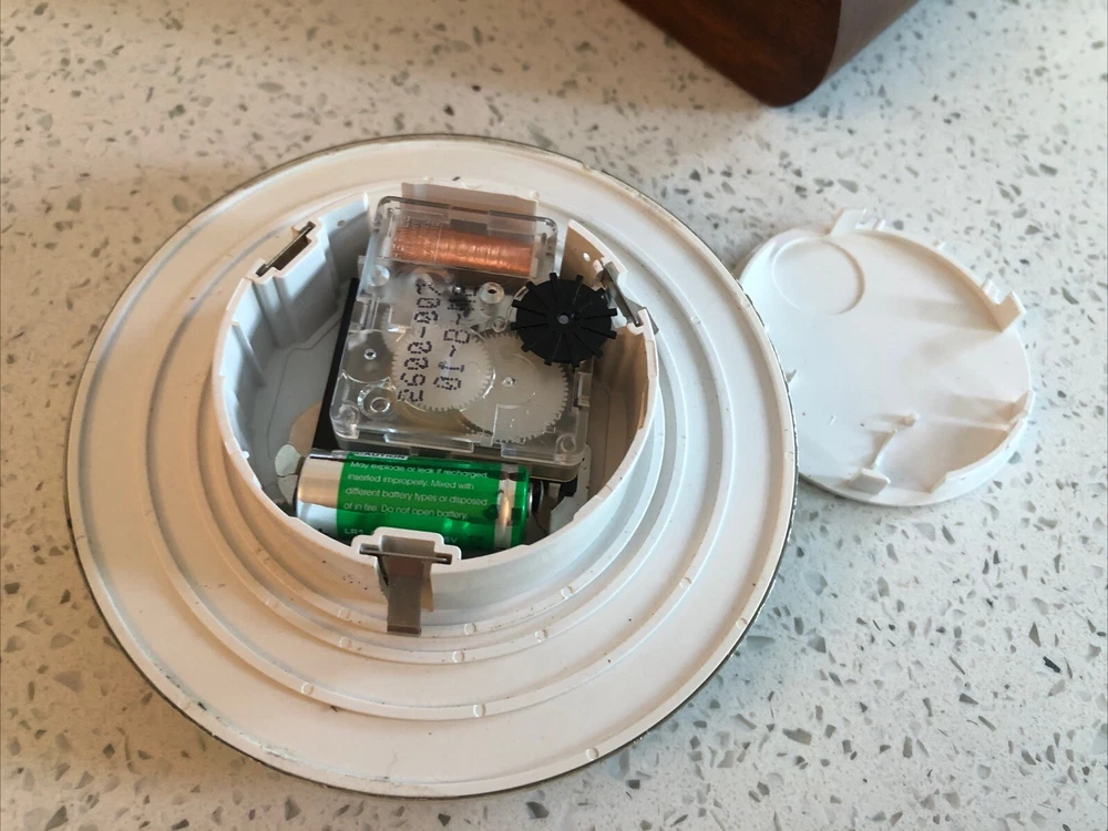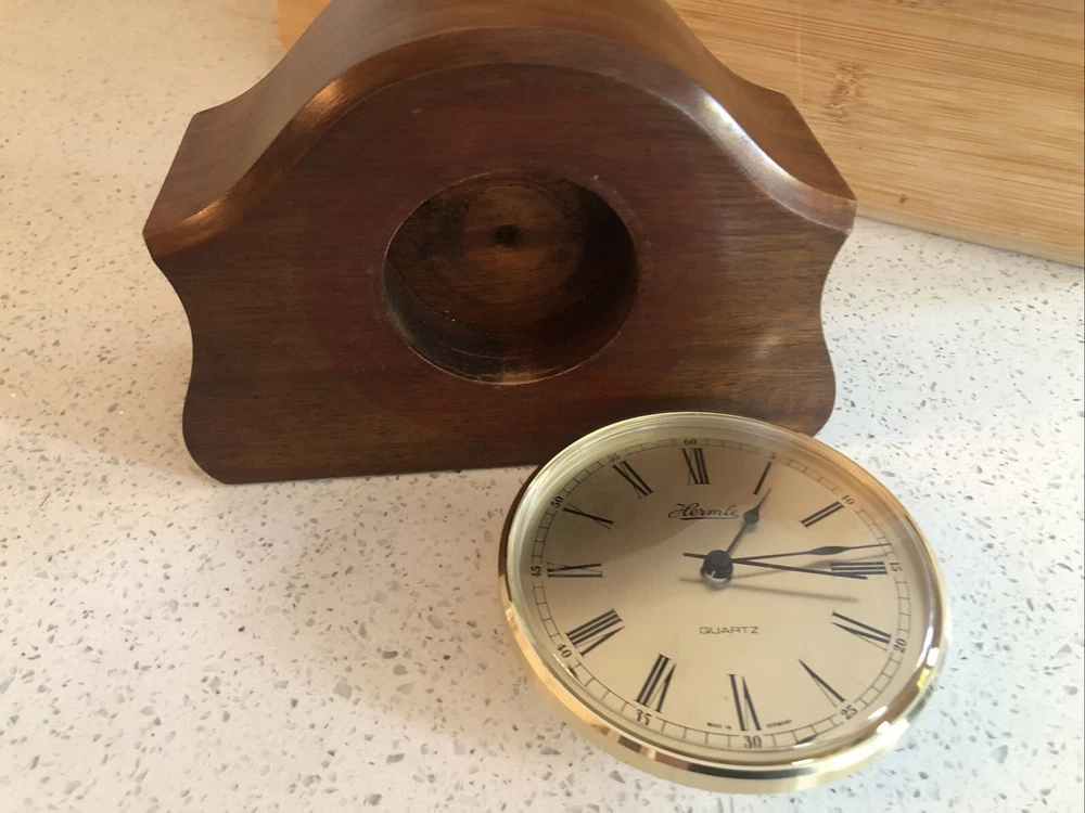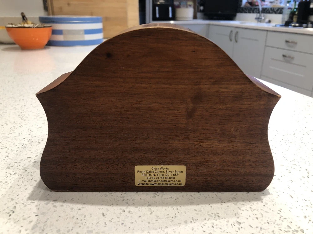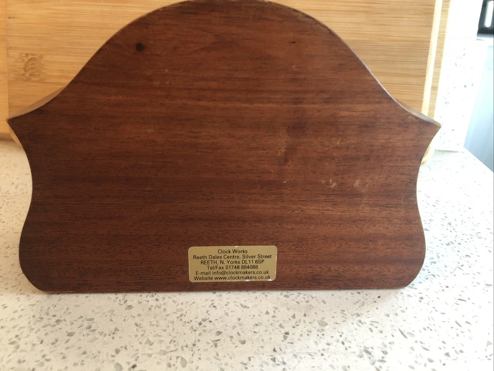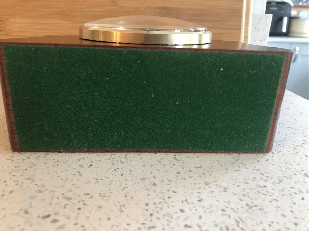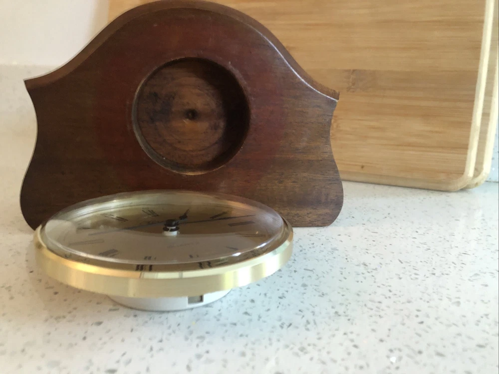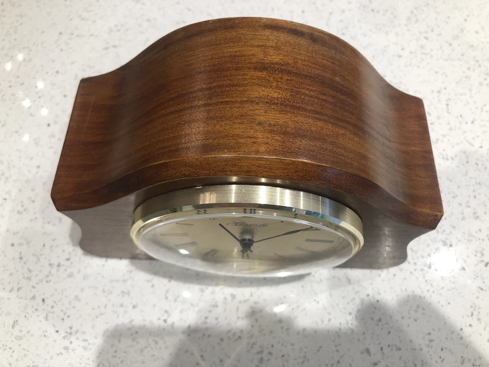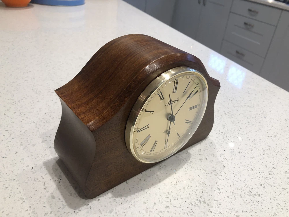 Late 20th century -1970-80’s ? Vintage German made HERMLE Mantle Clock with nicely shaped traditional Wood wooden frame with its original Quartz motor mechanism Works with a single LNR 1 N type 1.5 volt battery - a brand new one has just been fitted - tested fully and perfect running with accurate timekeeping There is a VERY quiet tick can hardly hear unless put ear on clock . Approx dimensions 13cm high 18cm length 8cm depth Round brass coloured bezel is 10 cm diameter and dome shaped original acrylic clear front. brass coloured cloak face with black Roman numbers numerals and black hour and minute and second hands. Base has green felt baize In very nice clean condition. See photos - ask any questions Weight 665g Fair start price No reserve Please have a look at our other vintage retro item auctions. We will combine postage prices if at all possible. Welcome to collect from Leicester to save postage. (3 miles from junction 21 of the M1 Motorway)