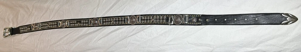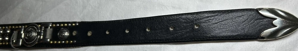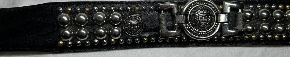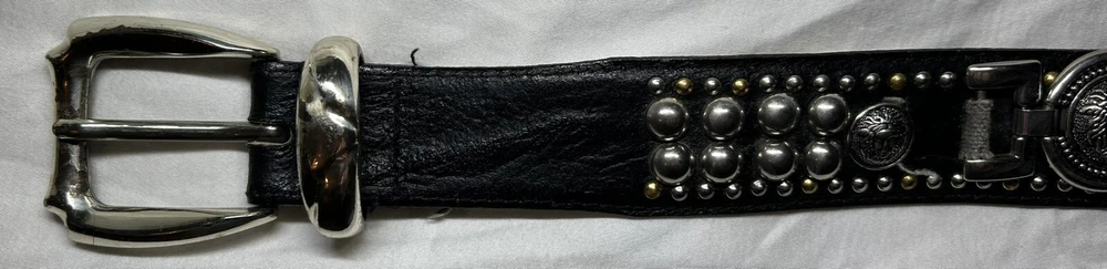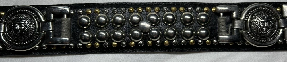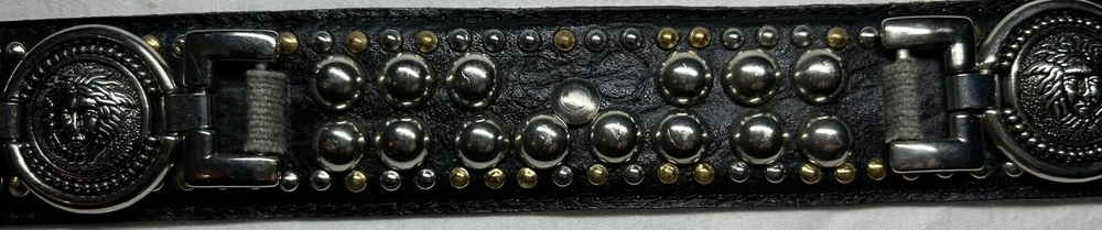 A vintage Gianni Versace black leather belt in size 38, featuring a classic design from V1 Series with Medusa studs. Made in Italy, this belt is a stylish accessory for men. Physically good wearing condition Genuine Leather. Ships USPS 2-3 Days Good Luck and Happy Bidding!