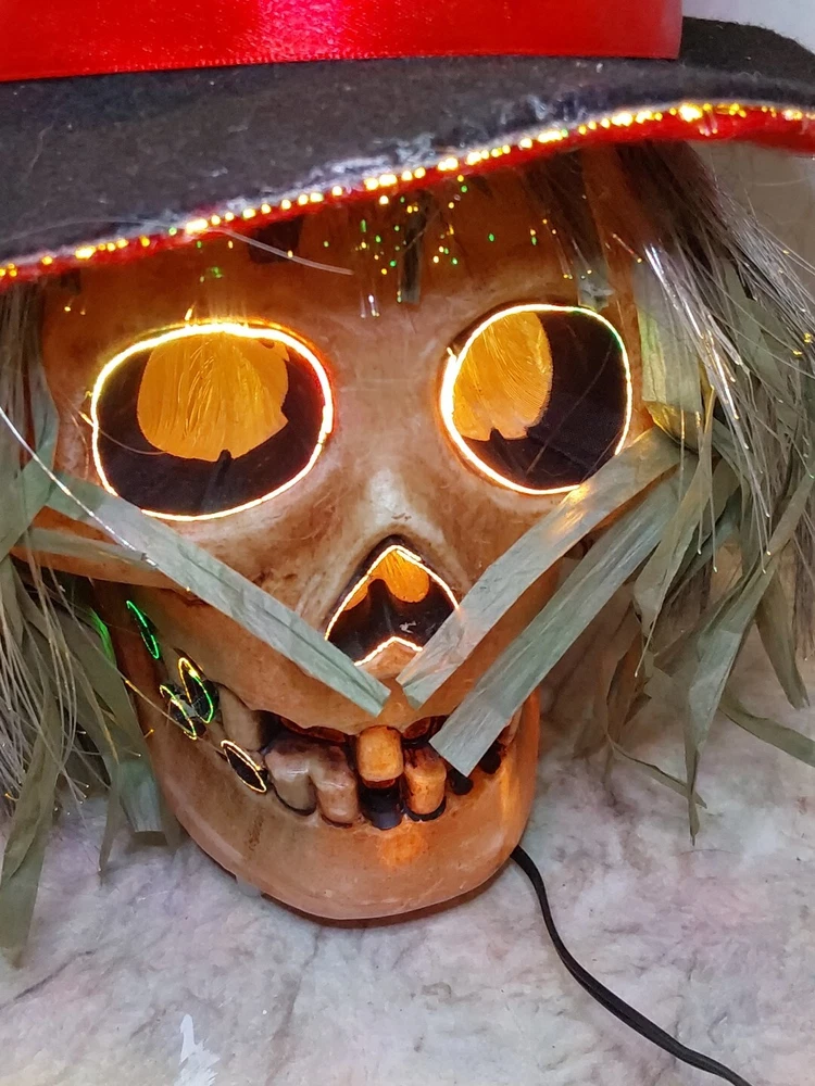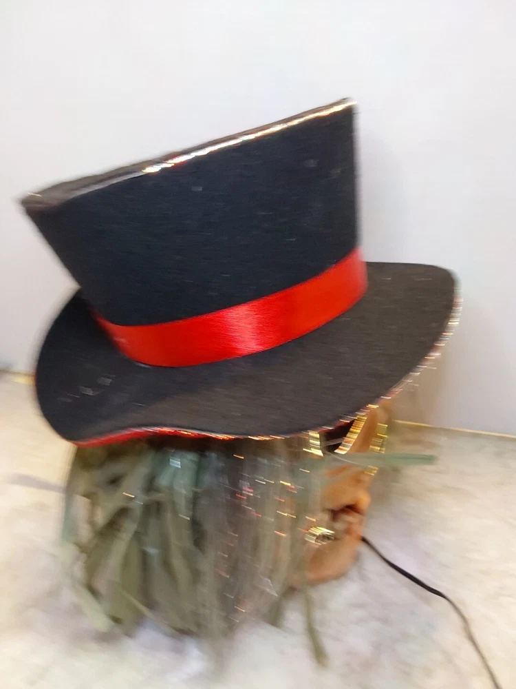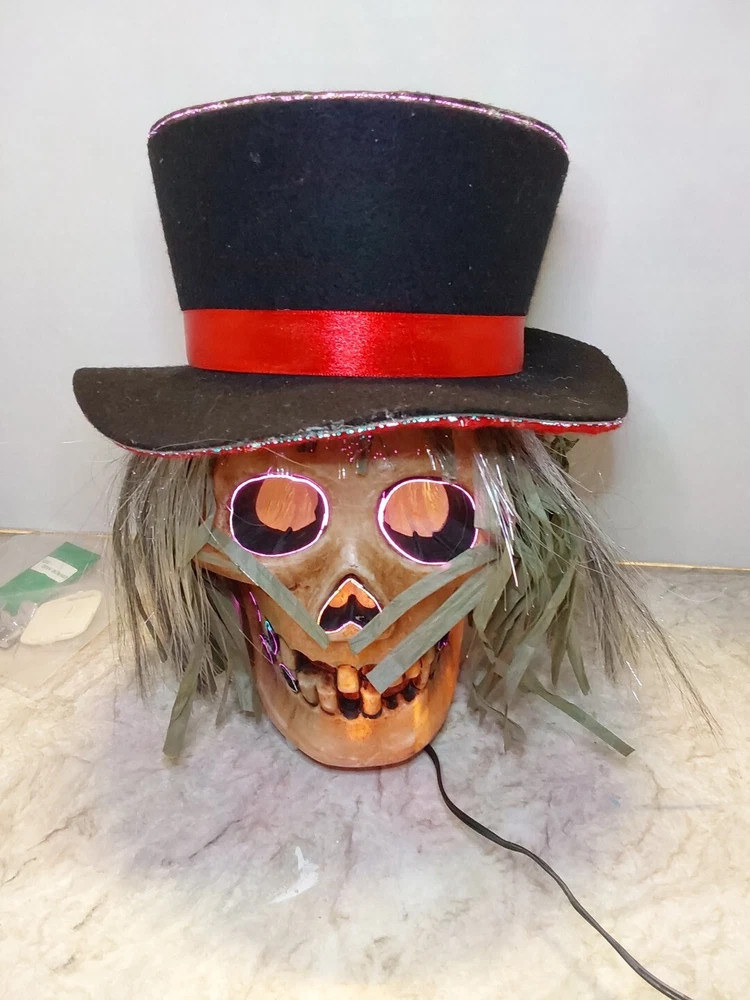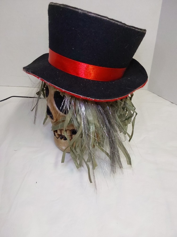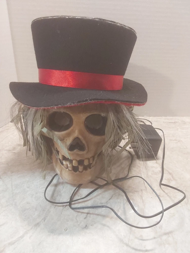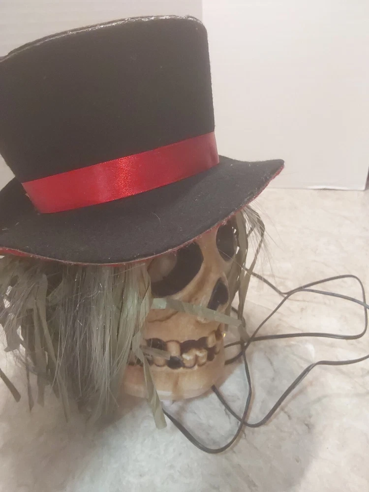 This vintage Halloween collectible features a fiber optic skull head wearing a top hat. The multicolor design adds a spooky touch to any Halloween decor. Perfect for collectors or to add to your own holiday decorations. This unique piece is sure to make a statement and is a great addition to any collection.