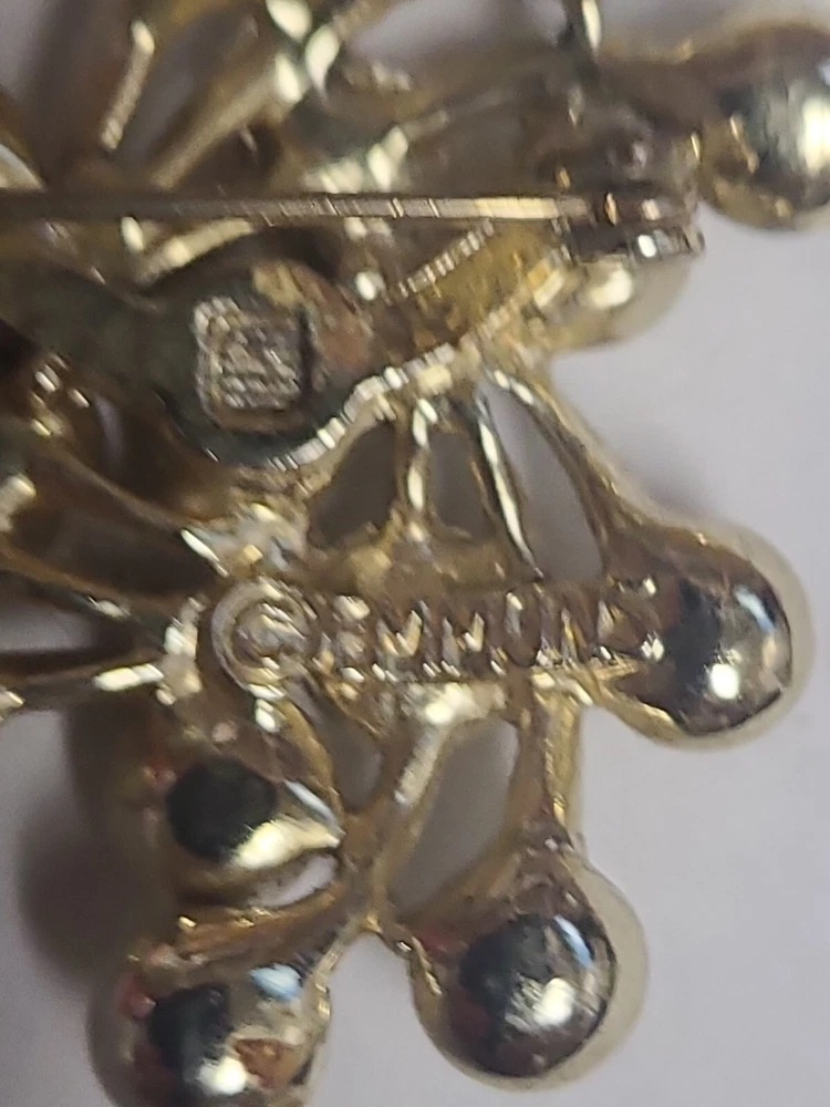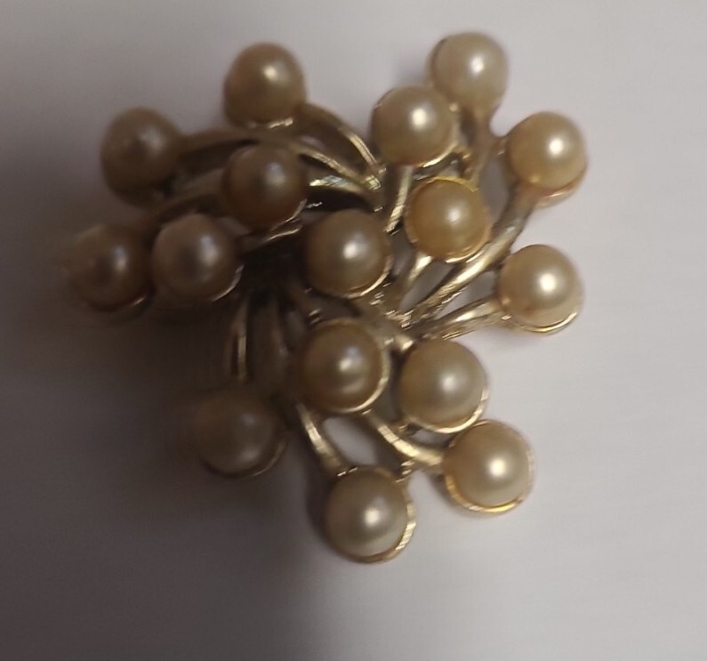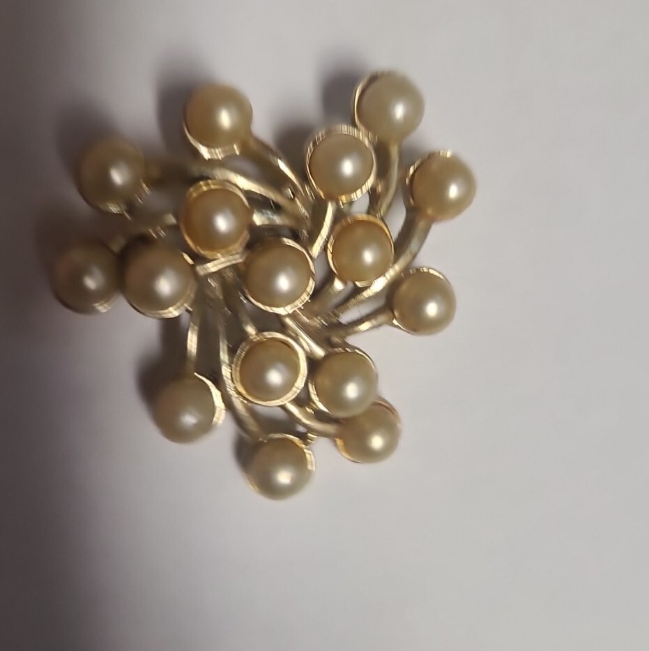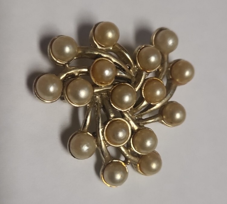 This vintage Emmons pin features delicate gold tone metal branches adorned with beautiful faux pearls. The artistically-crafted brooch is signed and adds a touch of elegance to any outfit. Perfect for special occasions like Christmas, anniversaries, birthdays, and christenings, this piece is a must-have for vintage jewelry collectors. The pin is in excellent shape and will make a great addition to your collection.