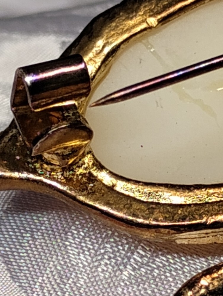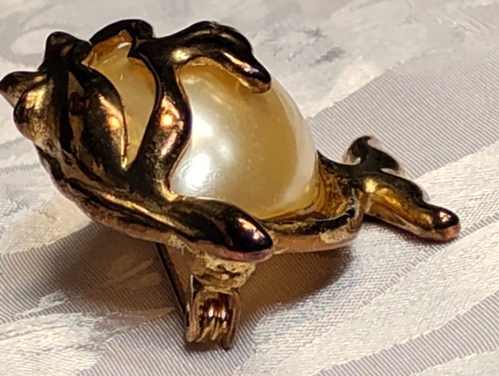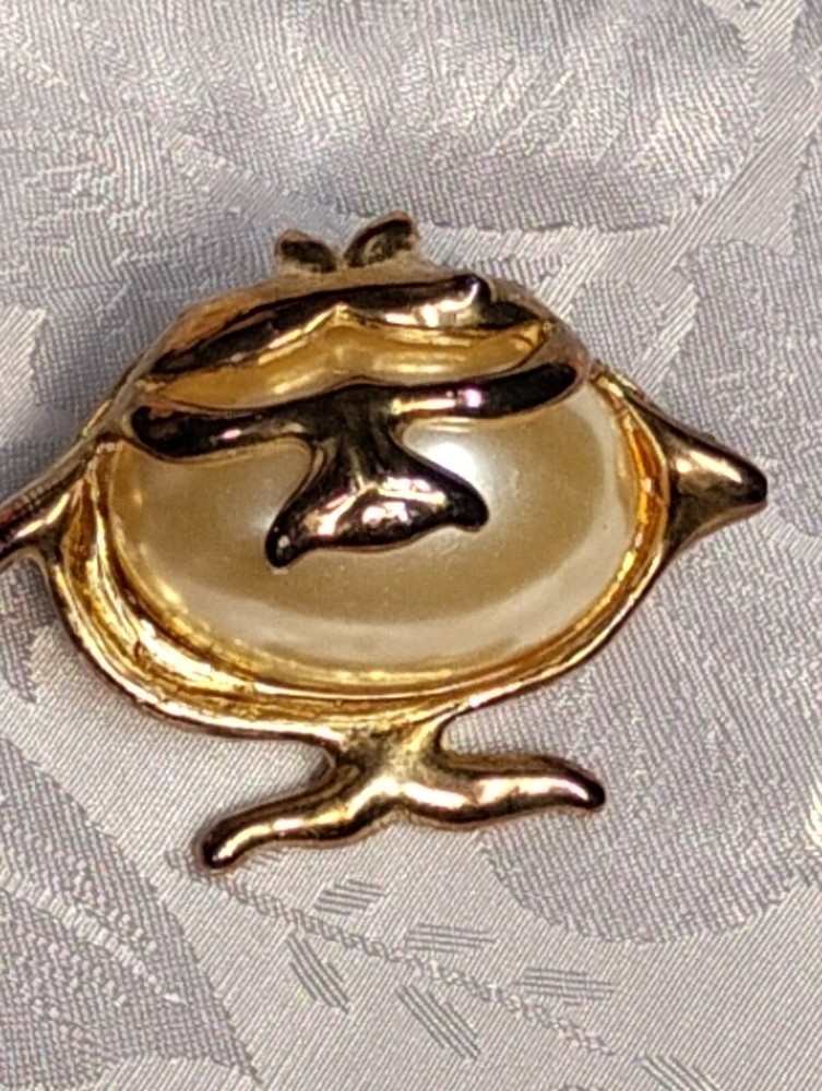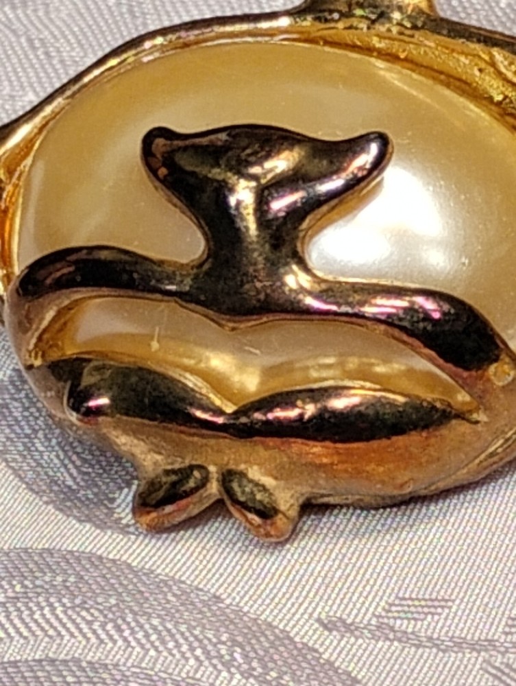 This vintage fish brooch is such a charming find! The gold-tone metal gives it a classic look, while the pearl-colored belly adds a touch of elegance. The "C" clasp works perfectly, and even though the exact materials aren’t labeled, the craftsmanship is solid. It’s a unique piece that would make a great gift or a lovely addition to any collection. Definitely a standout accessory!