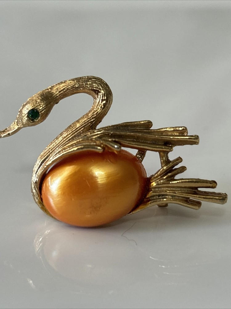 The Vintage Brooch Pin by Jelly Belly features a charming Golden Swan Bird design with a gold tone and orange color scheme. The brooch is accented with a rhinestone green eye, adding a touch of sparkle to the piece. Made of gold tone metal and acrylic, this vintage brooch is a unique and eye-catching accessory for any fashion enthusiast. The bird theme adds a whimsical and elegant touch to the overall design, making it a standout piece in any jewelry collection.