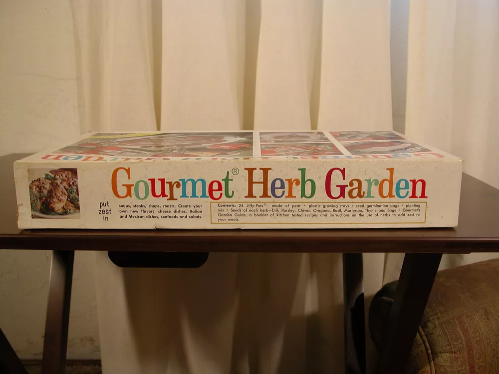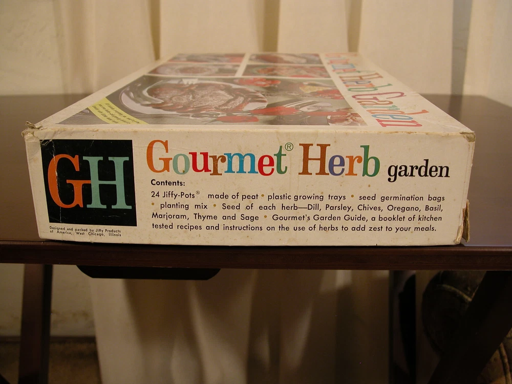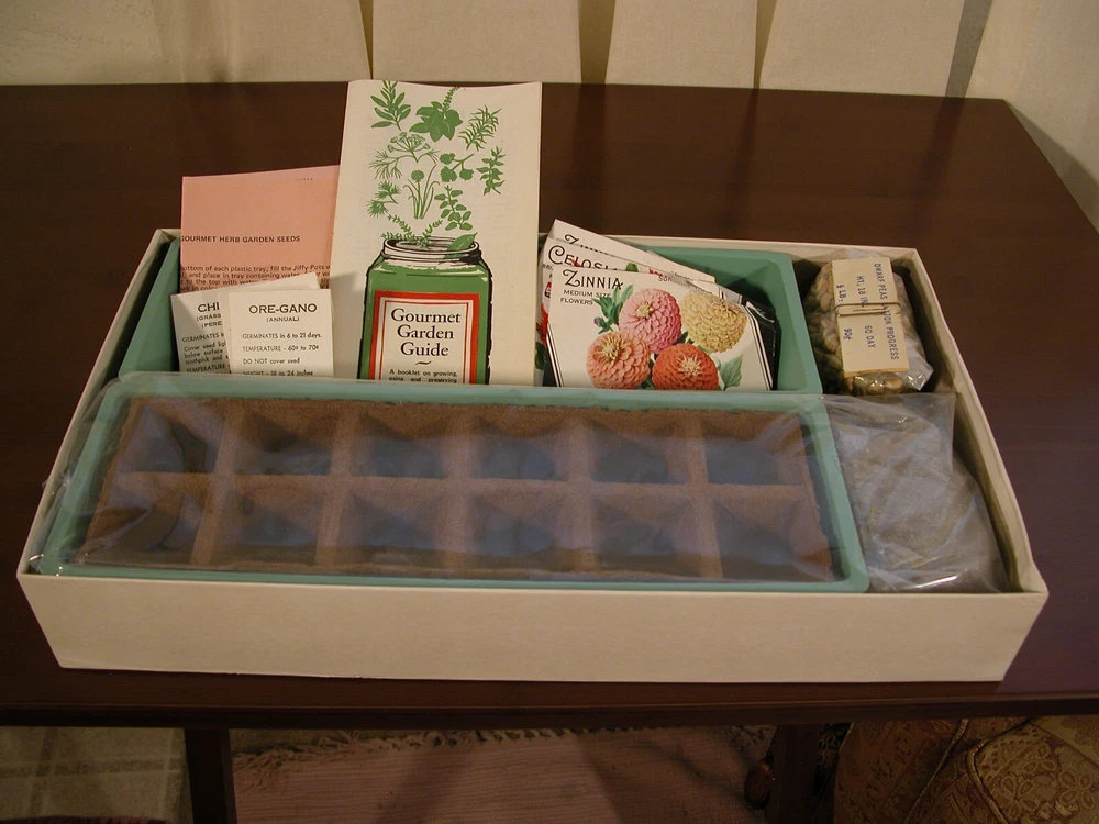 Vintage Jiffy pot Gourmet Herb Garden boxed seed starting kit. Includes booklet entitled Gourmet Garden Guide, A booklet on growing,using and preserving your own herbs, 17 pgs. Leaflet,How to Start Your Gourmet Garden Seeds.Two jiffy pot liners,one tray of jiffy pots with12 sections, and one bag of seed starting mix. Three packets of seeds that look original to the set. Three packs of vintage Mandeville Flower Seeds dated 1969, opened. One packet Burbee lemon cucumber seeds, not dated, opened.Three packets of flower seeds in Burbee life lock seed protection packets. On these packets it says these types of flower seeds lose viability quickly. I assume these have been opened. One packet Abundant Life Seeds, parsley, opened, not dated. One large package of Laxton Progress Dwarf Peas from Grays Seed and Garden Supply, Eugene, OR. It is likely that the germination rate for any of the seeds in this kit will be low to nonexistent.