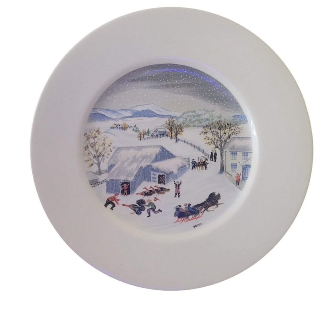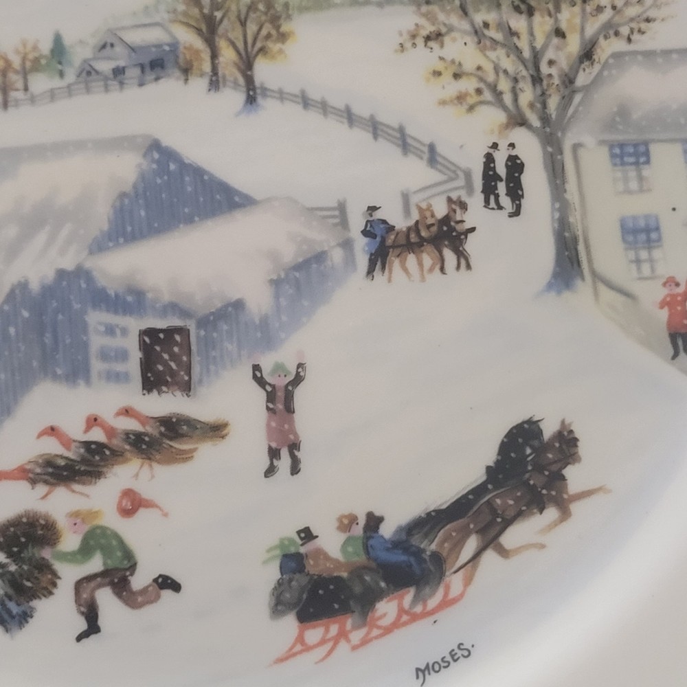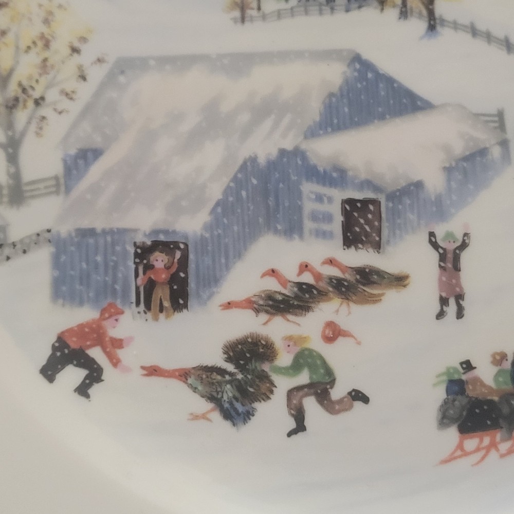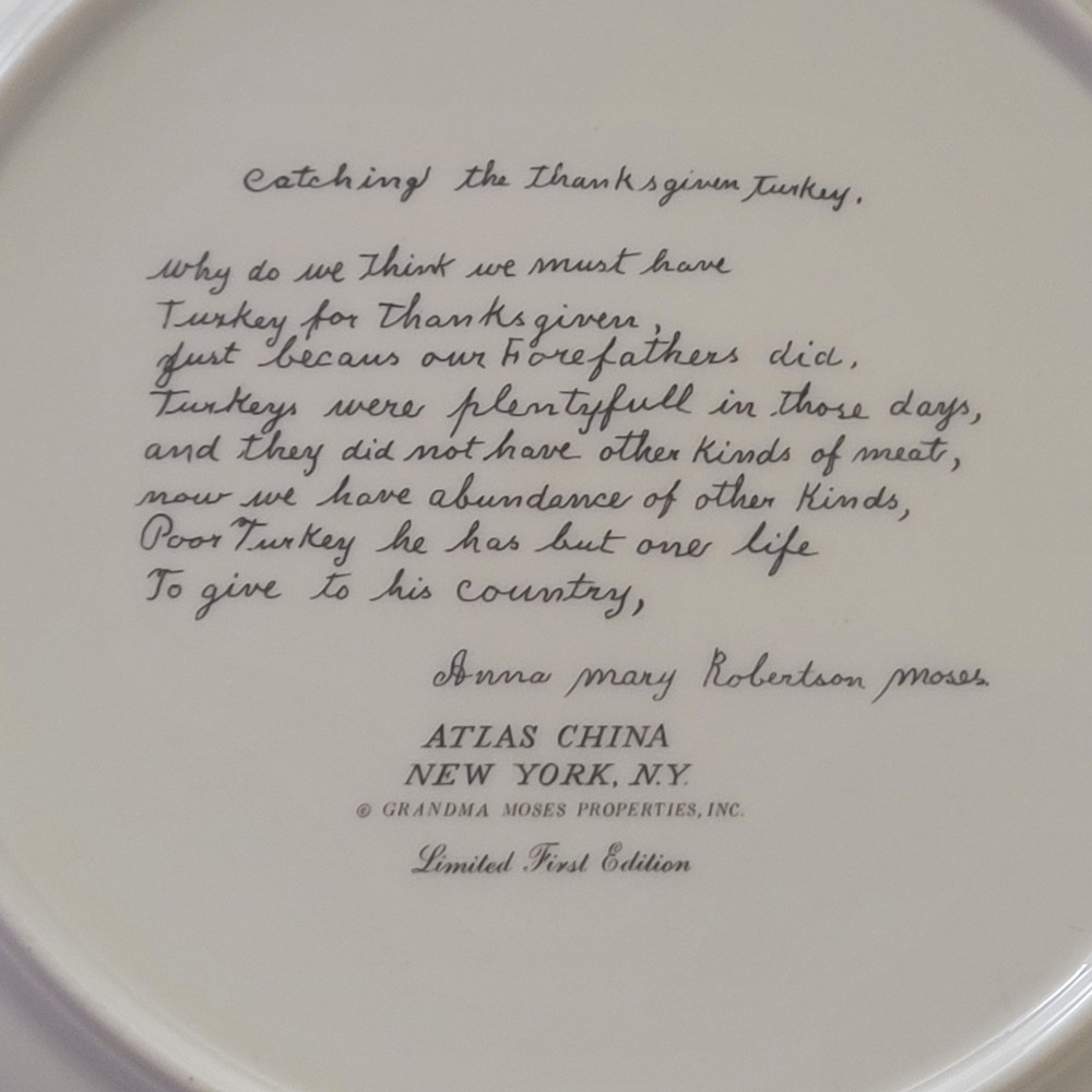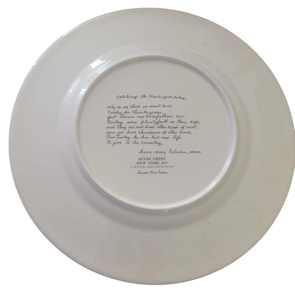 Manufacturer: Atlas China Item: Grandma Moses Catching the Thanksgiving Turkey Vintage Limited First Edition 9 3/4 inches in diameter Active picture with sleigh, snowy scene and of course men and a turkey A great looking collector plate very reasonably priced.