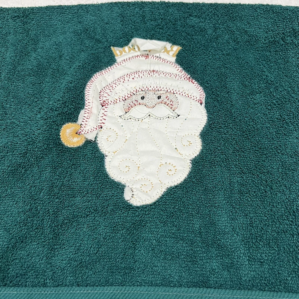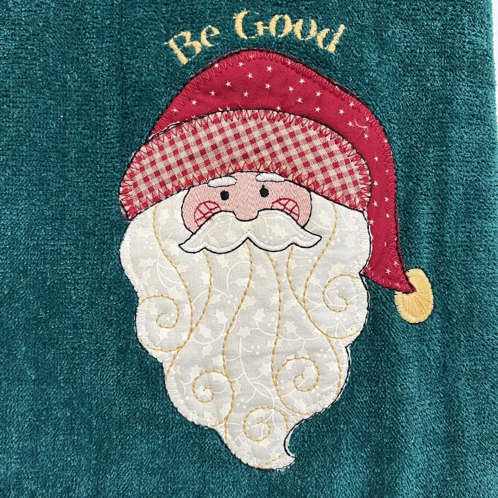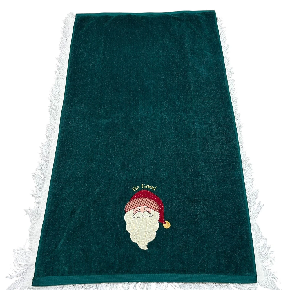 Vintage Green Bath Towel ‘Be Good’ Embroidery Santa Patchwork Cotton Made in USA