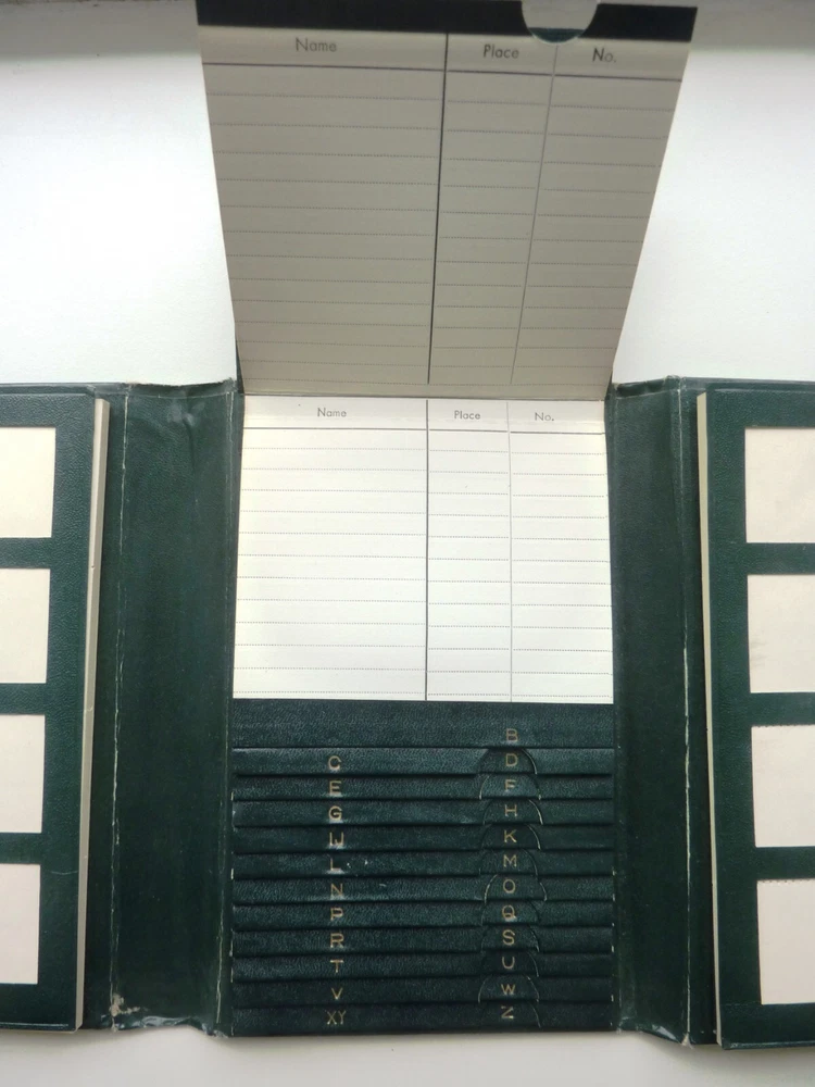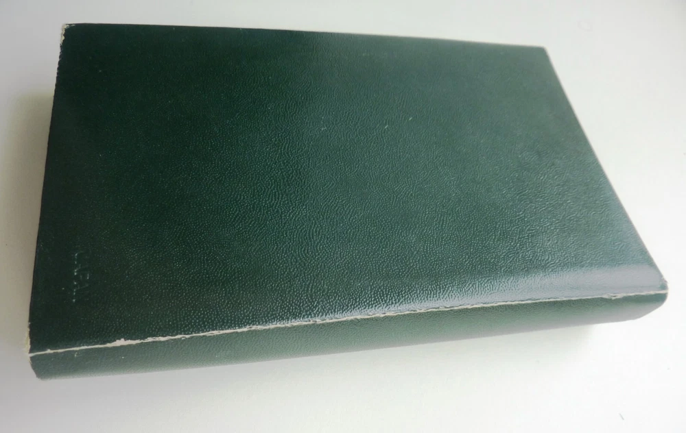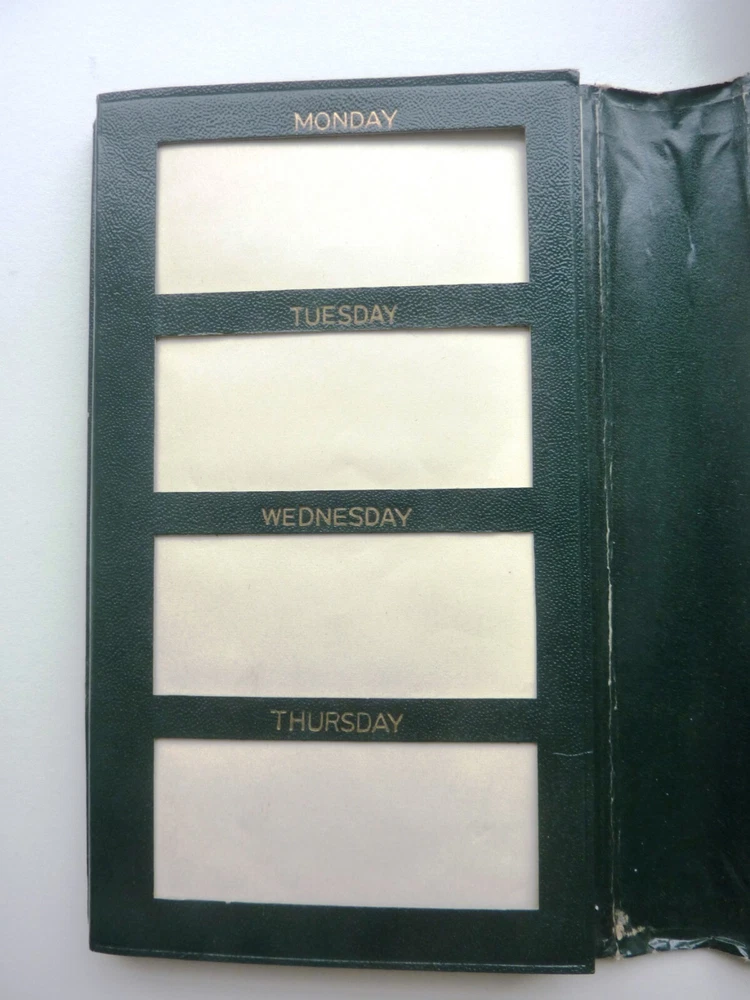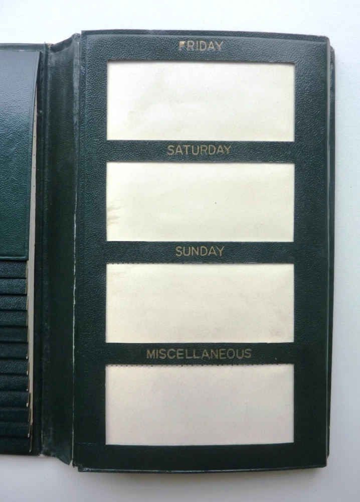 Vintage mid-century green leatherette Telephone and Weekly Memo book, estate item from my Mother's non-smoking home: Unfolds open in thirds; center section is for hand-written contact list, left and right sections are labelled with day of the week, underneath which is a perforated tablet which can be torn out when task is complete! 7" ( 17.78 cm) tall, 4-1/2 " (11.43 cm), 1-1/4" (3.175 cm) thick. Note varying degrees of wear to edges, corners and folds: please examine pictures closely, as they are part of the description. ~~~~~ =^..^= ~~~~~ Condition : This item is described to the best of my ability; please contact me by eBay message if you have any questions or concerns before bidding or buying . Pictures are the actual item you're getting. Payment : Expected immediately after the auction's closing or upon "Buying it Now." Shipping : Shipping is USPS Priority - or USPS Ground Advantage - your choice. Shipping charge includes: electronic tracking and delivery confirmation and USPS insurance for purchase price of the item. If there are any issues with damage or breakage, please retain all items and packing materials and contact me immediately so we can file a claim. Please be aware I try to use recycled packing and shipping materials; I do package items very well so they arrive safely in good condition. I only ship to the USA; however this item is eligible for eBay's International Shipping Program. Buyers in countries supported by this eBay program are welcome to bid on or buy my listings. Any international and/or import fees are the buyer's responsibility. Packages are out of my control once they have been mailed. C ombined Shipping : I am happy to combine shipping when possible and practical for multiple items purchased at the same time on one invoice . Note, this only works with eBay's full desktop website, not the mobile app. If you'd like a shipping estimate, please message me via eBay- including your zip code ; I will reply ASAP. To enable combined shipping: Wait to pay until you are finished shopping. Please add items to your shopping cart. When all items are in your cart, open the shopping cart; you should see a list of your desired items. In the upper right there's a link to "request total". Click that link ~ do not click "check out" . This will send me a message that you've requested an invoice, which I will send ASAP with your correct total and shipping charges. You will only pay shipping based on actual package weight, and I will need to pack your items together and re-weigh the package. You may then pay according to the invoice. Please let me know or contact eBay support if there are issues with this procedure ~ I'm happy to work with you. Note that postal regulations do not allow any other mail class items to be packaged with items traveling by media mail. Thanks for looking at this useful vintage item-I look forward to sending it to YOU!