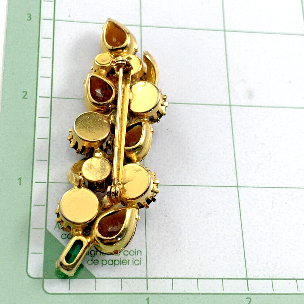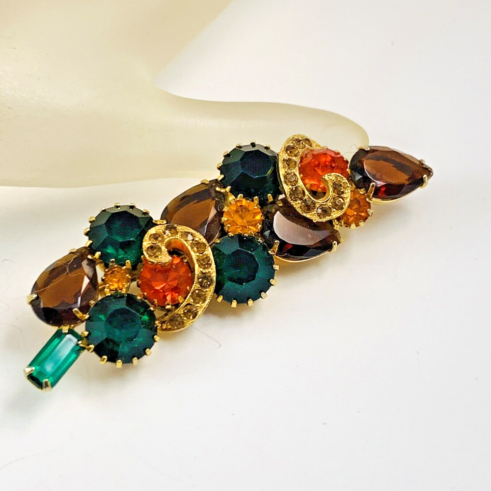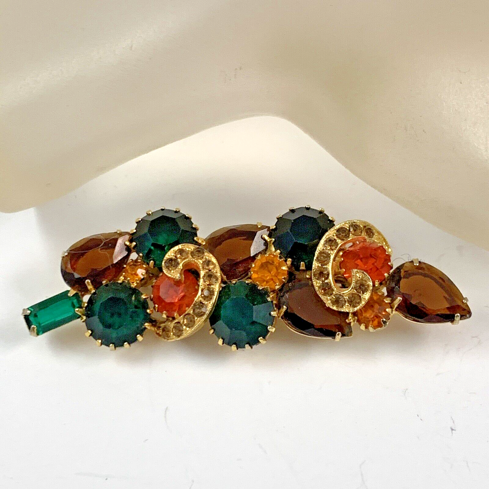 Vintage Green Orange Brown Golden Rhinestone Gold Tone Brooch. Unsigned Estate Piece, Juliana? Or Kramer? Unsigned High End Quality Piece. Pre-Owned Estate Jewelry in Very Good Condition. Ready to wear, give as gift or add to a collection. Our Vintage items are mostly from estate sales and vary in age from 100+ years old to more modern pieces. Please use your judgement. Items are photographed on a measuring matte with one-inch squares to give you an idea of size. Any photography props / holders you see are not included.