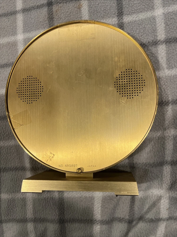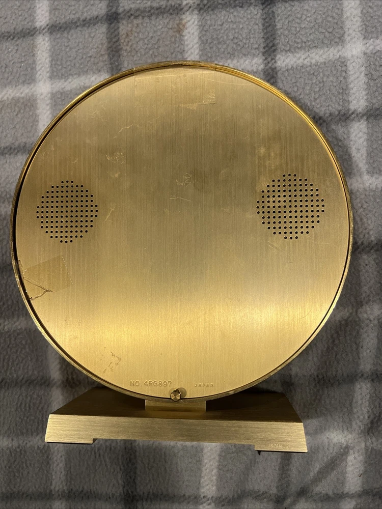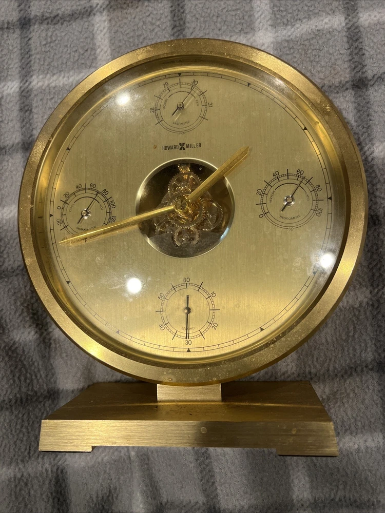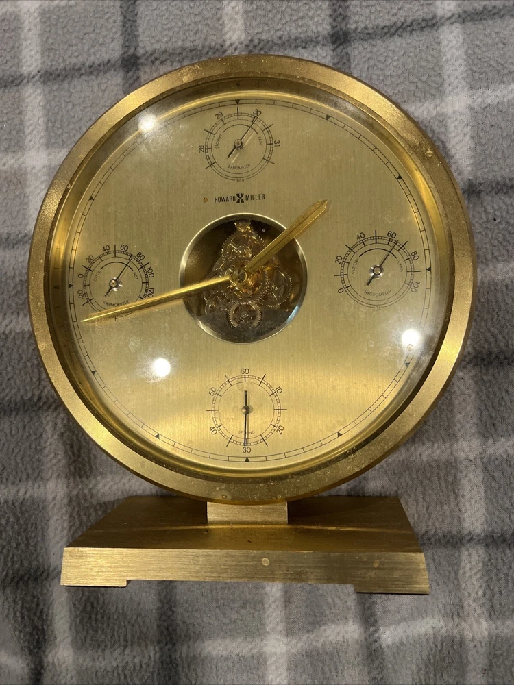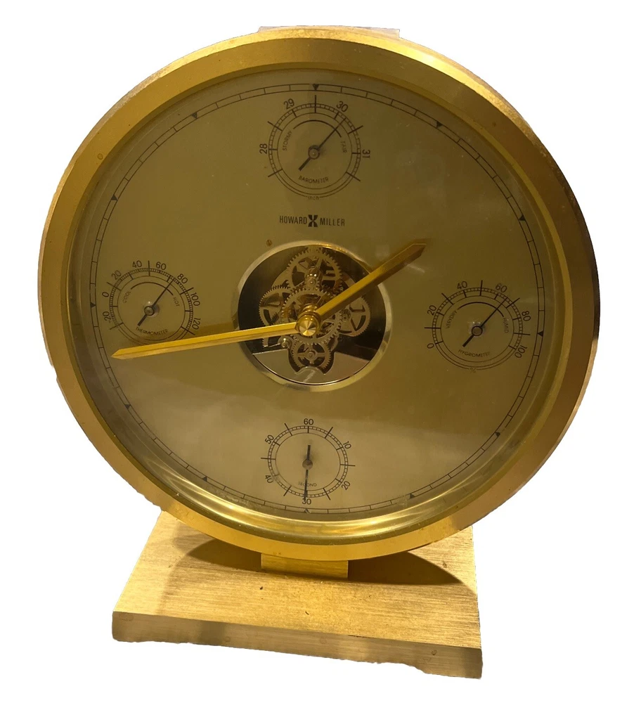 This vintage Howard Miller brass weather station clock is a stunning piece for any room. The footed round top gold gilt metal case exudes art deco mid century modern nouveau style. Measuring 9 inches tall x 7 3/4 inches wide, this clock features a barometer and thermometer hygrometer for weather forecasting. The analog display and metal dial with open escapement skeleton movement add to its beauty. The clock movement is brass mechanical or quartz battery powered ,The clock is a great and unique collectible item with original vintage features and is perfect for antique enthusiasts.