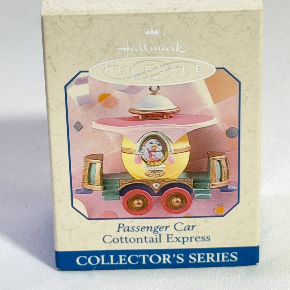 Add some vintage charm to your Easter decorations with this Hallmark ornament from the 1998 Cottontail Express Passenger Car Series #3. The colorful resin ornament features a cute Easter theme and is perfect for adding to your spring decor. The small size of this ornament makes it easy to display on your tree or in your Easter basket. This is a great addition to any collection and a must-have for fans of vintage Hallmark ornaments. Celebrate Easter with this charming and timeless piece. Excellent condition