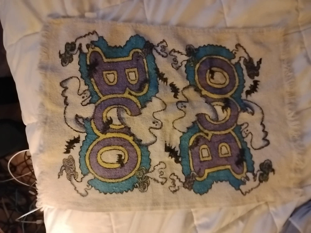 This vintage Halloween hand towel is perfect for adding a spooky touch to your kitchen. Featuring a cute design of ghosts and bats with the words "BOO" in bold letters, this towel is sure to make your guests smile. Made of soft cotton material, it measures 20 inches in length and 15 inches in width, with a thickness of 0.1 inch. The towel is rectangular in shape and comes in a set of one. It is suitable for use by teens, boys, adults, unisex babies and toddlers, girls, and kids. The theme of the towel is Halloween, and it was manufactured between 1980 and 1989. Add this unique piece to your collection of Halloween decorations today! It has no stains but doesn't look brand new since it's authentic and vintage it looks as it should, reference pictures to clarify.