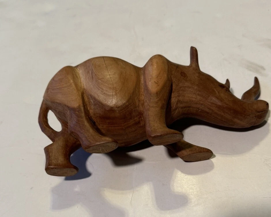 Add a touch of the wild to your home decor with this vintage hand carved teak wood rhinoceros sculpture figurine. Measuring 8 inches in length and 4 inches tall, this beautiful piece features intricate carvings and a stunning wood grain pattern. The medium-sized figurine is perfect for any room in your home and looks great on a shelf or table. The African-style sculpture is handmade from wood and depicts an abstract art subject of a rhinoceros. It is an original piece from the late 20th century, specifically from the years 1990-1999. The figurine is unboxed and comes from a collection of animal sculptures and figurines. Don't miss out on the chance to own this unique and beautiful piece of decor!