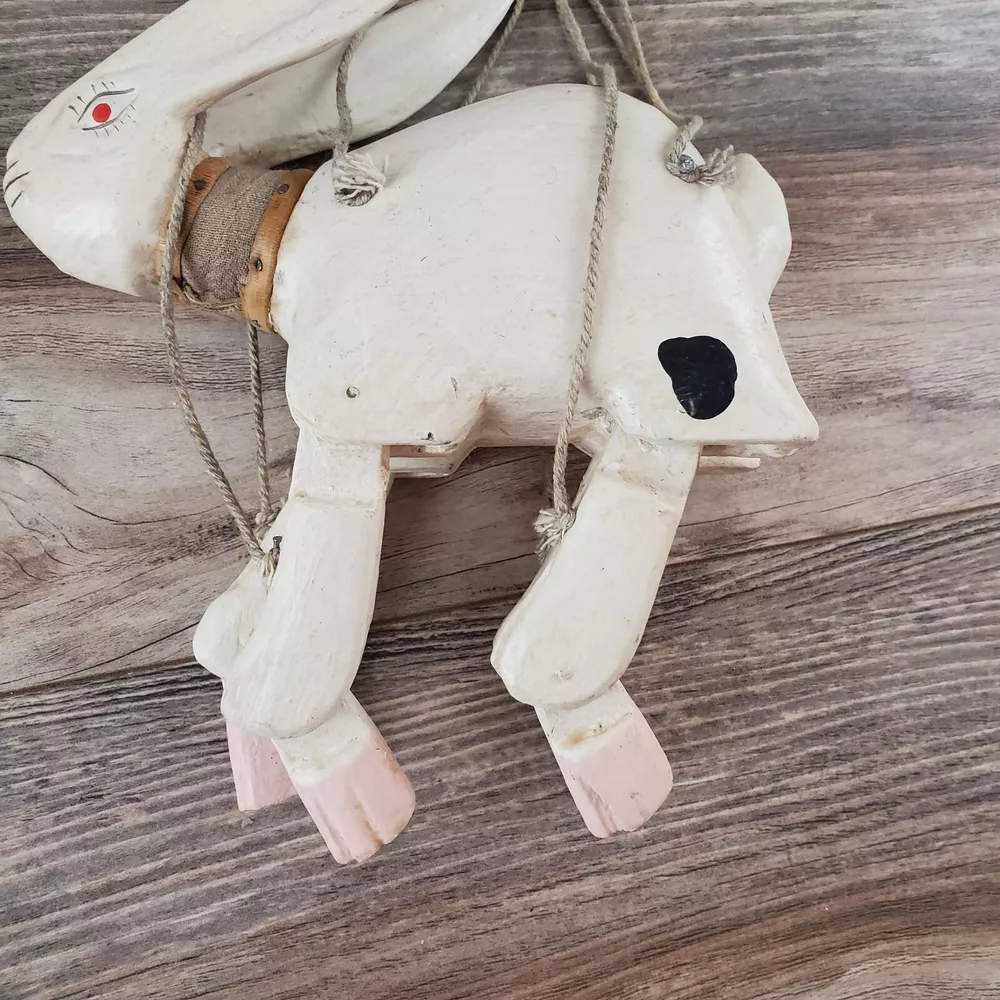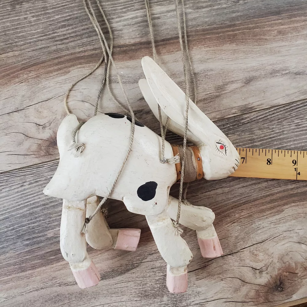 Vintage Hand Carved Wooden Rabbit Bunny Marionette String Puppet Farm Folk Art Well loved, but with no obvious flaws or damage. This item does have a smell, depending on how sensitive you are to smells. I'm not certain, but if I had to guess I'd say it was a smoke smell. I'm fairly sensitive to smoke smell and will often throw items away if I find they smell of smoke. This item sat on my desk and I did not notice the smell until I put my nose to the item itself. If you are very sensitive I would avoid the item for that reason. Other than that, there is just general wear and signs of age. I am unsure on the actual date, but it does appear to be very old. Please view the photos carefully for condition details. Measurements are in the photos. Don't forget to check out the other items in my shop. I'm getting in new fun things all the time. Thank you for looking! Have a great day!