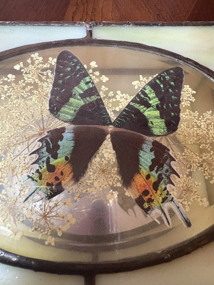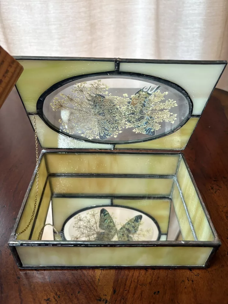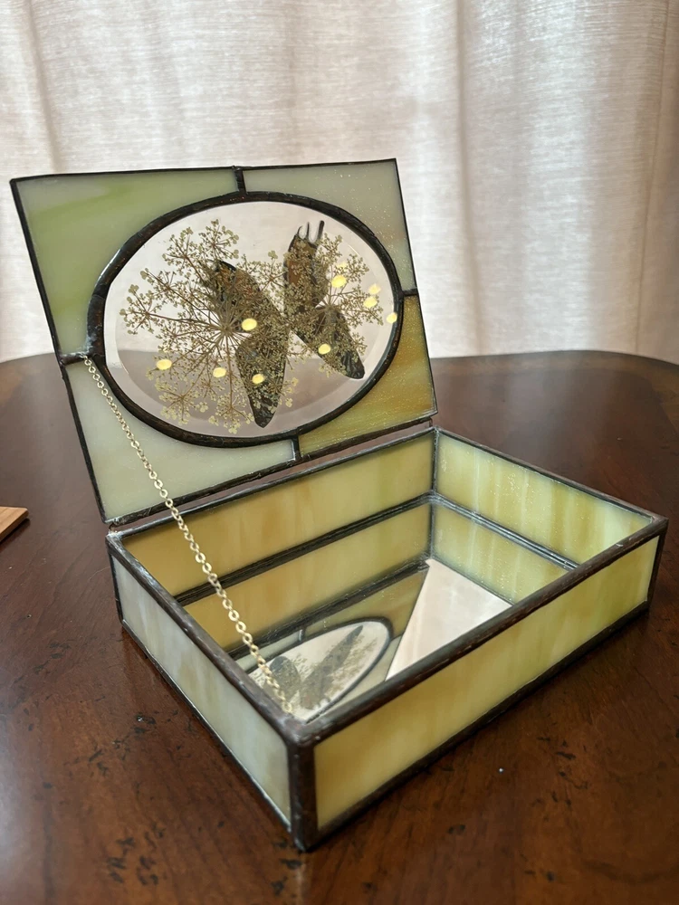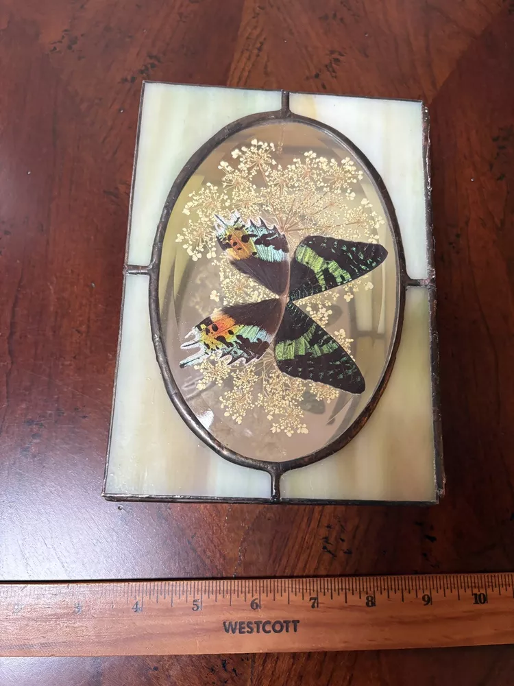 Beautifully hand-crafted jewelry box decorated with butterfly and pressed plants. It is in excellent condition. Measures ( approx.): 7" L, 5.25" W. It has the original sticker. Please see photos for more details. Please note that the item is vintage and may show signs of wear. We have done our best to honestly and accurately describe and photograph the item, including possible flaws. What you see are the actual photos of the item being sold. If you have any questions regarding the item, please ask! We DO NOT SELL outside United States. SHIPPING The item will be shipped within three business days after receipt of payment. We ship via USPS to any location within the 48 continental United States, NO INTERNATIONAL SHIPPING. Shipping is calculated by EBAY based on the weight and size of the item plus packaging. We can combine shipping in case you buy multiple items that can be safely shipped together. Thanks for looking!