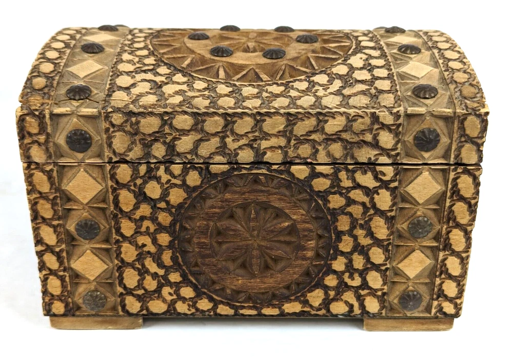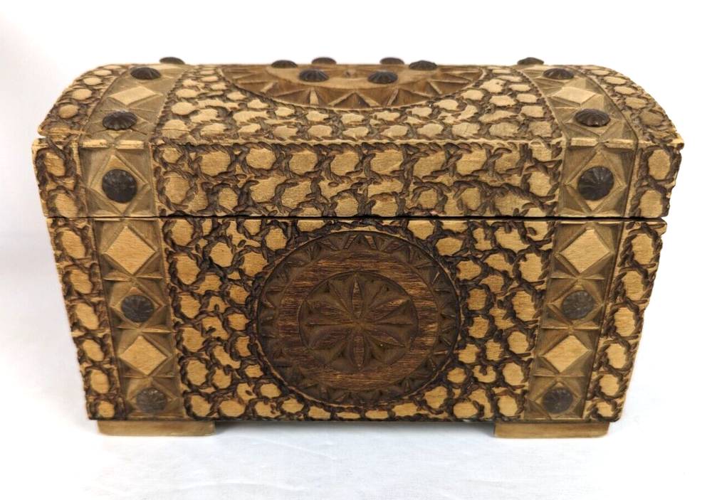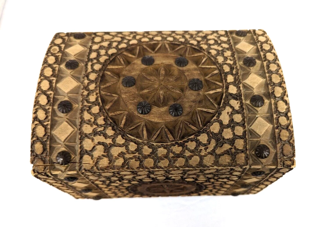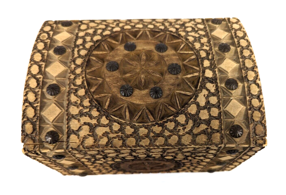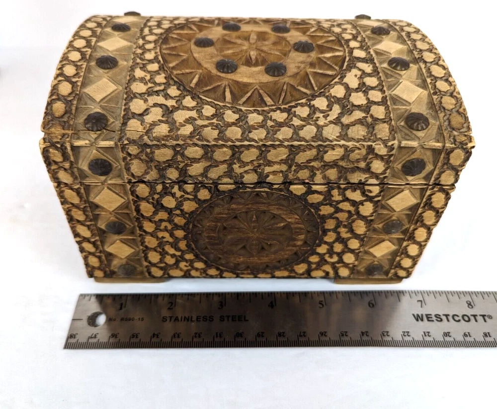 Antique Vintage Intricately Hand Carved Domed Top Jewelry Keepsake Box. Very detailed Completely hand carved with an intricate design with steel studs and excellent joinery. Box measures approx 7" by 4.5" and is a little over 4" in height. Dates to the Mid 20th century and is in very good condition with one very small tight age crack in the front left hand corner of the lid (see photos) If you have any questions just ask.