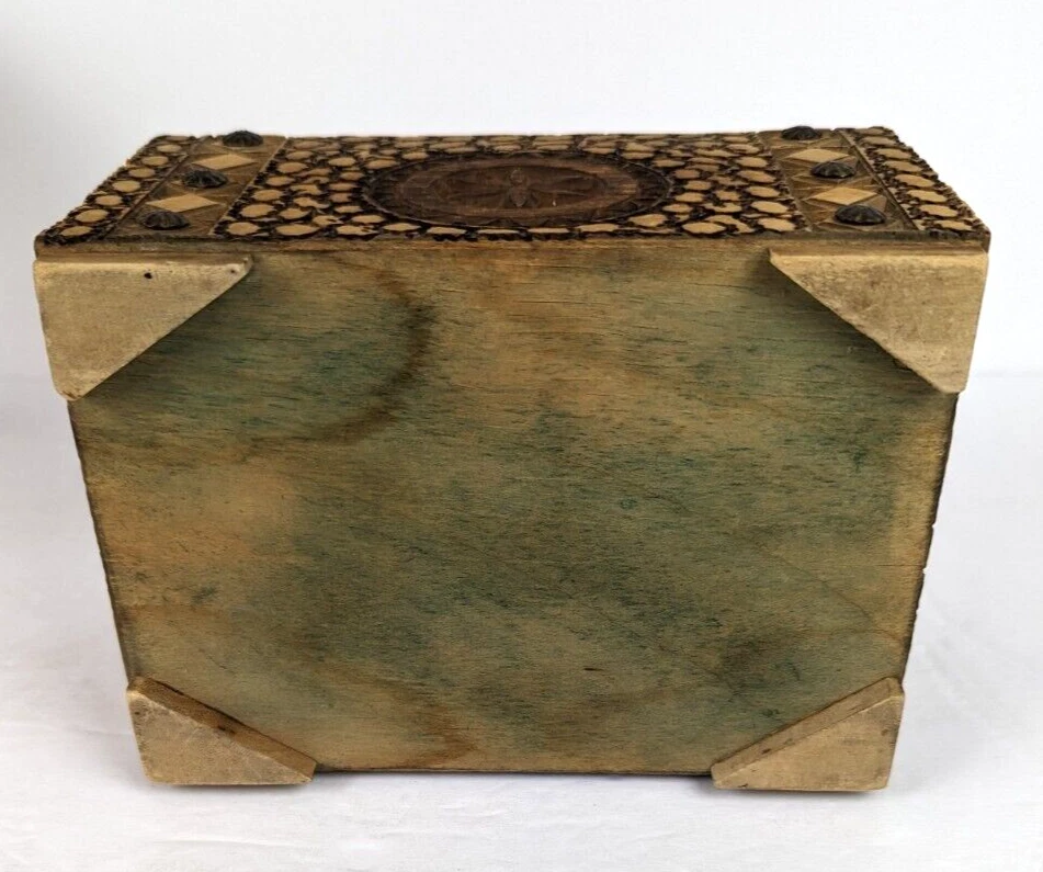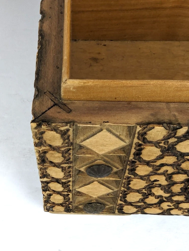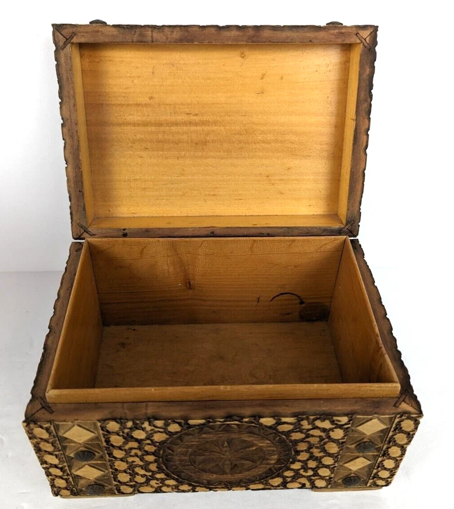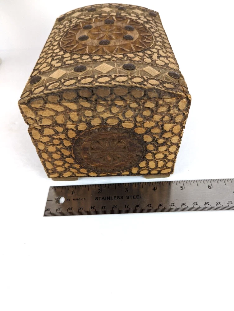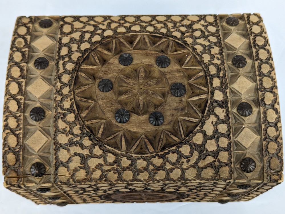 Antique Vintage Intricately Hand Carved Domed Top Jewelry Keepsake Box. Very detailed Completely hand carved with an intricate design with steel studs and excellent joinery. Box measures approx 7" by 4.5" and is a little over 4" in height. Dates to the Mid 20th century and is in very good condition with one very small tight age crack in the front left hand corner of the lid (see photos) If you have any questions just ask.