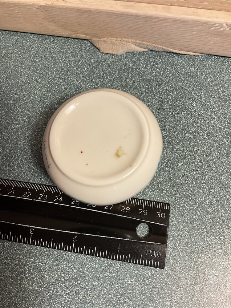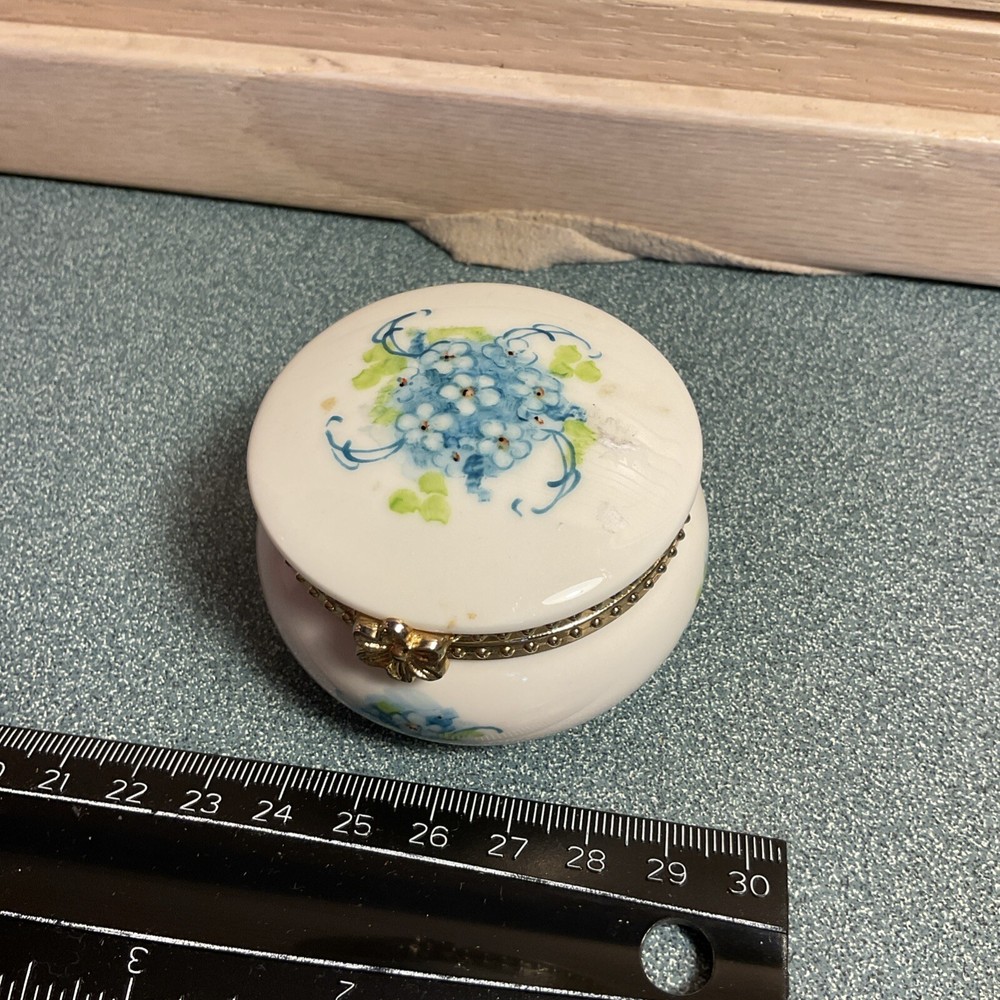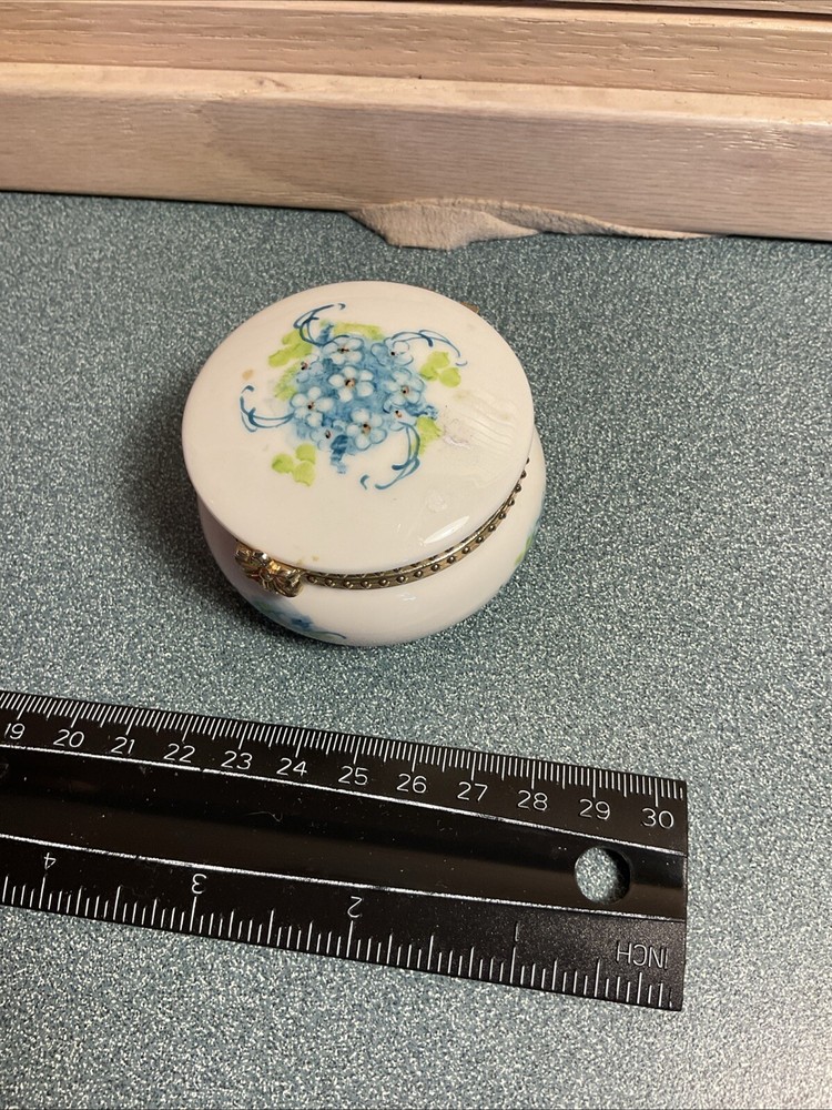 This vintage trinket box is a beautiful addition to any collection. The porcelain box features a round shape and a delicate floral pattern that is hand painted on the glossy surface. The box is small, measuring 2 inches in length, height, and width, and weighs 6 ounces. It has a press fastening closure and is suitable for all occasions. The trinket box is in excellent condition and is perfect for storing your precious items. It has a Victorian style and is a great collectible item. Clean the box with warm water and care instructions are included. The box is a multicolor and is perfect for any room in your home.