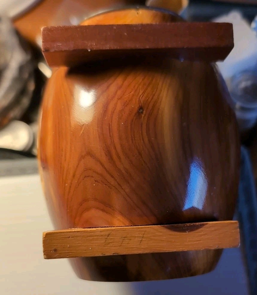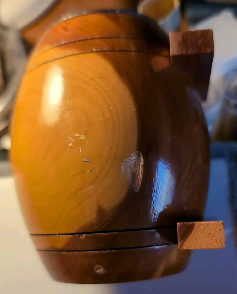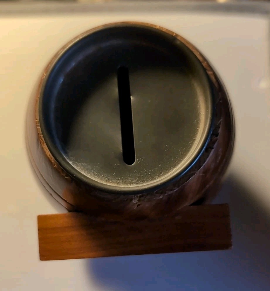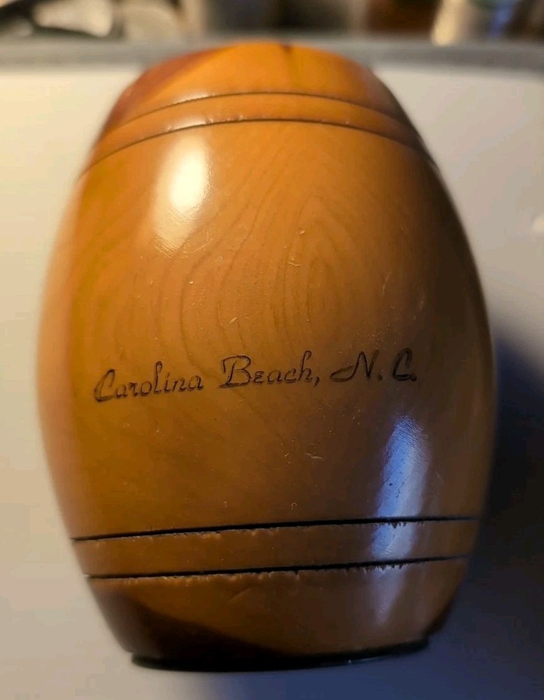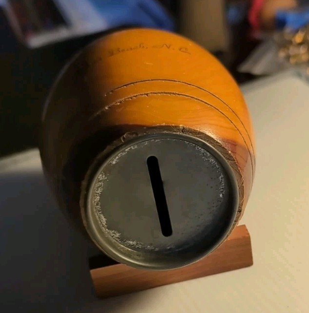 This vintage pre-owned handcrafted wood barrel shape bank is a unique collectible item from Carolina, N.C. measuring 3"X4". The bank features a piggy design and is an original piece made in the United States. It is a great addition to any collection of still banks and other collectible items. See scans to help see the condition.