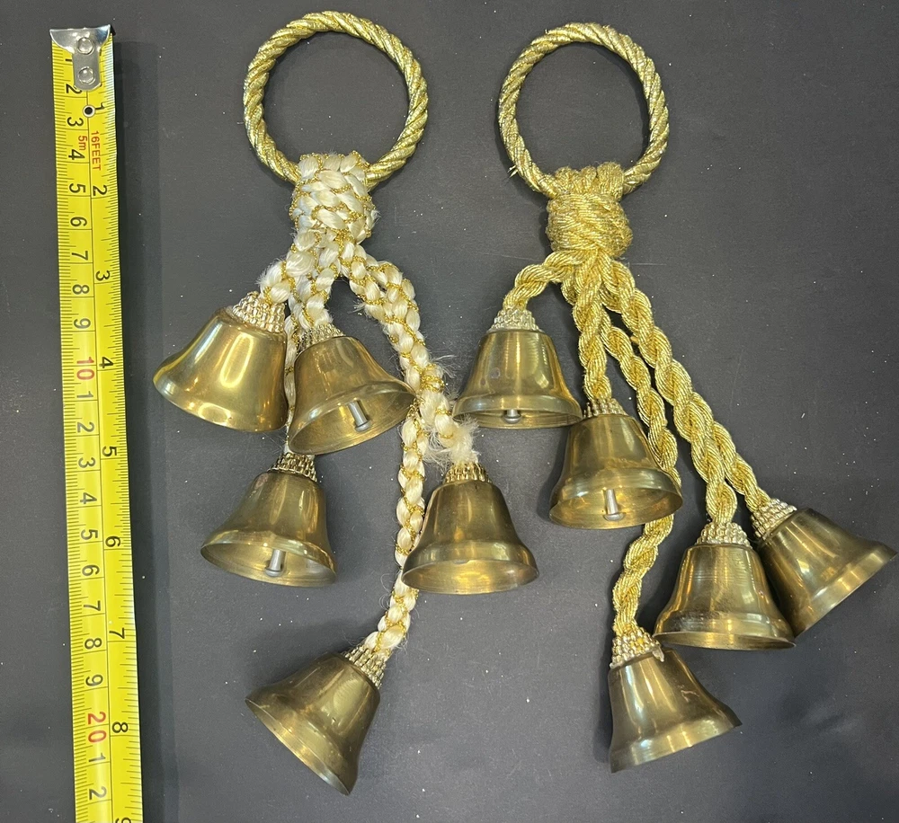 This vintage lot includes two hanging brass bells perfect for the holiday season, particularly Christmas. The bells are a classic gold color, adding a festive touch to any decor. Made of brass, these bells exude a timeless charm and can be a wonderful addition to your holiday decorations. Enhance your Christmas festivities with these vintage brass bells that capture the spirit of the season.