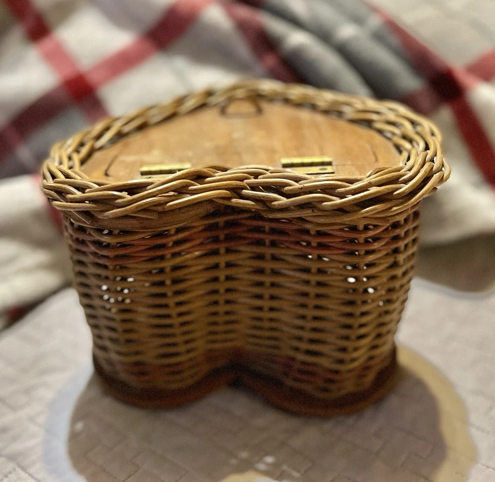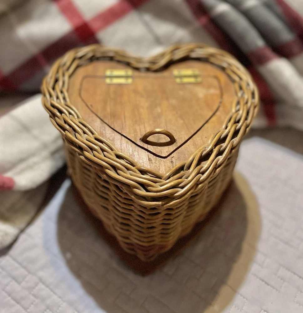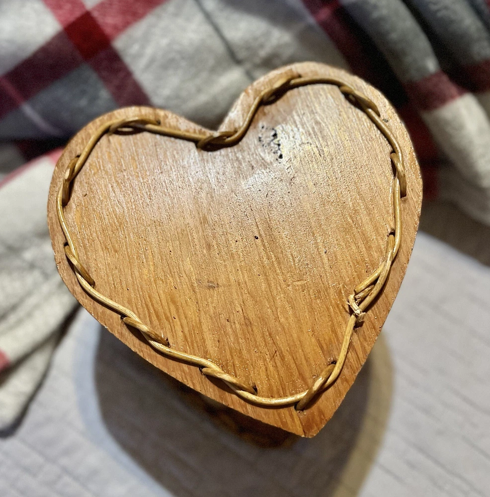 Heart Shaped Wicker and Wood Trinket Box Vintage Handmade. Condition is Used. Shipped with USPS Ground Advantage.