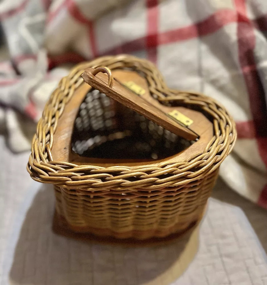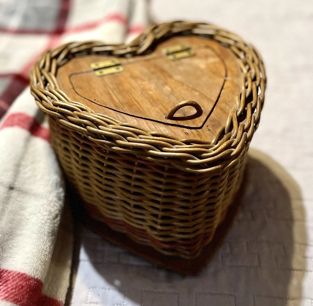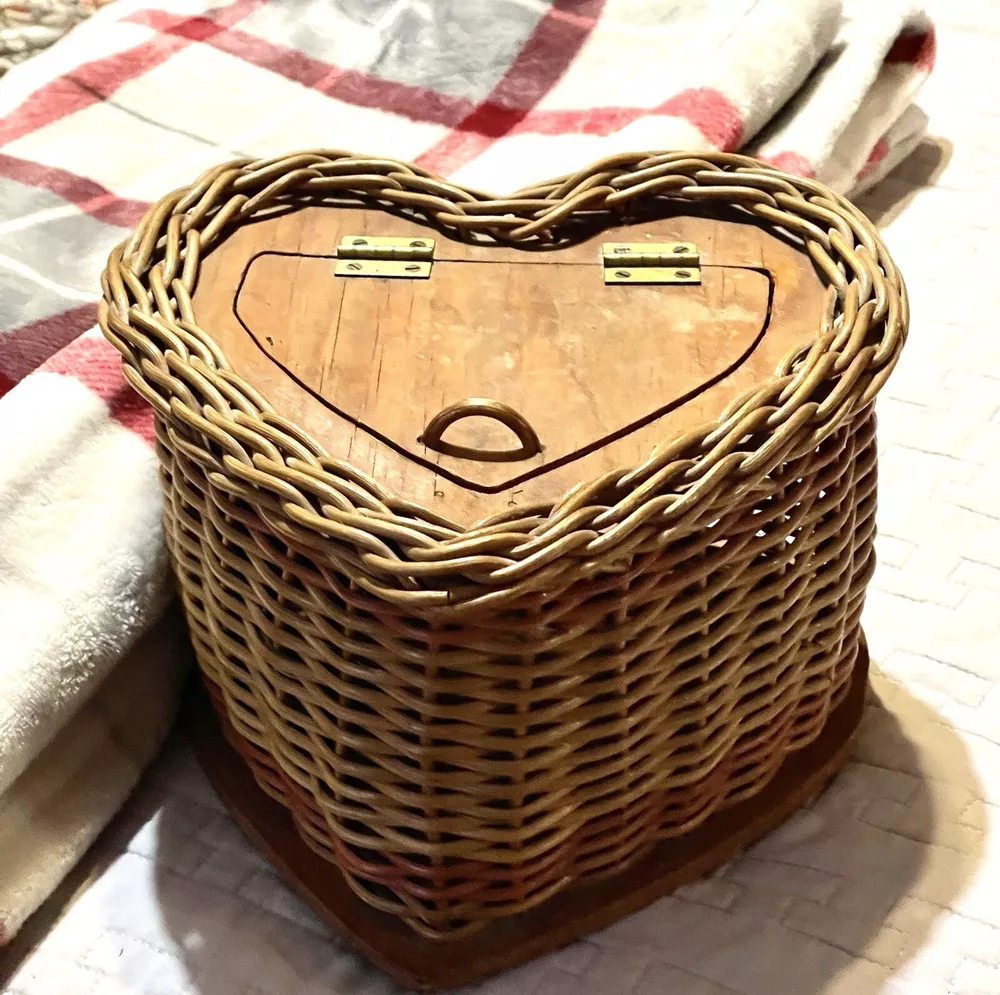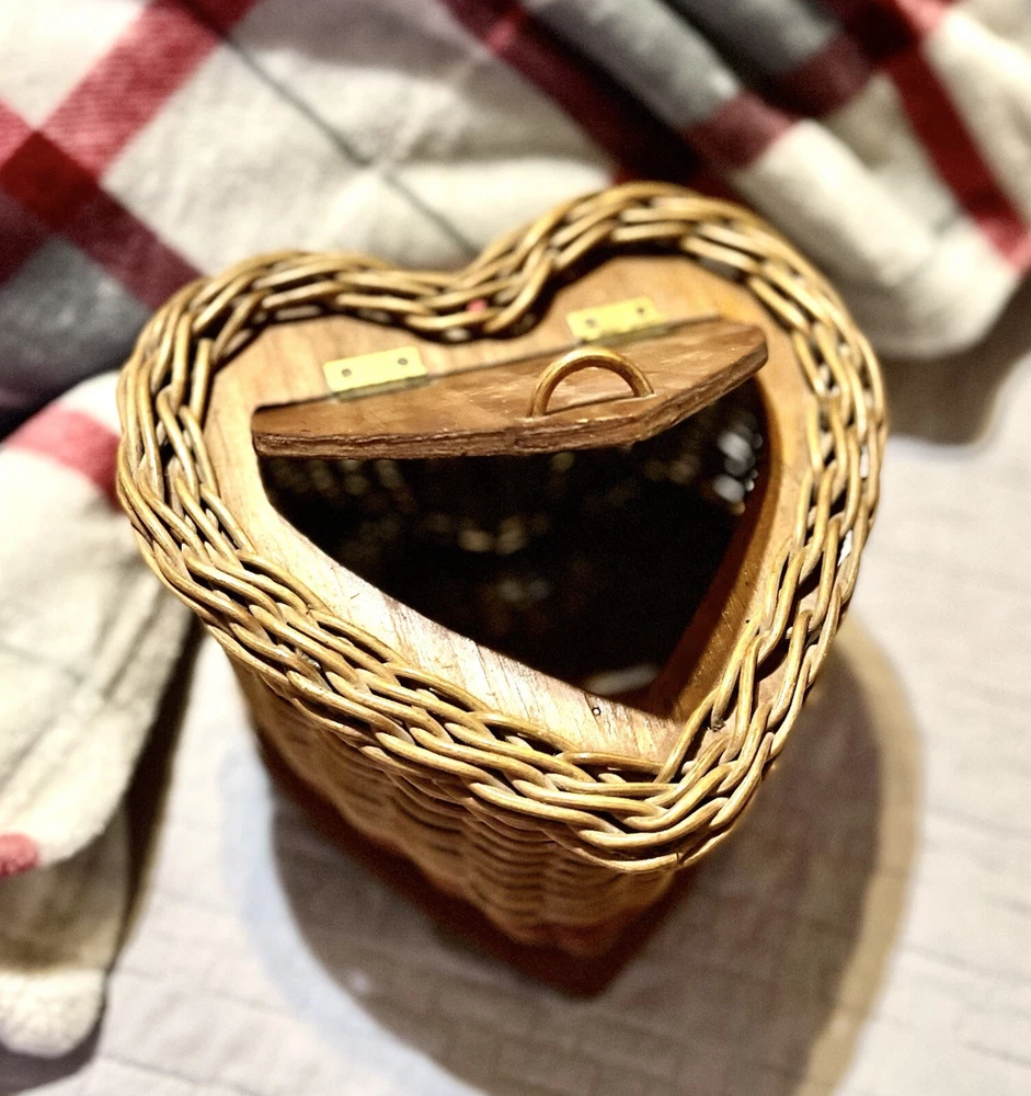 Heart Shaped Wicker and Wood Trinket Box Vintage Handmade. Condition is Used. Shipped with USPS Ground Advantage.