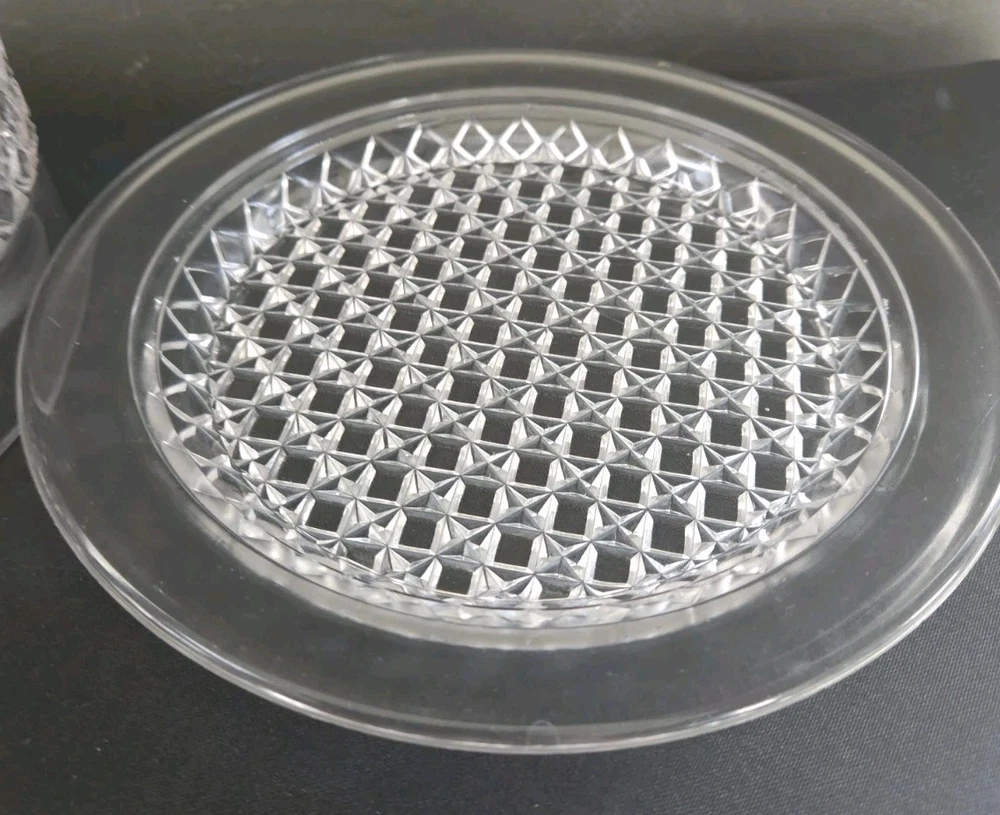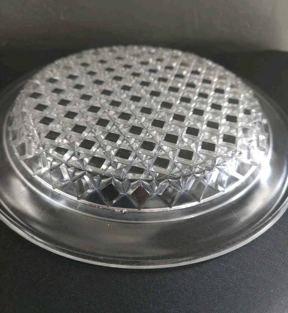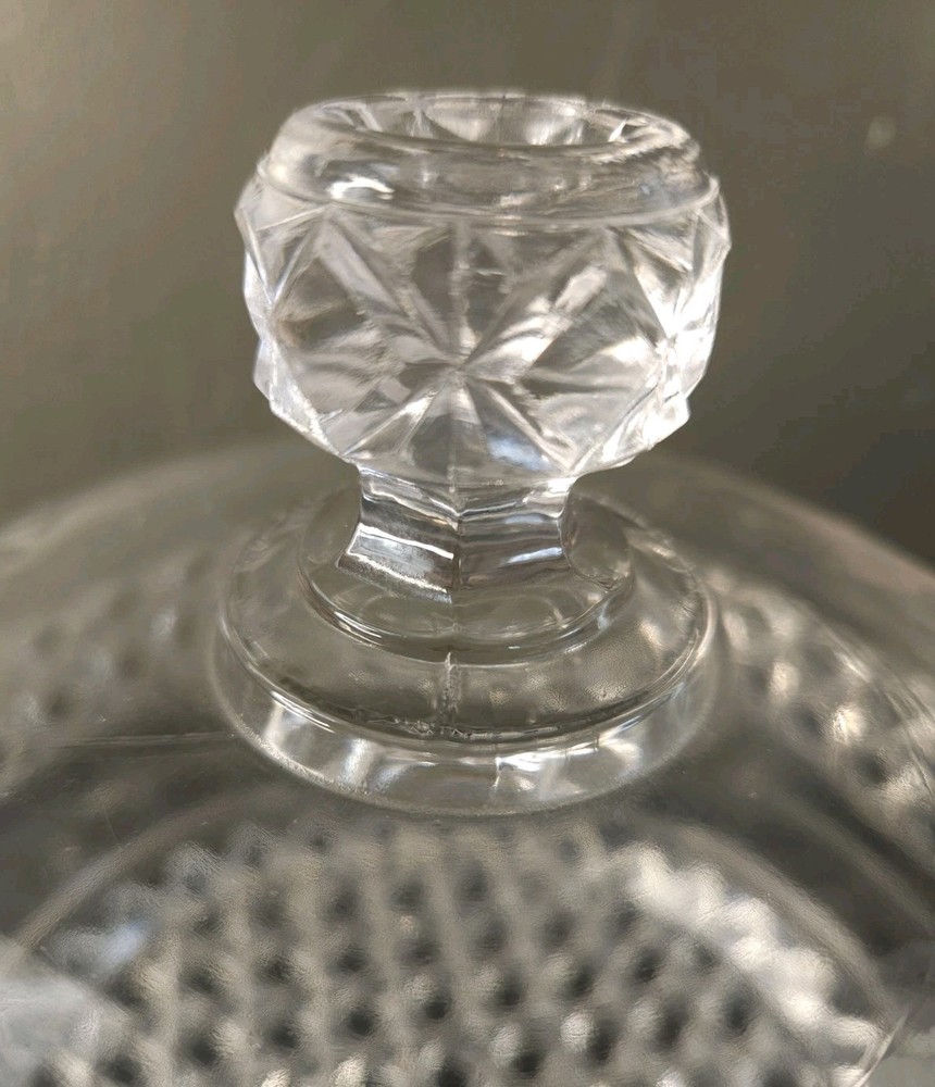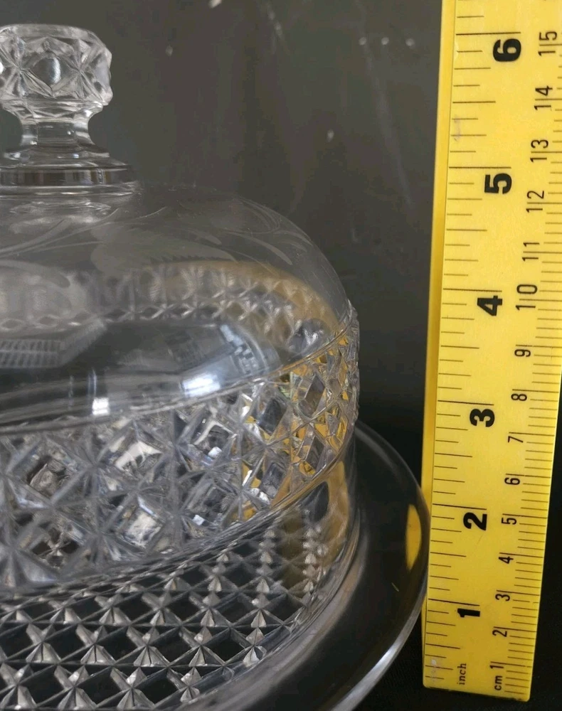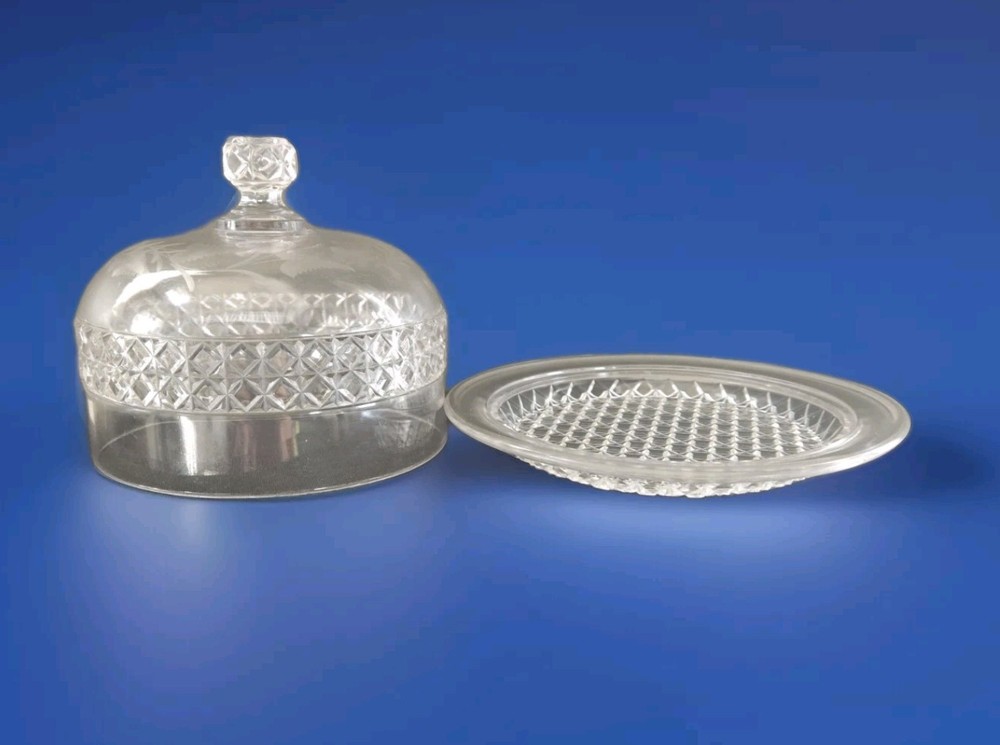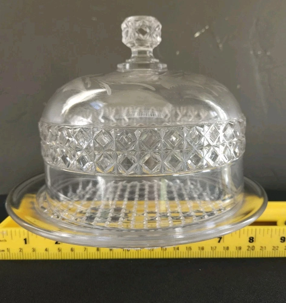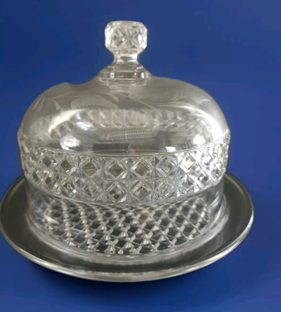 This vintage crystal glass round dome covered butter/cheese dish features a fern pattern, adding a touch of elegance to any dining table. Made of clear crystal glass, this original vintage piece is perfect for storing and displaying butter or cheese. Its round shape and heavy construction make it both functional and stylish, adding a timeless charm to your kitchen decor. Perfect for serving at the table or as a decorative piece in your home.