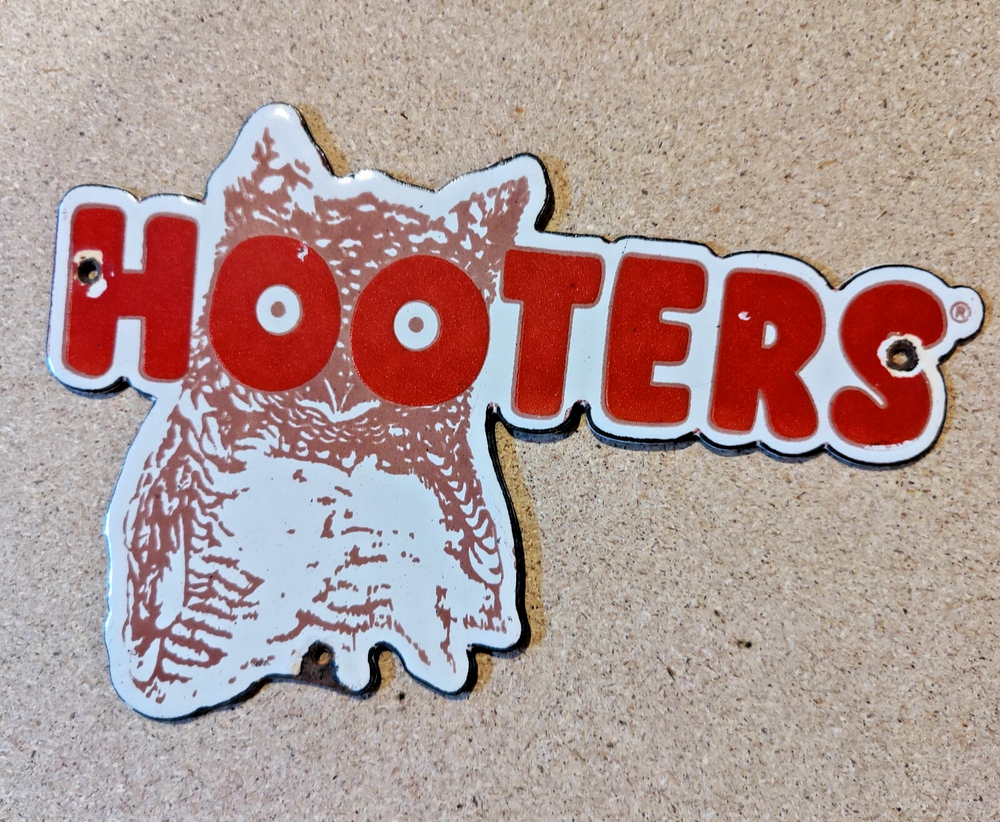 Delve into the charm of vintage Americana with this authentic HOOTERS Restaurants cat porcelain enamel metal sign. Measuring 9" x 6", this original piece hails from the heart of the United States, embodying the spirit of the Gas & Oil theme with its vivid, multi-colored design. Crafted between 1930 and 1969, it is a true testament to the enduring allure of classic advertising. This sign is a prized collectible that captures the essence of the era with its enamel finish, a hallmark of quality and durability. It is a delightful find for enthusiasts of porcelain signs, original signs, and vintage advertising memorabilia, ready to adorn your space with a touch of nostalgia and historical flair.