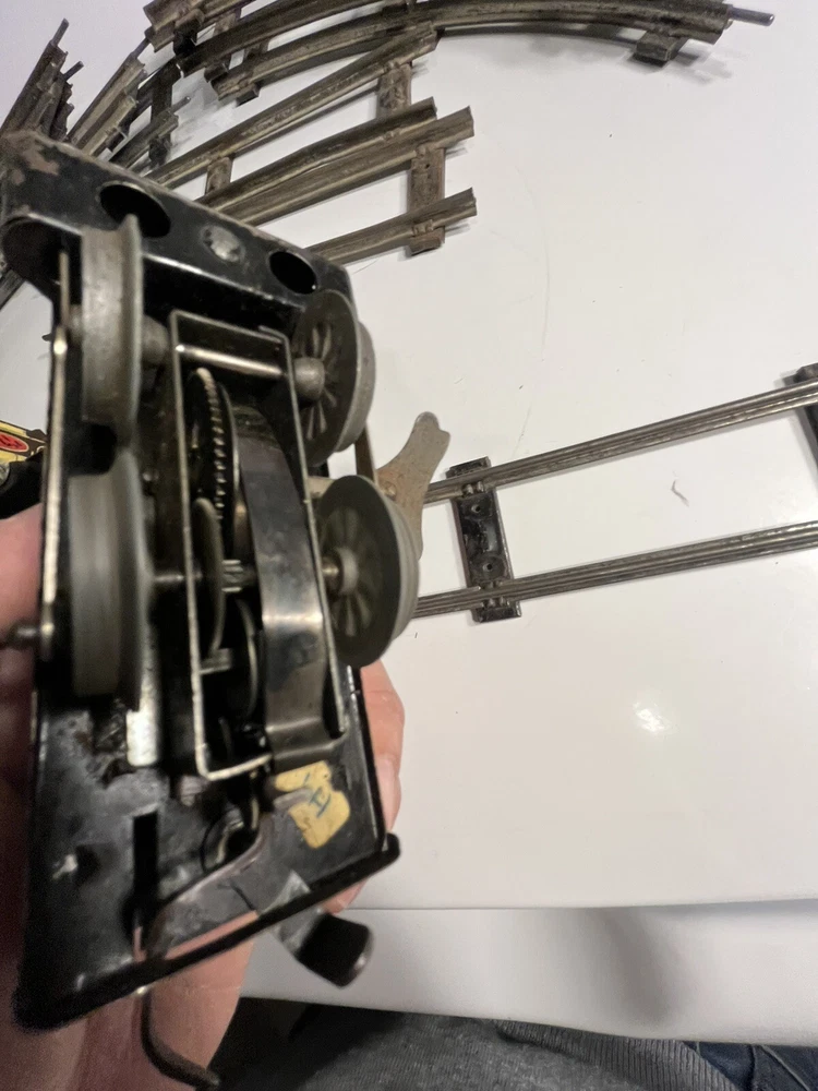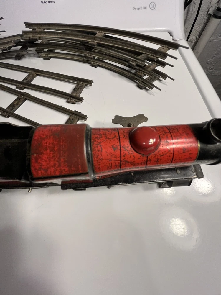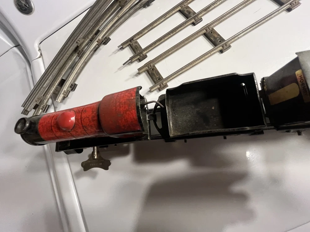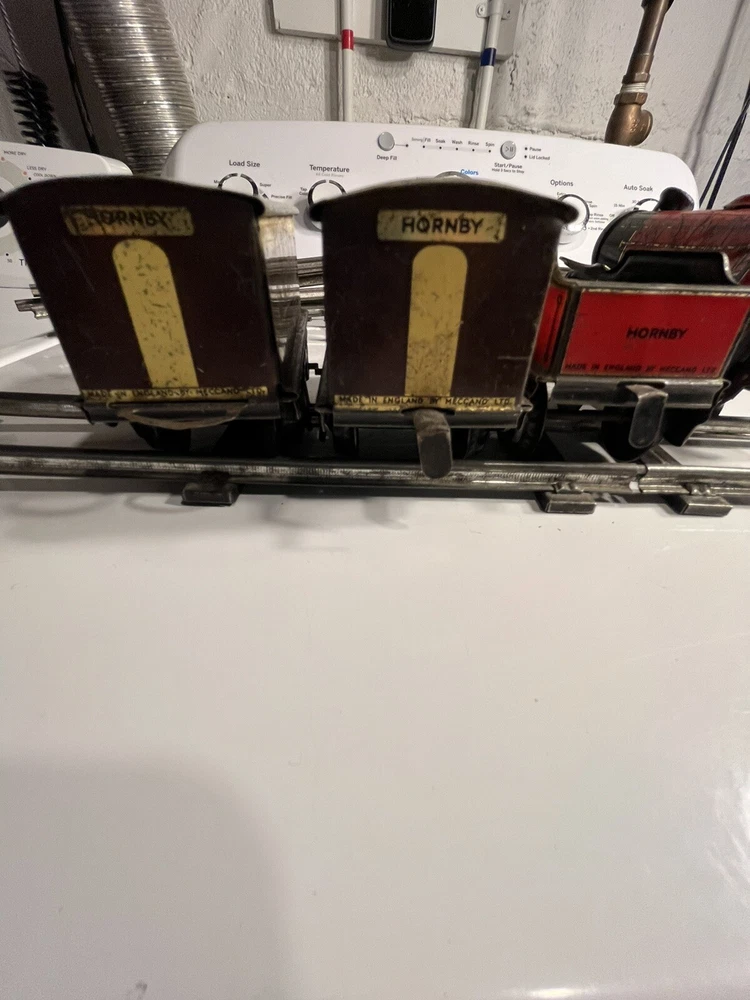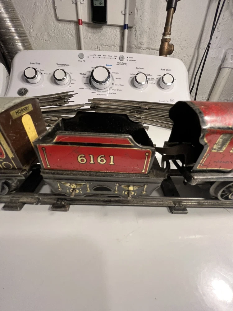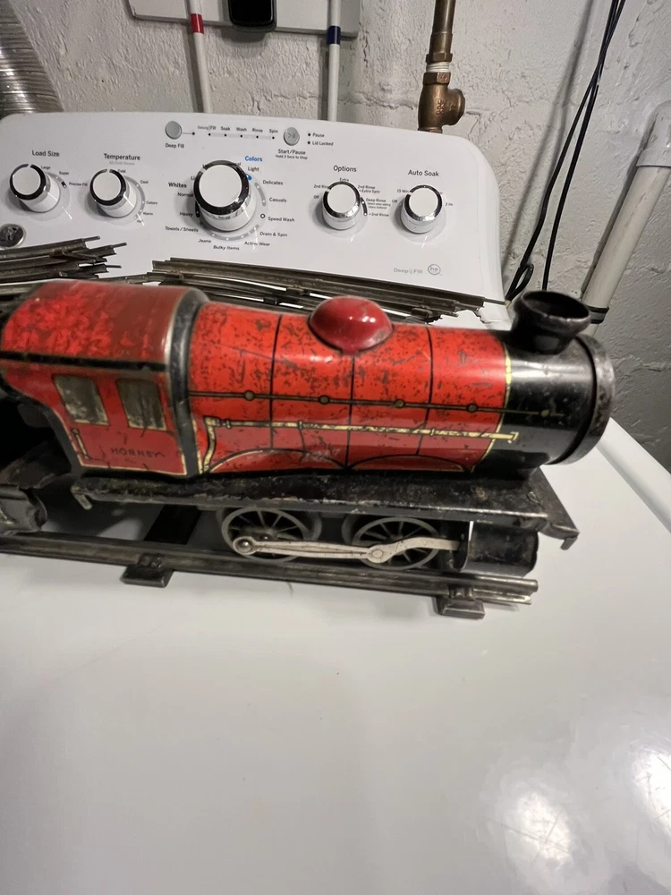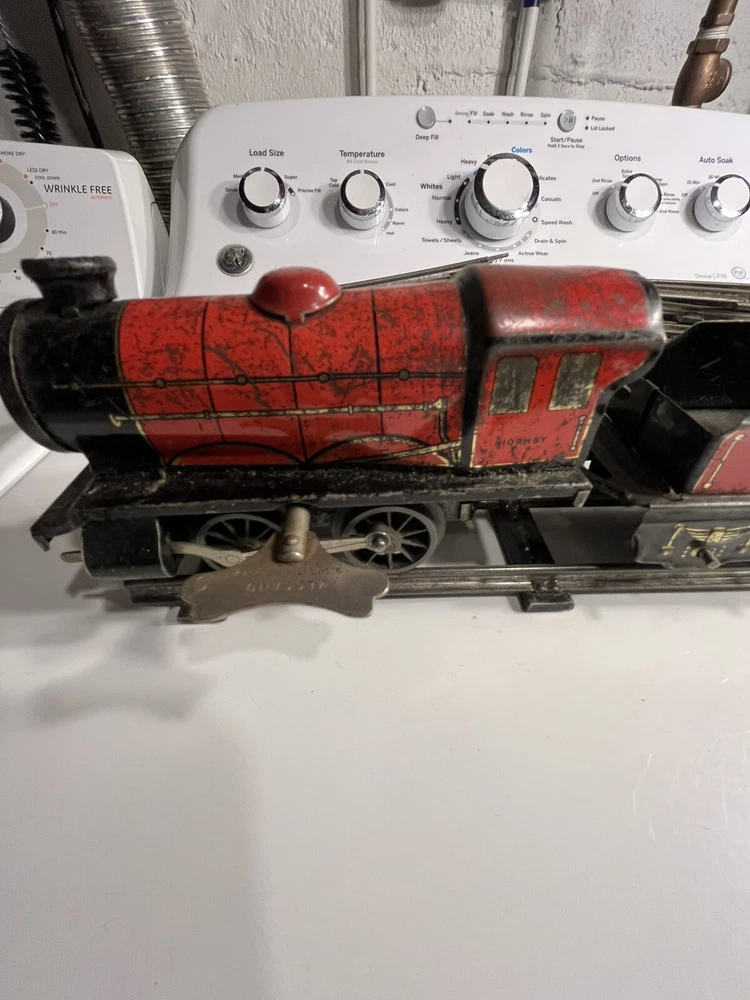 Offering vintage Hornby tin wind up train set. Engine is in working order. Includes 8 curved track and 4 straight. Please view pictures sold as is.