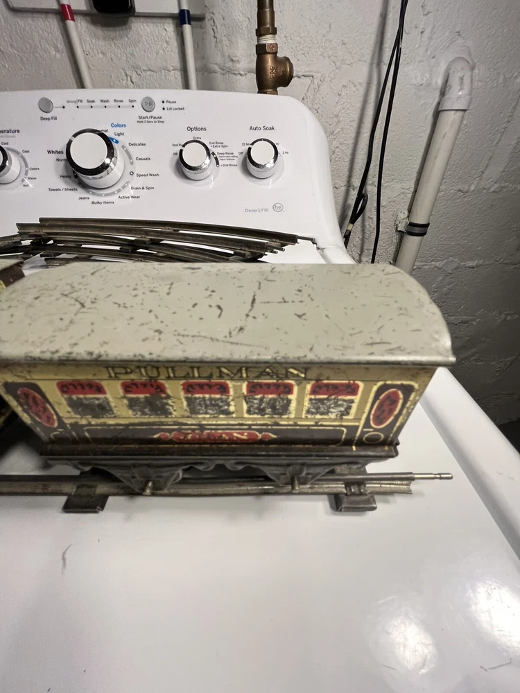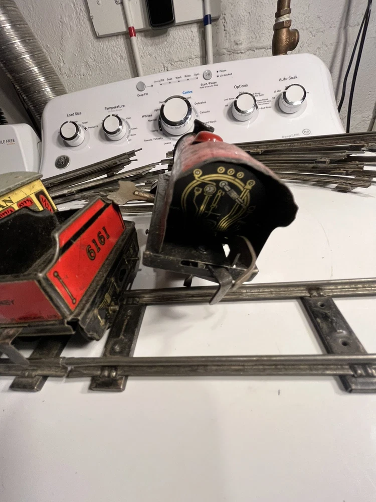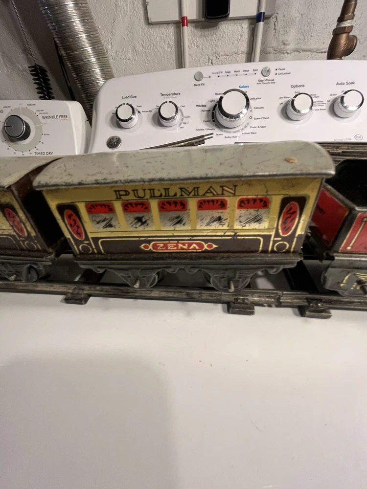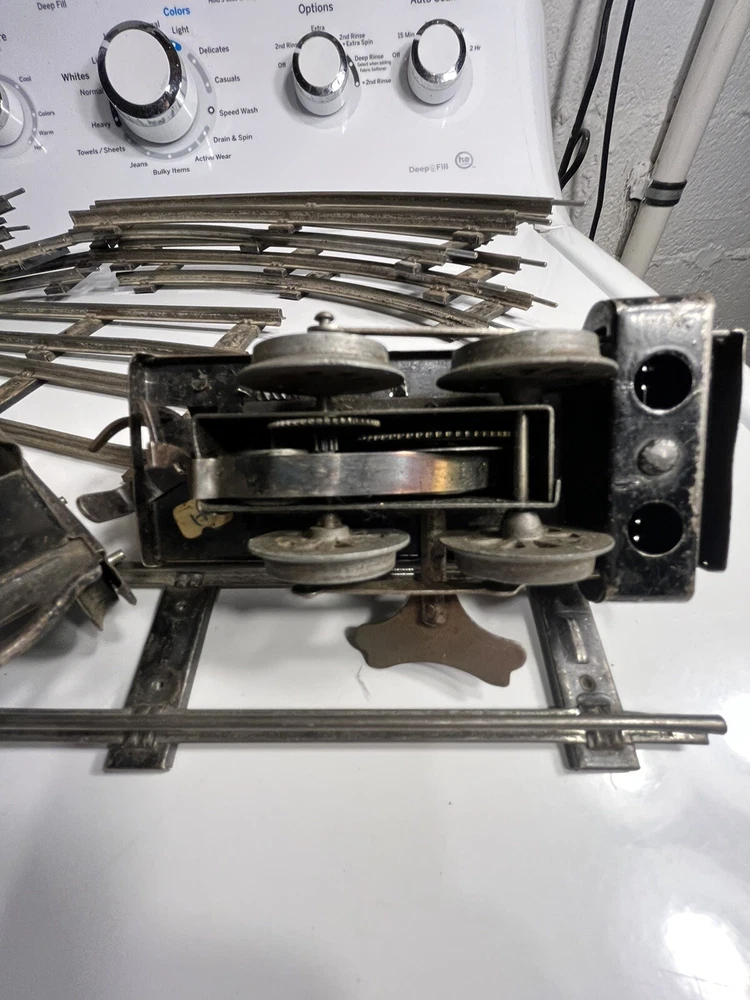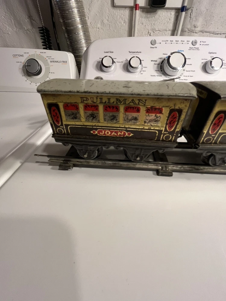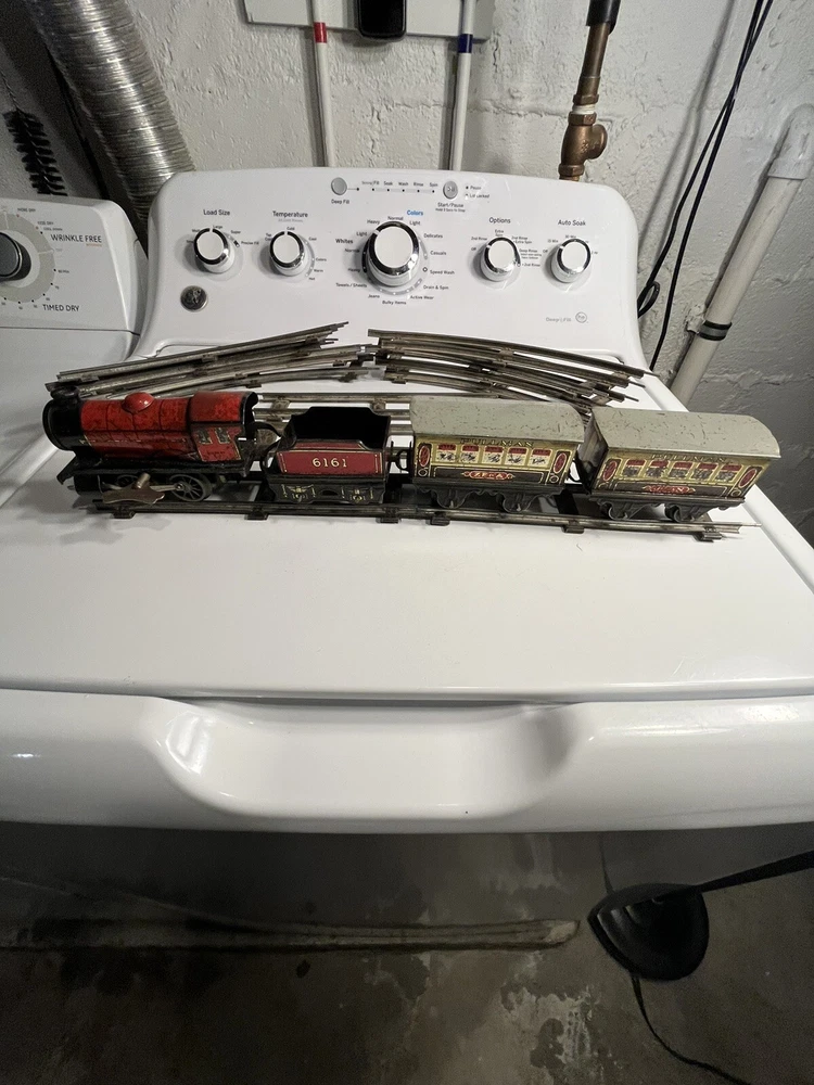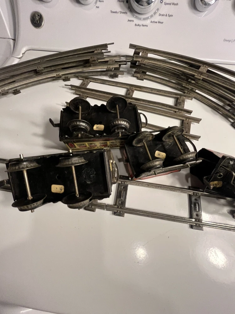 Offering vintage Hornby tin wind up train set. Engine is in working order. Includes 8 curved track and 4 straight. Please view pictures sold as is.