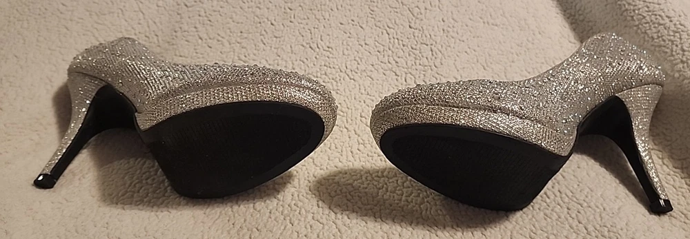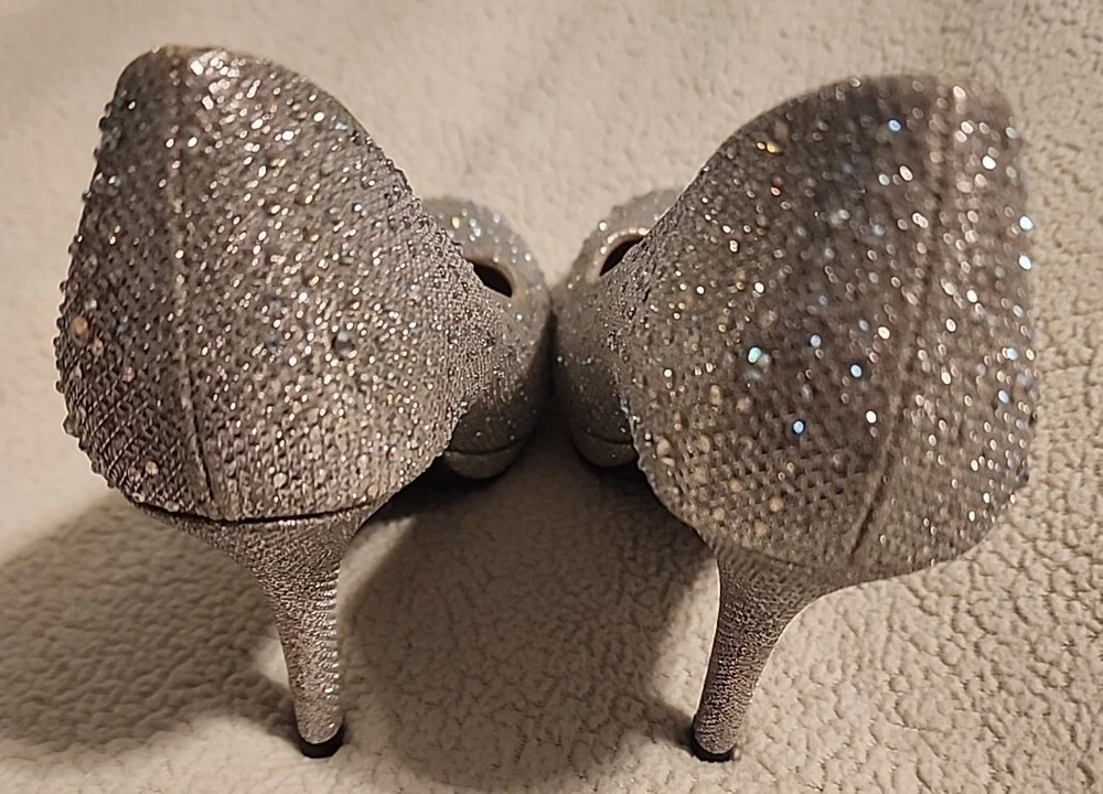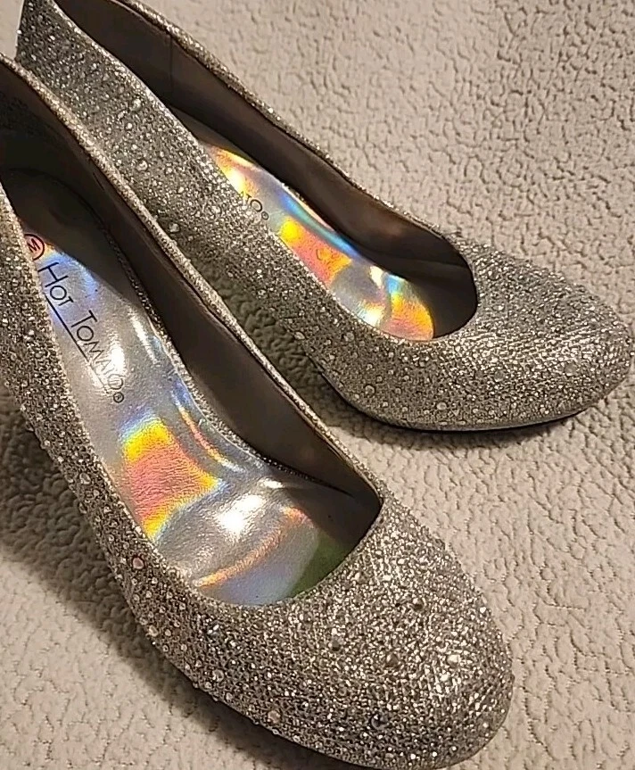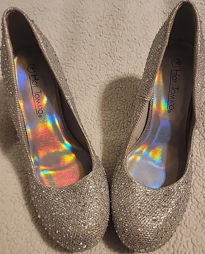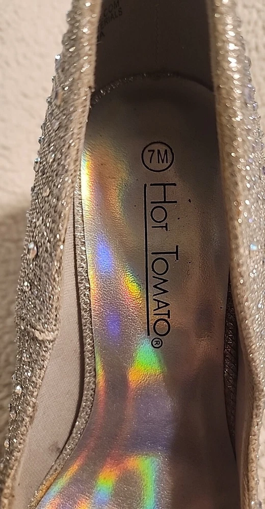 Excellent shape with only minimal signs of wear. Add some sparkle to your step with these stunning gold pumps from Hot Tomato. The jeweled pattern and sequins will catch the light and turn heads at any occasion. Slip them on with ease thanks to the slip-on closure, and enjoy the comfort of the synthetic upper and insole material. These heels are perfect for adding some glamour to your travel, wedding, party, cocktail, formal, or business outfit. The 3.5-inch stiletto heel adds height and elongates your legs, while the reflective features make sure you shine wherever you go. These pumps are suitable for fall and winter seasons, and their metal theme will add some edge to your wardrobe.