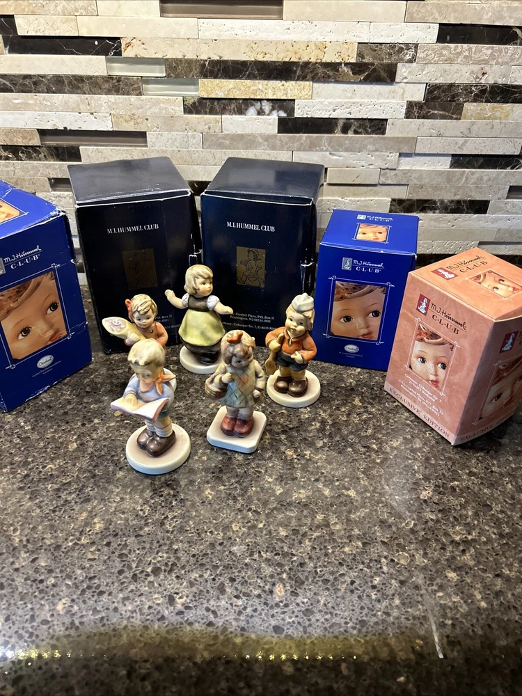 5 Hummel club figurines include: “Spring Waltz” #912B 4inches “I Brought you a Gift” #479. 3 7/8 inches “A Sweet Offering” #549 3 1/2 inch “First Mate” #2148 4 inch “Honor Student” 2087. 4 inch Excellent condition. no chips cracks repairs or crazing Comes from smoke free environment and was cared for in curio cabinet. If you are unhappy with your purchase please contact me so we can resolve any issues you may have. Please leave feedback so we know the transaction is complete and that your satisfied with your purchase. Thank You!