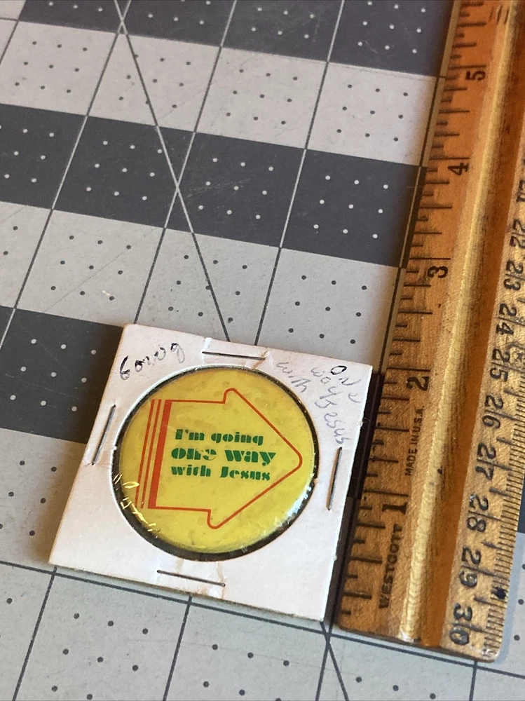 This vintage pinback is a must-have for collectors who appreciate religious themes. The well-crafted pin features the phrase "I'm Going One Way With Jesus" in bold letters, making it a unique and rare item. This pin is a great way to show your faith and commitment to your beliefs. The pinback is a perfect addition to any collection of religious memorabilia or as a gift for a loved one. It is a timeless piece that will be treasured for years to come. Don't miss out on the opportunity to own this one-of-a-kind item.