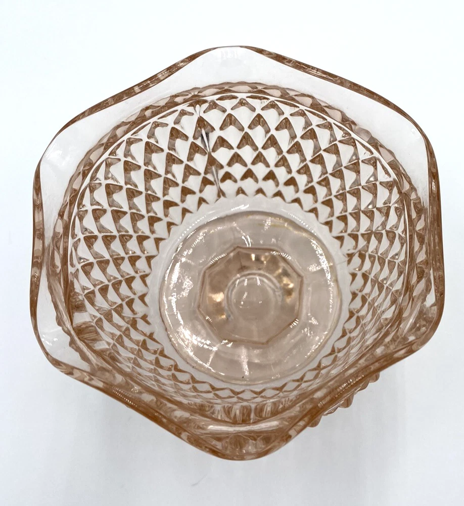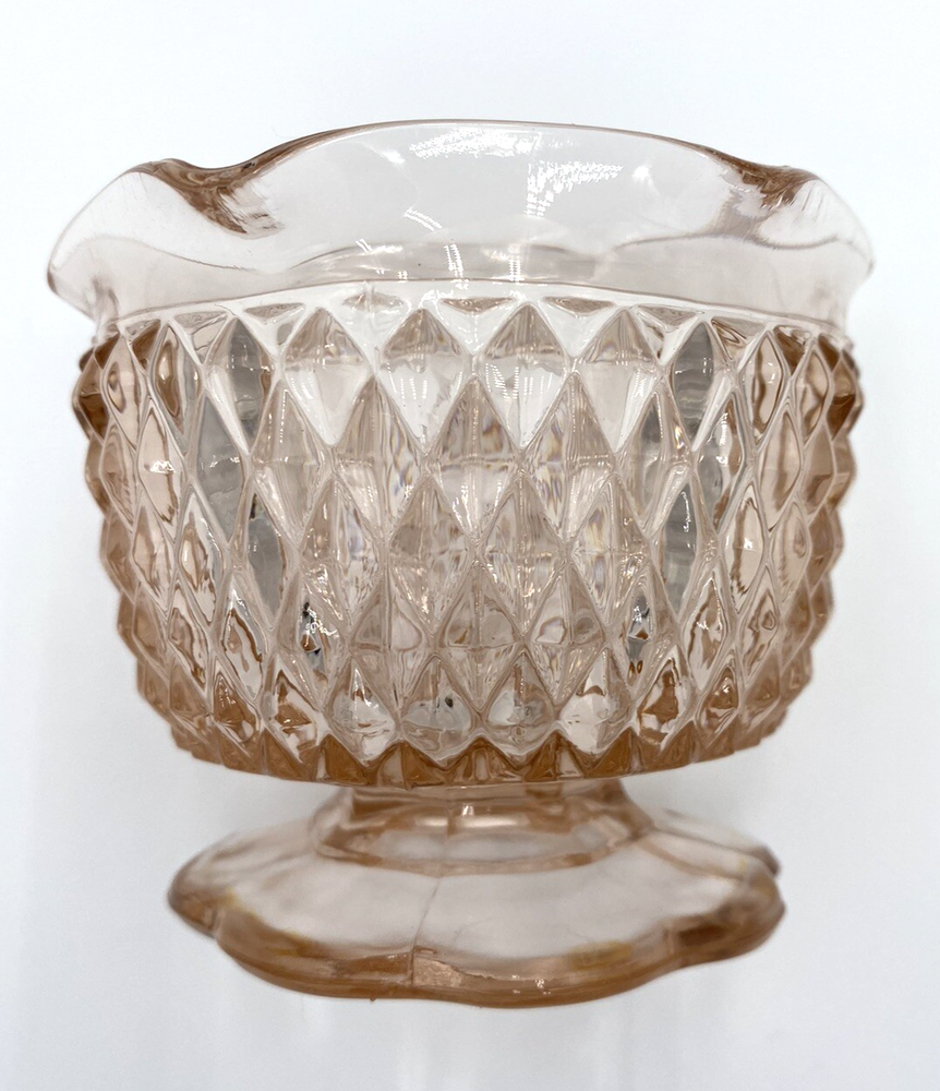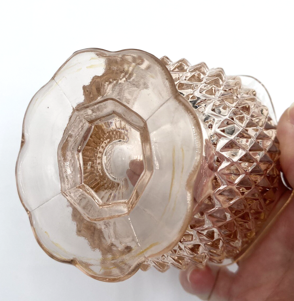 Add a touch of vintage charm to your table setting with this beautiful pink mayonnaise bowl from Indiana Glass. The Diamond Point pattern and flower pedestal base make it a stunning addition to any collection. The bowl measures 5 inches in diameter and 3.25 inches in height, with a weight of 11.4 ounces.This original piece from the 1930s is made of high-quality glass and was manufactured in Dunkirk, Indiana during the Depression. This bowl would also work beautifully as a candle holder, using a wide short pillar candle. The mayonnaise bowl is in excellent condition. There are no chips, cracks or signs of wear.