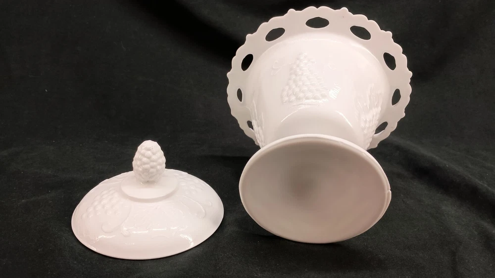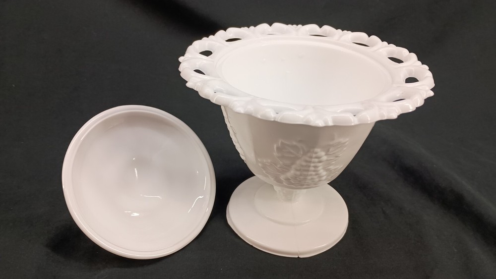 This vintage Indiana Glass compote is a beautiful addition to any collection. The open lace pattern on the milk glass gives it a unique and elegant look. The compote comes with a footed base and lid, making it perfect for serving or displaying. The white color of the glass adds a touch of sophistication to any table setting. Made of high-quality glass, this compote is durable and long-lasting. Ideal for any occasion, this piece is sure to impress. Thank you for visiting my listing today and thank you for your interest in this item! My goal is to have a pleasant transaction resulting in a satisfied customer. I hope any transaction between us leaves you with a feeling of confidence knowing you can trust me and the items I offer here. *Most if not all my listings are set to accept offers. Feel free to send an offer and I will be happy to consider it!! *Please contact me with any questions or concerns and I will be happy to help. *Always examine the photos carefully, and if in doubt, email me with any questions you may have. *Please note that condition statements are offered as a guide only. They will always be somewhat subjective and reflect our opinion, which may not necessarily agree with someone else's opinion. PLEASE READ: I aim to please and I want my buyers to have a positive transaction with me. If you have questions, concerns, or special requests related to any of my items I hope you will contact me so we can work them out to your satisfaction. I sell my items to give you a great item at a decent price while making a little profit at the same time. If you feel the item you are interested in is too pricey do not hesitate to send me a fair offer and I will consider it. My goal is to satisfy your needs and mine so both parties can benefit. SHIPPING: If you prefer a different shipping method or company please contact me and I will do all I can to make that happen. If you have concerns or requests about the packaging of your item contact me and I will do all I can to accommodate them. Shipping costs are based on location in each state or country, the costs always differ. After I have received your payment I will ship your item out within 3 business days or less excluding weekends and holidays. BEFORE PURCHASING & BIDDING: **Please see all the pictures. I do not have great photography skills but I try to get the most accurate photos I can. If you are unsure about something you see in a photo contact me so I can do what I am able to answer your concern about the item. **I cannot stress enough that if you have any questions or concerns please contact me before purchasing and bidding. Communication can solve so much. **As a customer myself, I understand the meaning of customer satisfaction and my goal is to have nothing but satisfied customers. If you are not unsatisfied with your purchase I ask that you please contact me so I can take care of your issue. My goal is for you to be 100% satisfied. INTERNATIONAL BUYERS WELCOMED - PLEASE NOTE: I welcome International buyers! Please be aware that any custom/duties/taxes that the parcel might incur once it is out of the USA are the responsibility of the buyer. Please check with your country's customs office to determine what these additional costs will be prior to bidding or buying. Please refer to the eBay Site Map for more information if needed.