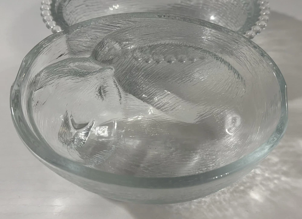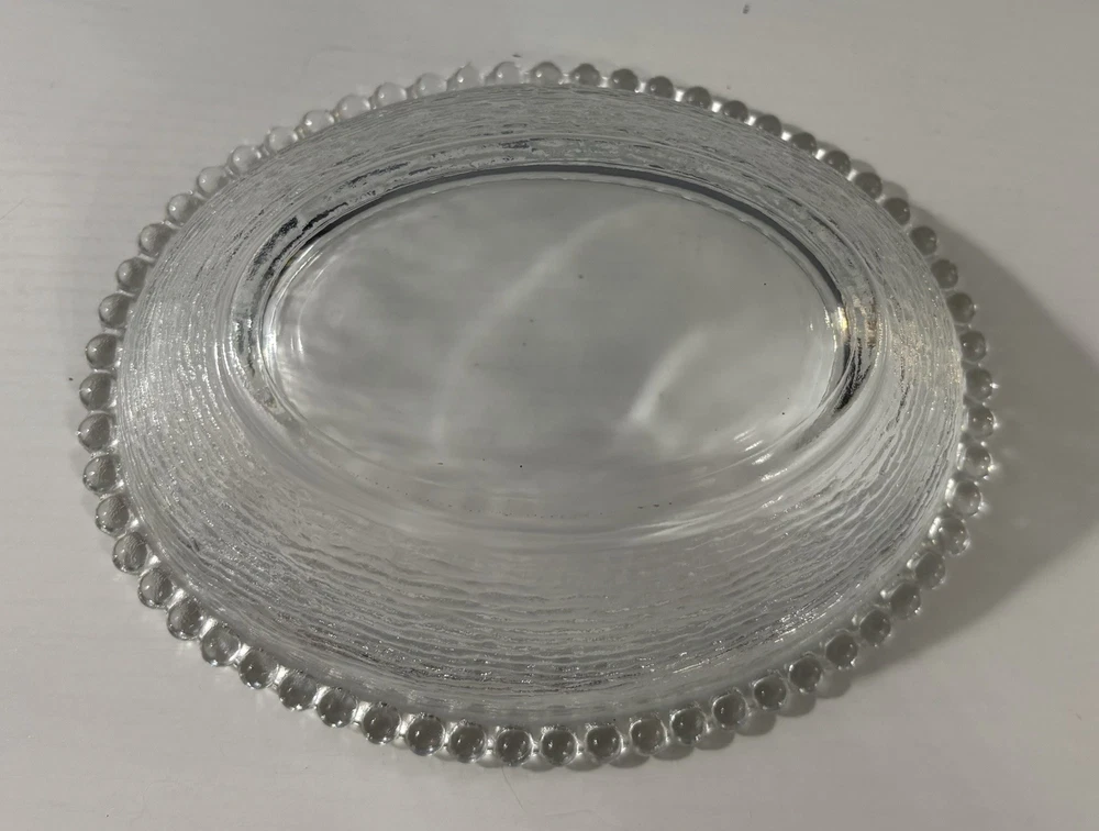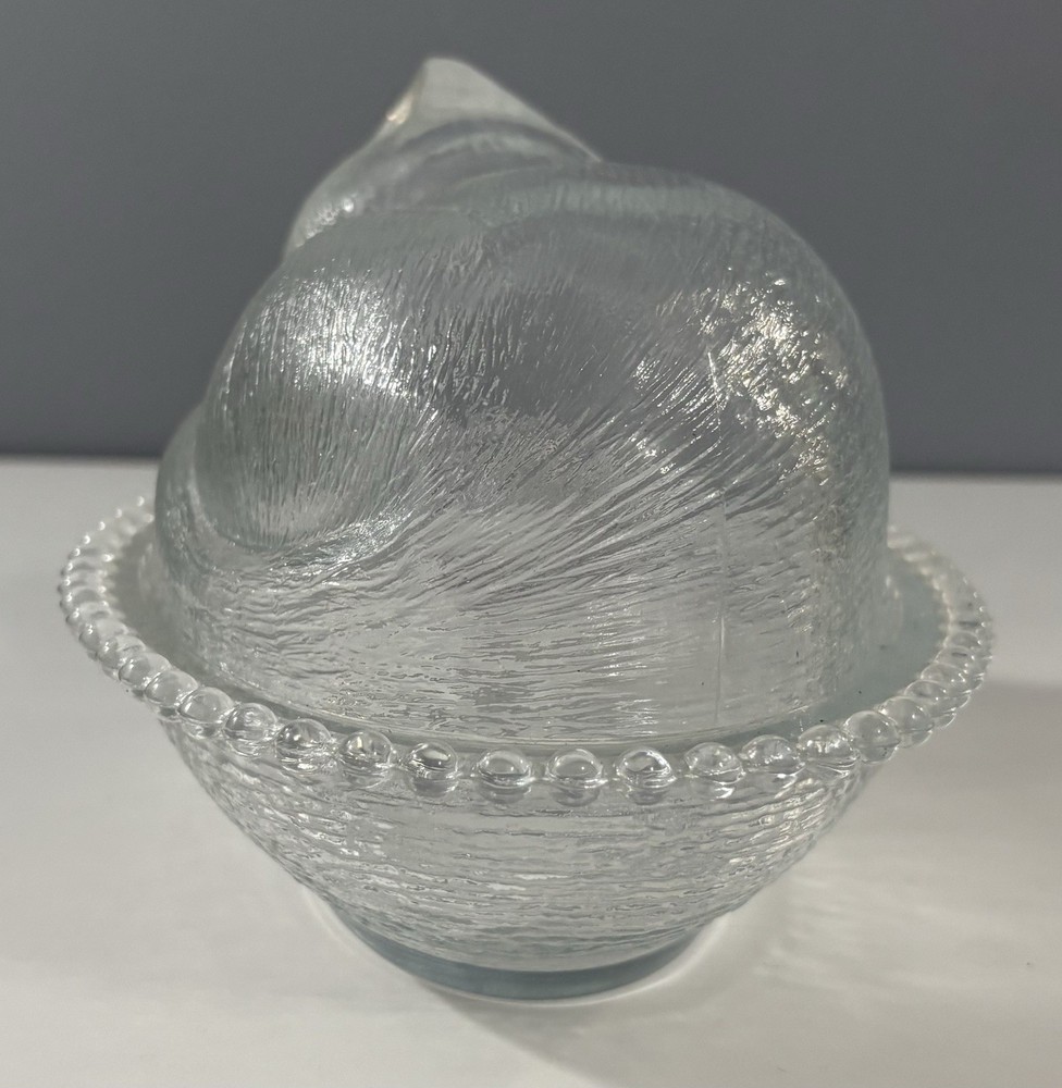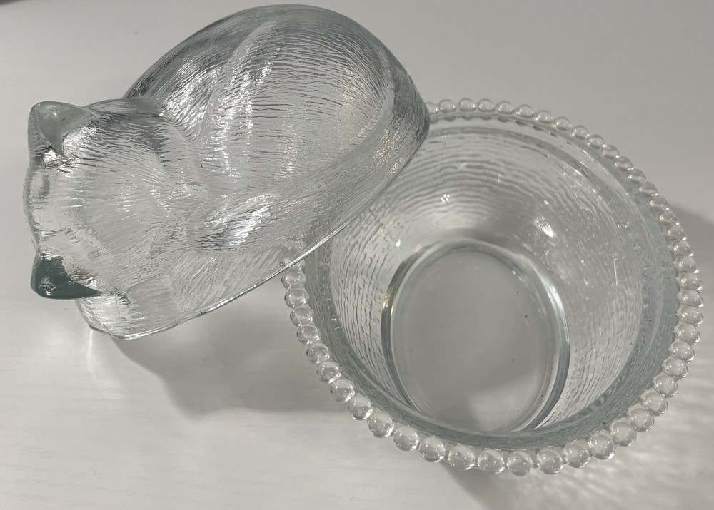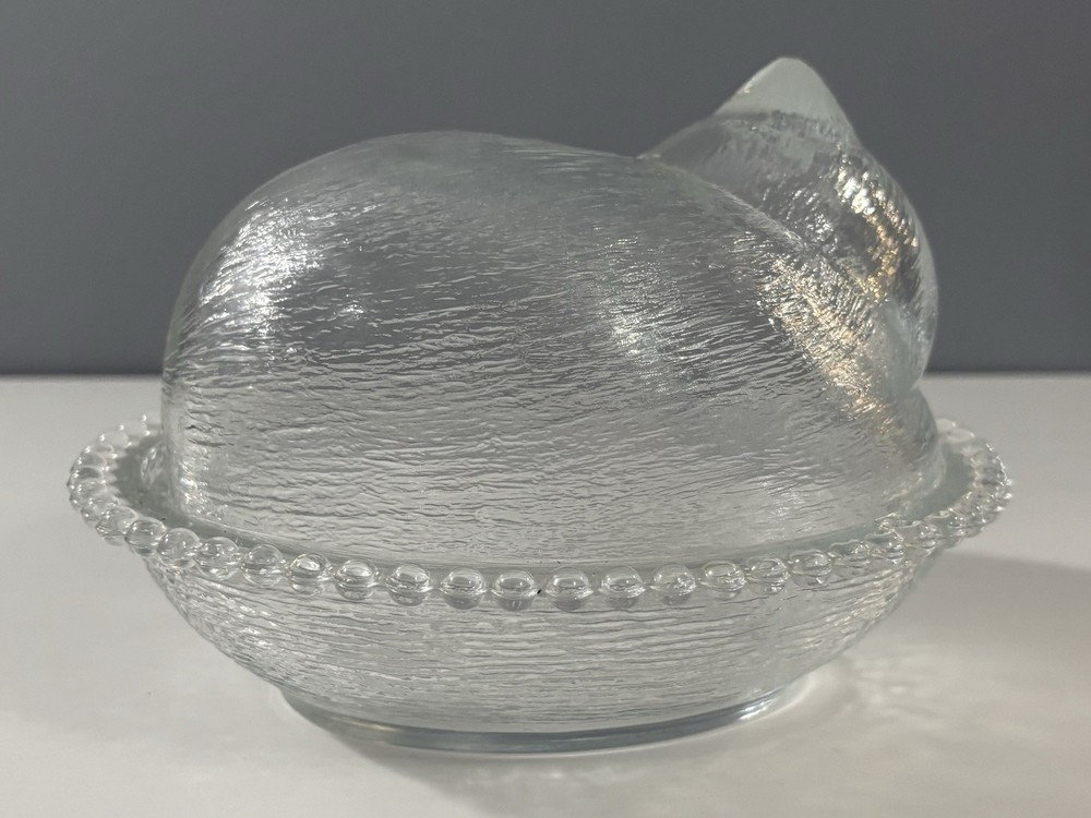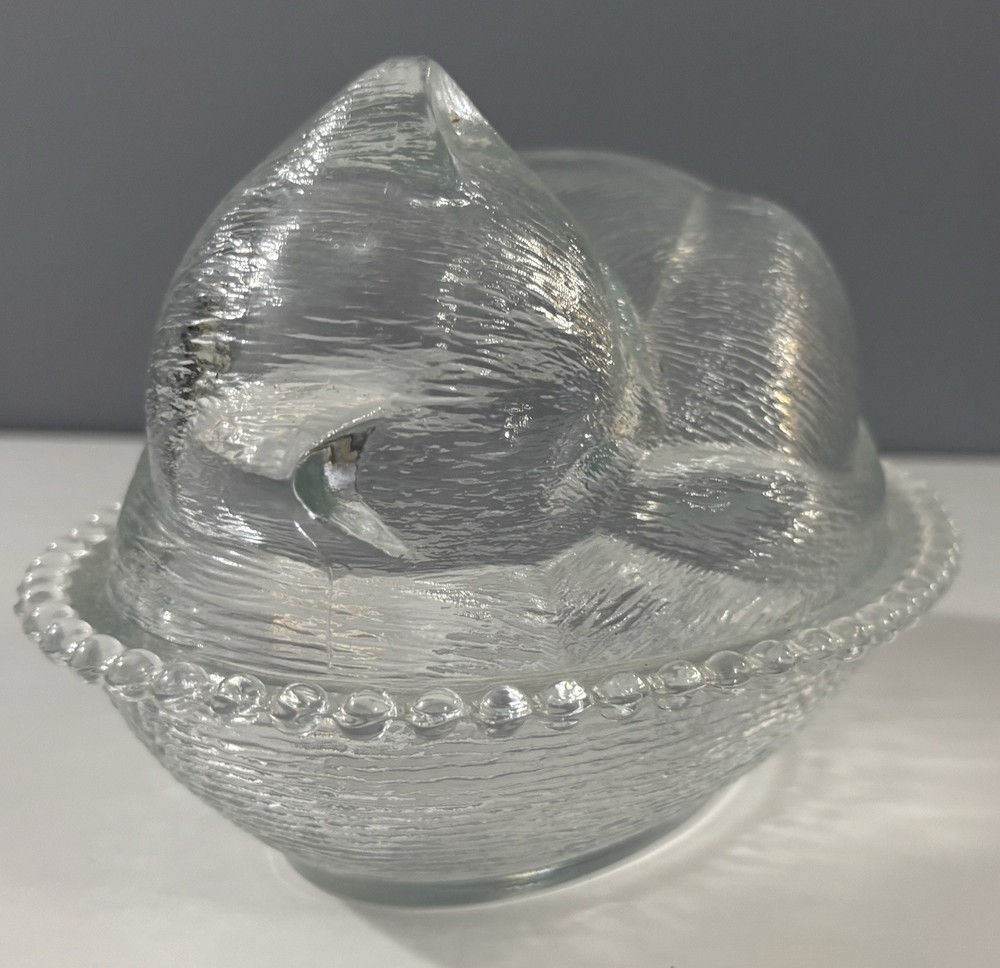 Add a touch of vintage charm to your home decor with this beautiful Indiana Glass sleeping cat candy dish. The oval-shaped dish measures 7 inches and features a beaded edge pattern with a clear glass lid, making it a perfect addition to any collection of decorative cookware, dinnerware, and serveware. The dish is made of pressed glass and was produced in the United States, making it a high-quality and authentic piece. Not chips or cracks. Please review all pictures carefully. Thanks for looking!