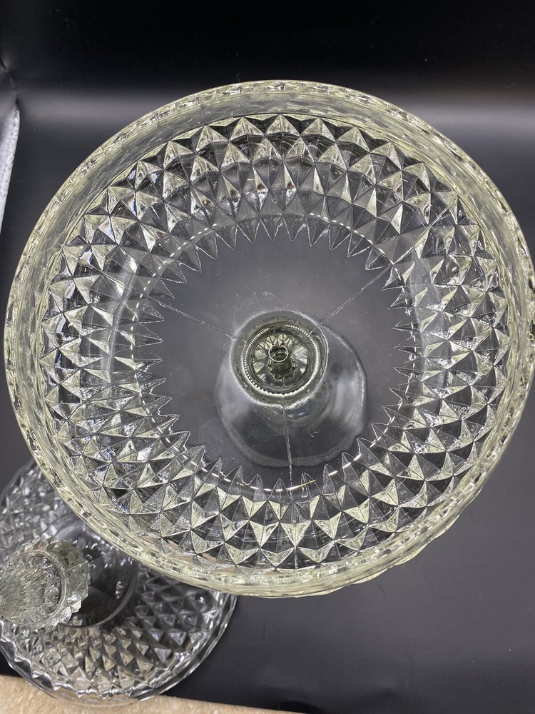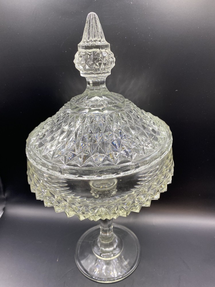 This vintage compote is a stunning piece that will add elegance to any occasion. Made by Indiana Glass, this cut glass crystal compote features a diamond point pattern and comes with a lid. The clear glass material gives it a timeless appeal, while the contemporary style makes it suitable for all occasions. The compote is 12'' tall and 6 1/2'' wide, with a weight of 3lb 2oz. It is recommended to hand wash only, and is perfect for decorative purposes. This antique item is a vintage original, and is ideal for collectors and enthusiasts alike.