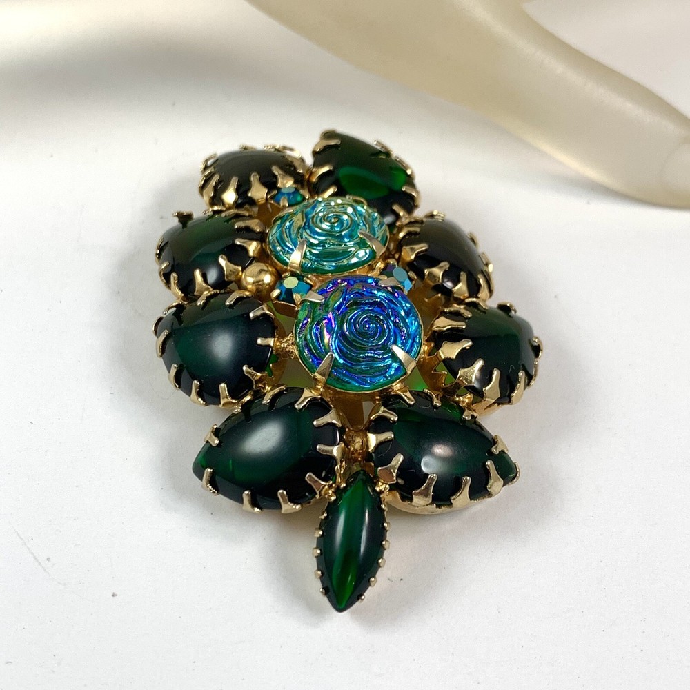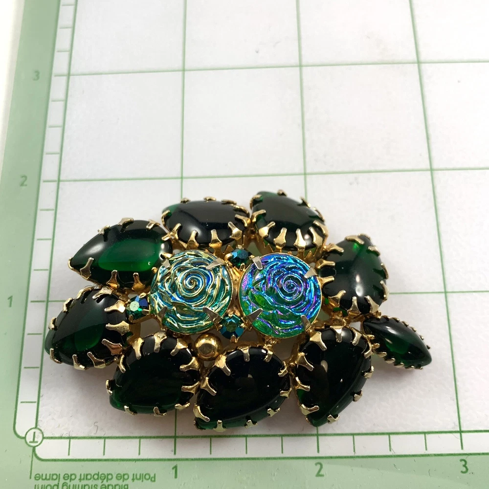 Stunning Vintage Green Glass Cabochons Iridescent Rosettes Gold Tone Brooch. Pre-Owned Estate Jewelry in Very Good Condition. Ready to wear, give as gift or add to a collection. Our Vintage items are mostly from estate sales and vary in age from 100+ years old to more modern pieces. Please use your judgement. Items are photographed on a measuring matte with one-inch squares to give you an idea of size. Any photography props / holders you see are not included.