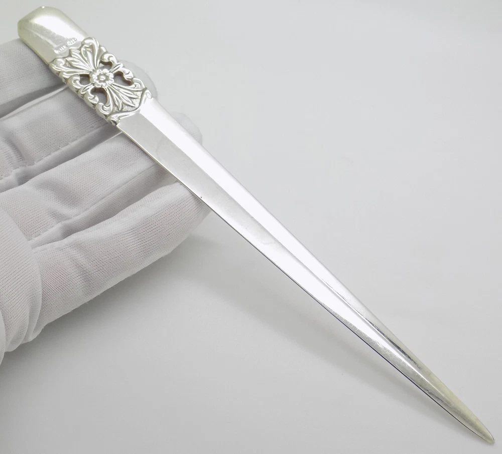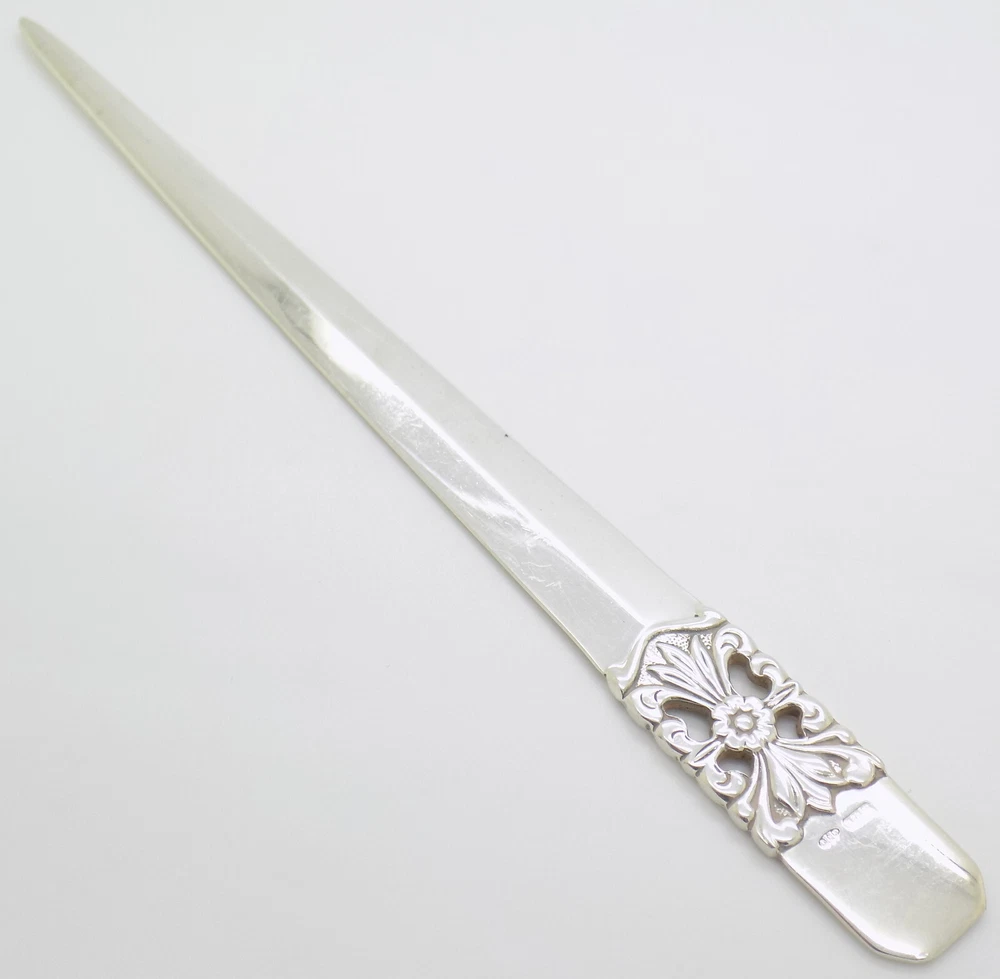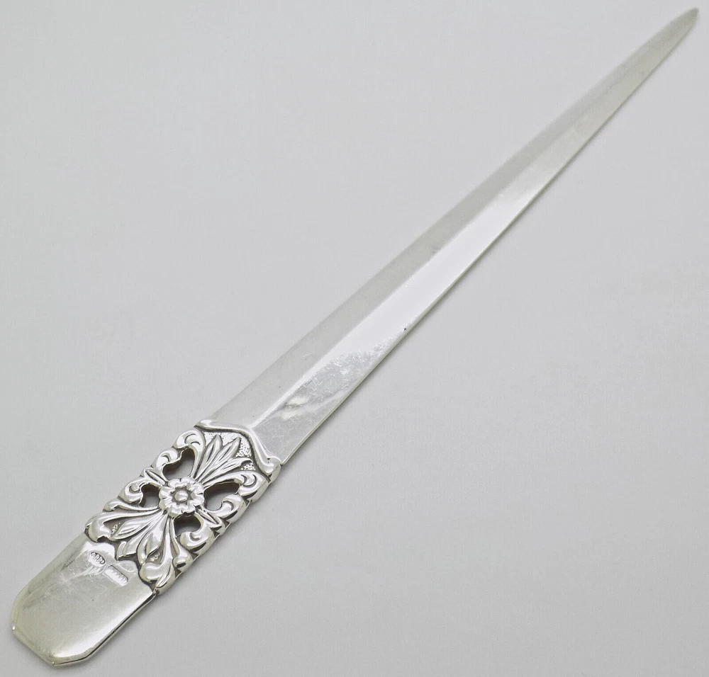 π Vintage Italian Handmade Genuine Silver Angini Violin Figurine π Crafted in the 1980s/1990s , this exquisite violin figurine is a stunning example of Italian silversmithing, made by the prestigious Angini silversmith in Arezzo (AR, Tuscany, Italy) . Hallmarked 800 , signifying Continental Silver (800/000) , and featuring the Brand Logo/Name , this piece reflects both authenticity and the highest level of craftsmanship. Weighing 0.936 ounces (26.54 grams) or 0.85 troy ounces , this figurine captures the elegance and beauty of a classic violin in a miniature form. Perfect for collectors of fine silver or music lovers, this piece is a rare and distinguished find, never before featured on Vintage Silver Boutique . Dimensions: Please refer to the images provided for size details. Material: Hallmarked 800 for Continental Silver (800/000) , with the Brand Logo/Name Origin: Made in Arezzo (AR, Tuscany, Italy) by Angini silversmith Weight: 0.936 ounces (26.54 grams); 0.85 troy ounces Vintage Silver Boutique USA #ItalianSilver #ViolinFigurine #AnginiSilversmith #GenuineSilver #VSB #ArezzoCraftsmanship #SilverCollectibles #VintageSilverBoutique #MusicLovers #80sStyle #90sDesign #UniqueDecor #TuscanArtistry #SilverMiniatures π Vintage Italian Handmade Silver Long Decorative Letter Opener π Crafted in the 1970s/1980s , this long decorative letter opener is made from Continental Silver (800/000) and bears the Italian Silversmith Code traces, ensuring its authenticity. This sleek and finely detailed piece is both functional and decorative, making it a perfect addition to any desk or collection of vintage silverware. Weighing 1.34 ounces (37.99 grams) or 1.22 troy ounces , this letter opener offers a blend of utility and refined craftsmanship typical of Italian silversmiths. Dimensions: Please refer to the images for precise measurements. Material: Hallmarked 800 for Continental Silver , with Italian Silversmith Code traces . Origin: Handmade in Italy , circa 1970s/1980s . Weight: 1.34 oz (37.99 g); 1.22 t-oz . #ItalianSilver #LetterOpener #HandmadeSilver #DecorativeSilver #VintageSilverBoutique #ContinentalSilver #ItalianCraftsmanship #SilverCollectible