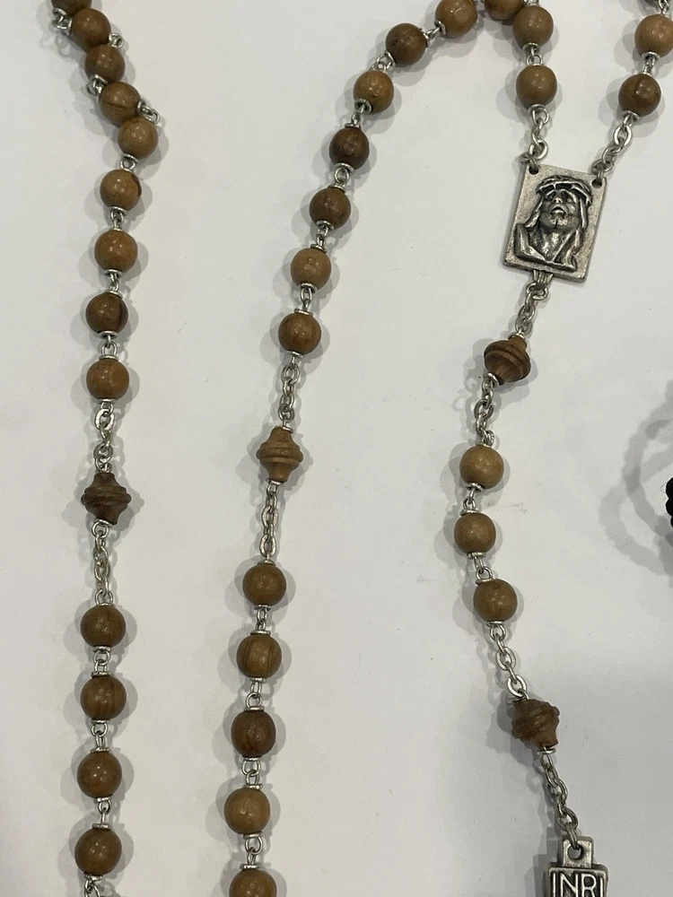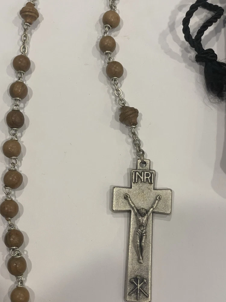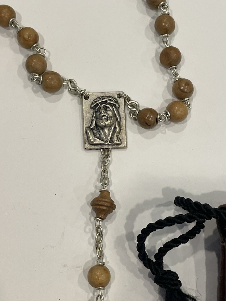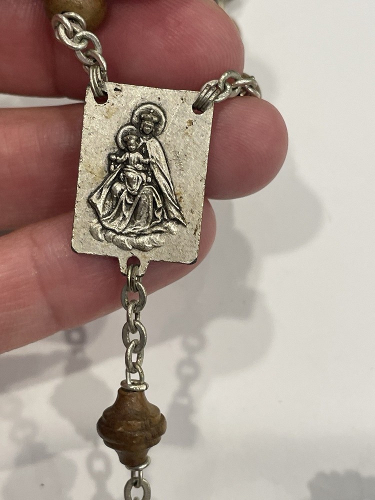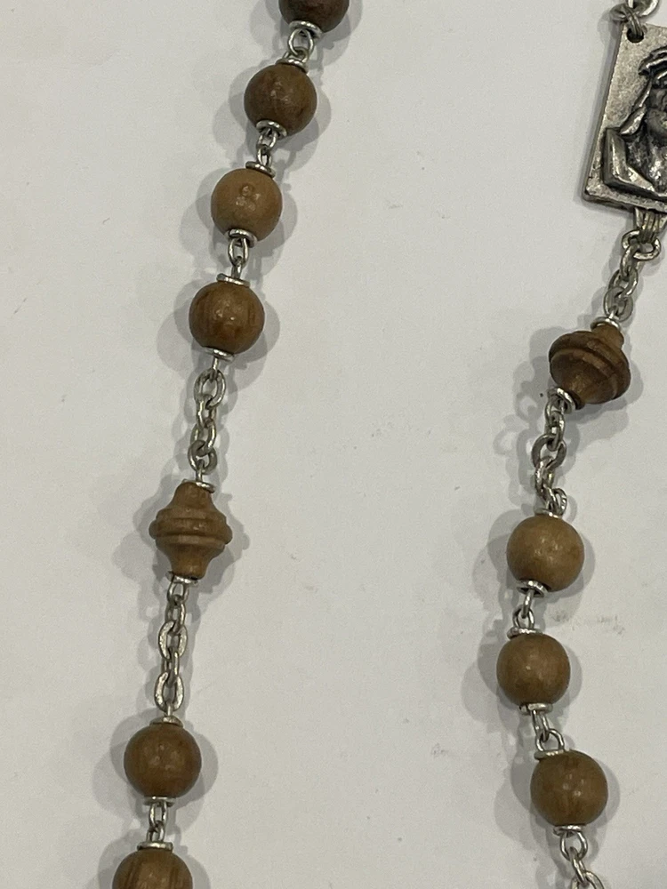 The product is a vintage wooden beaded rosary made in Italy, accompanied by a soft brown bag. This religious item is crafted from wood and embodies the tradition and craftsmanship of Italy. Perfect for collectors or those seeking a piece of Christian spirituality to add to their collection, this rosary exudes a sense of history and reverence. Sold as shown in photos.