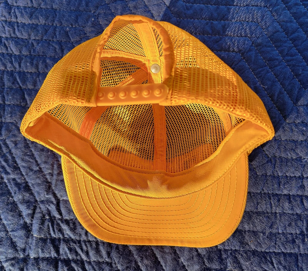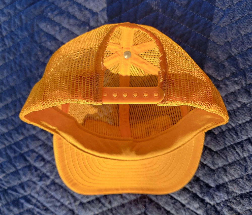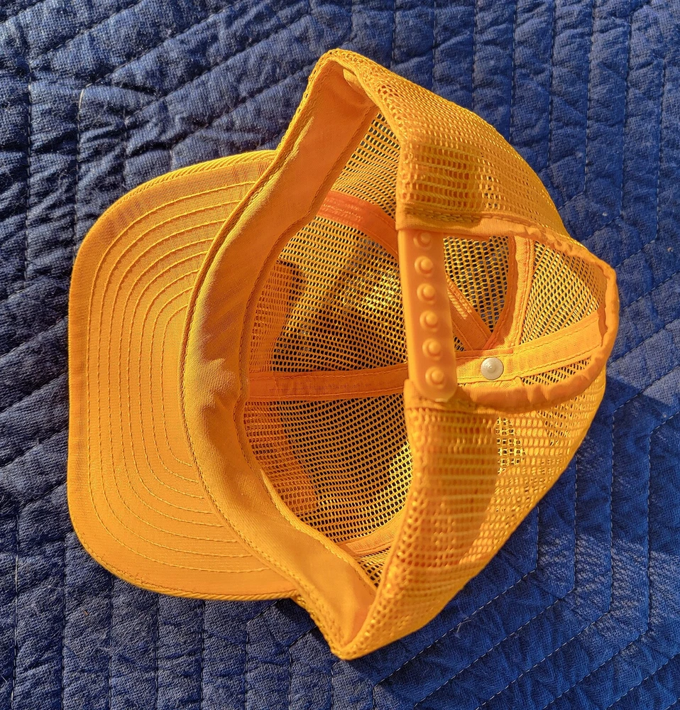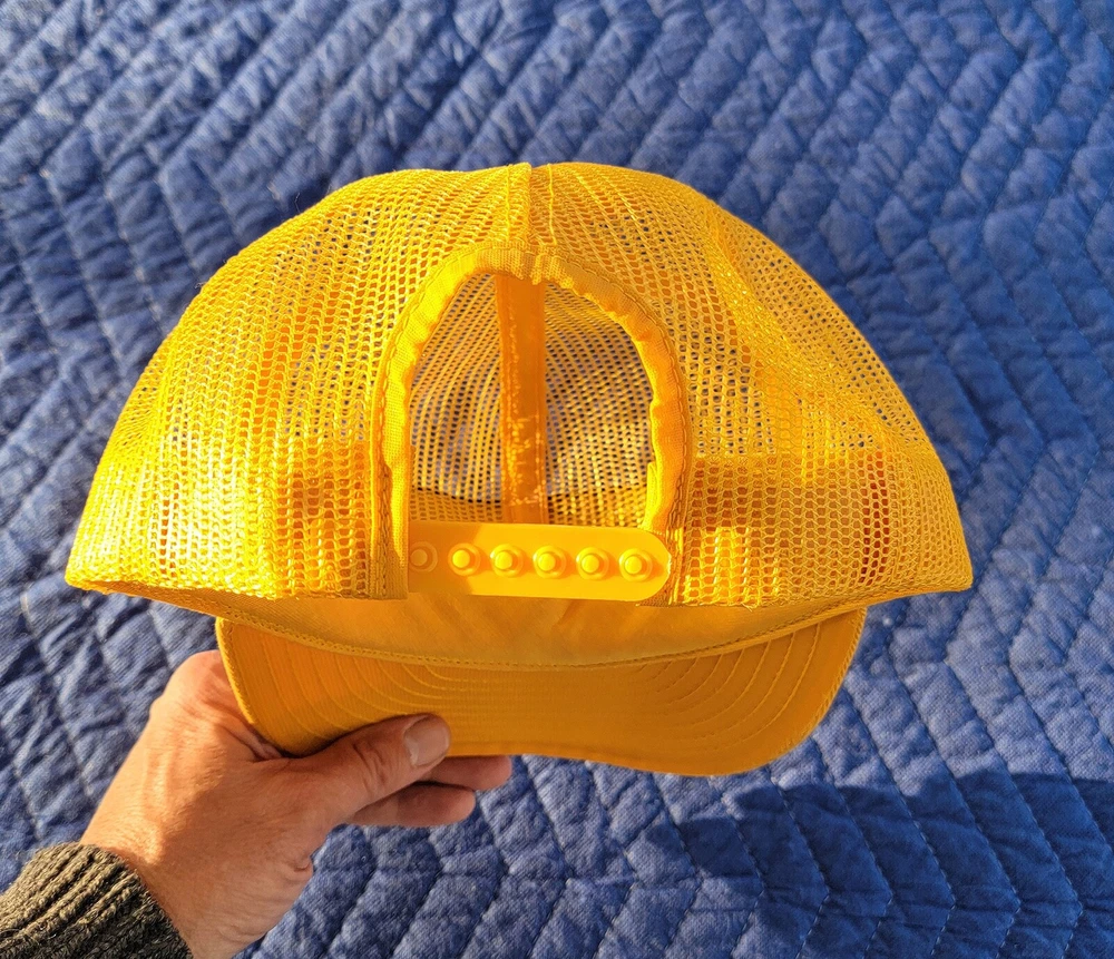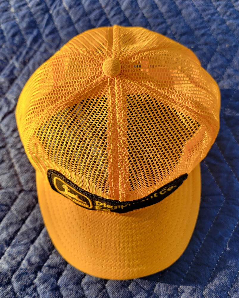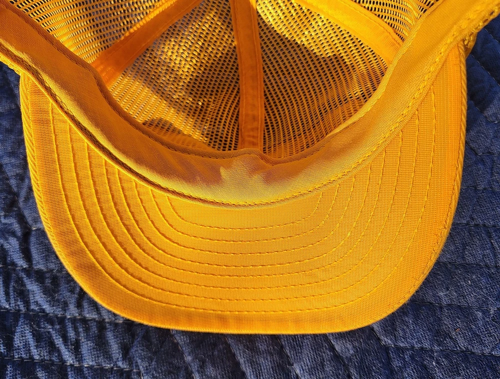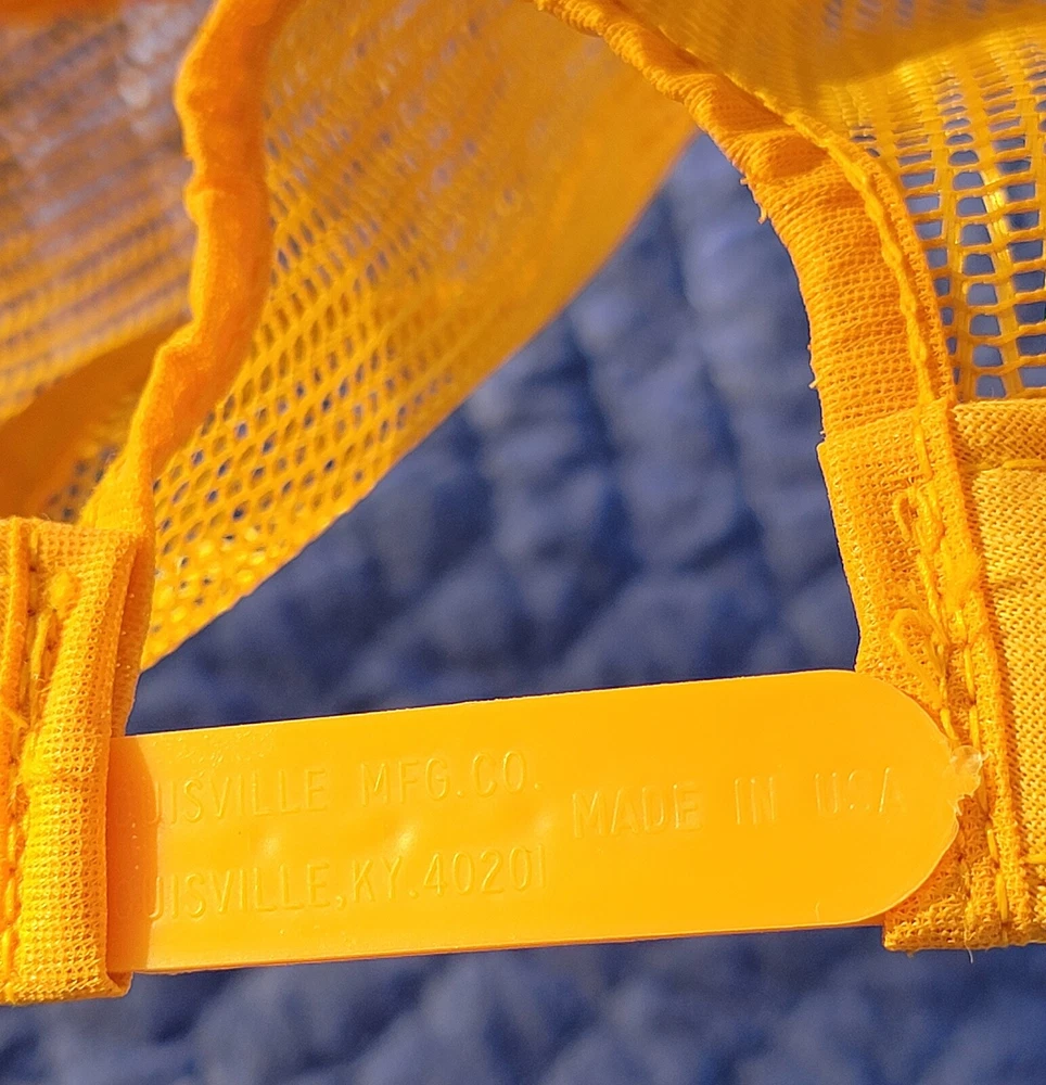 Vintage JOHN DEERE DIESEL POWER EQUIPMENT Snap Back Trucker Hat-Unworn DIMENSIONS: Marked size: not marked for size. Adjustable. Total weight: 2.5 ounces. DESCRIPTION: Vintage JOHN DEERE trucker-style hat. By Louisville Mfg. Co., USA. Yellow mesh with yellow fabric bill. Snap back. Black/yellow fabric patch on front: "John Deere Diesel Power Equipment Co." All original. Maker's marks: "Louisville Mfg. Co. - Made in USA - Louisville, KY". Notice that no foam was used in the construction of this hat. CONDITION: This hat is in excellent "as new" original condition. No damage or wear. I see no evidence this hat was ever worn. No tears, pulls, snags, creases. Snap back is in excellent condition with no splits, cracks, breaks, losses. Very clean as found. No pet, cigarette or other unpleasant odors. No stains, discolorations, fading, soiling.